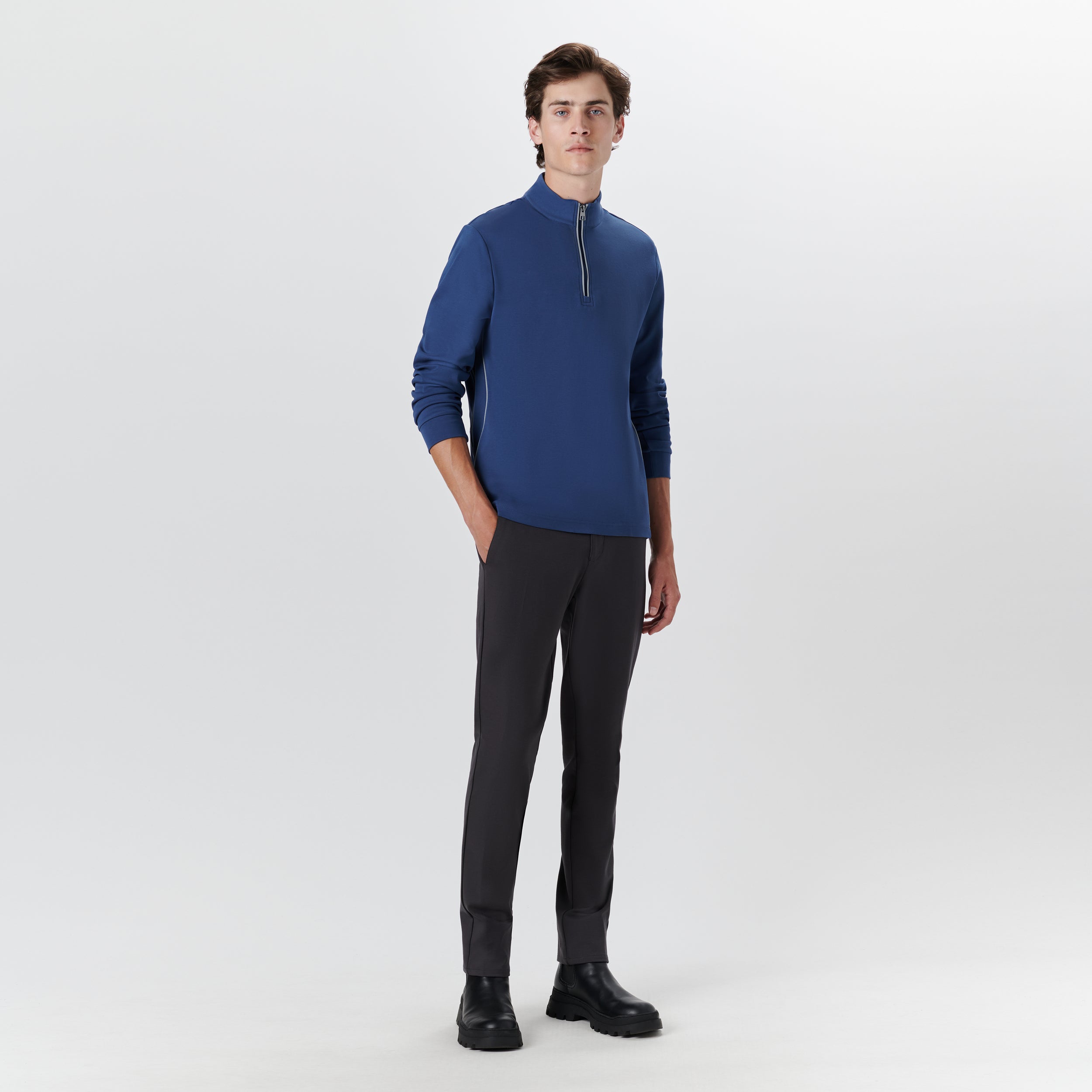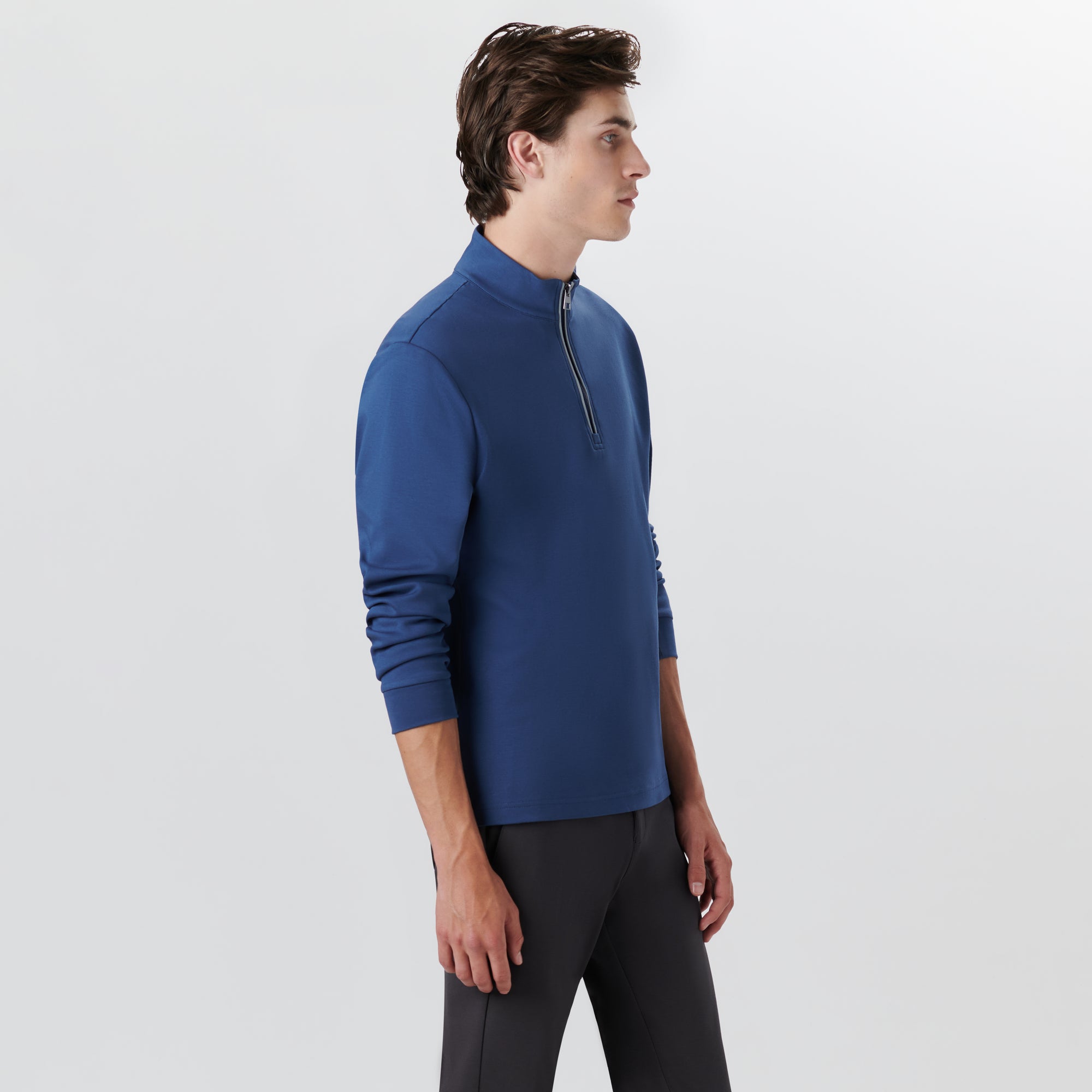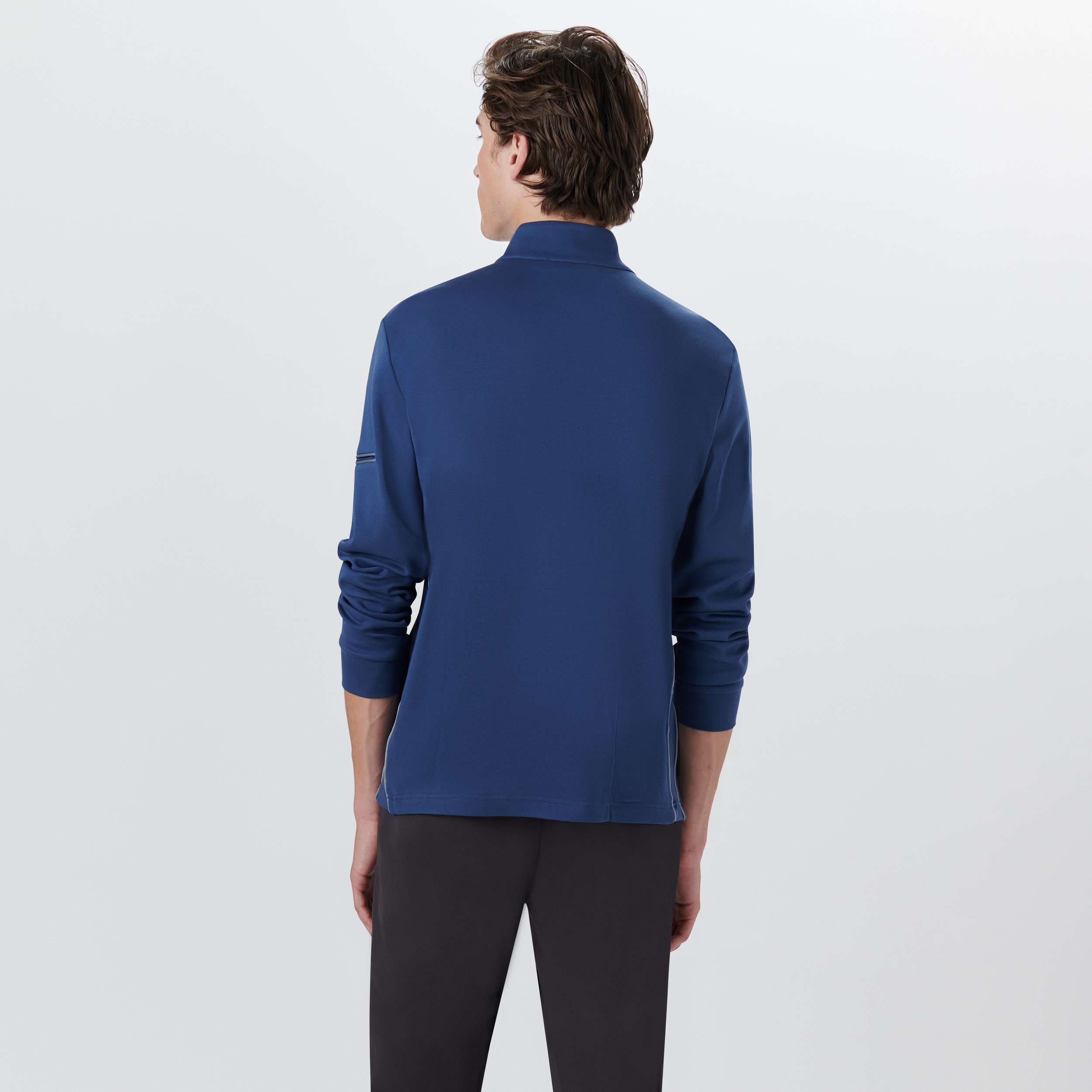 Long sleeve quarter zip pullover in 100% cotton with sleeve pocket and contrast piping detail.