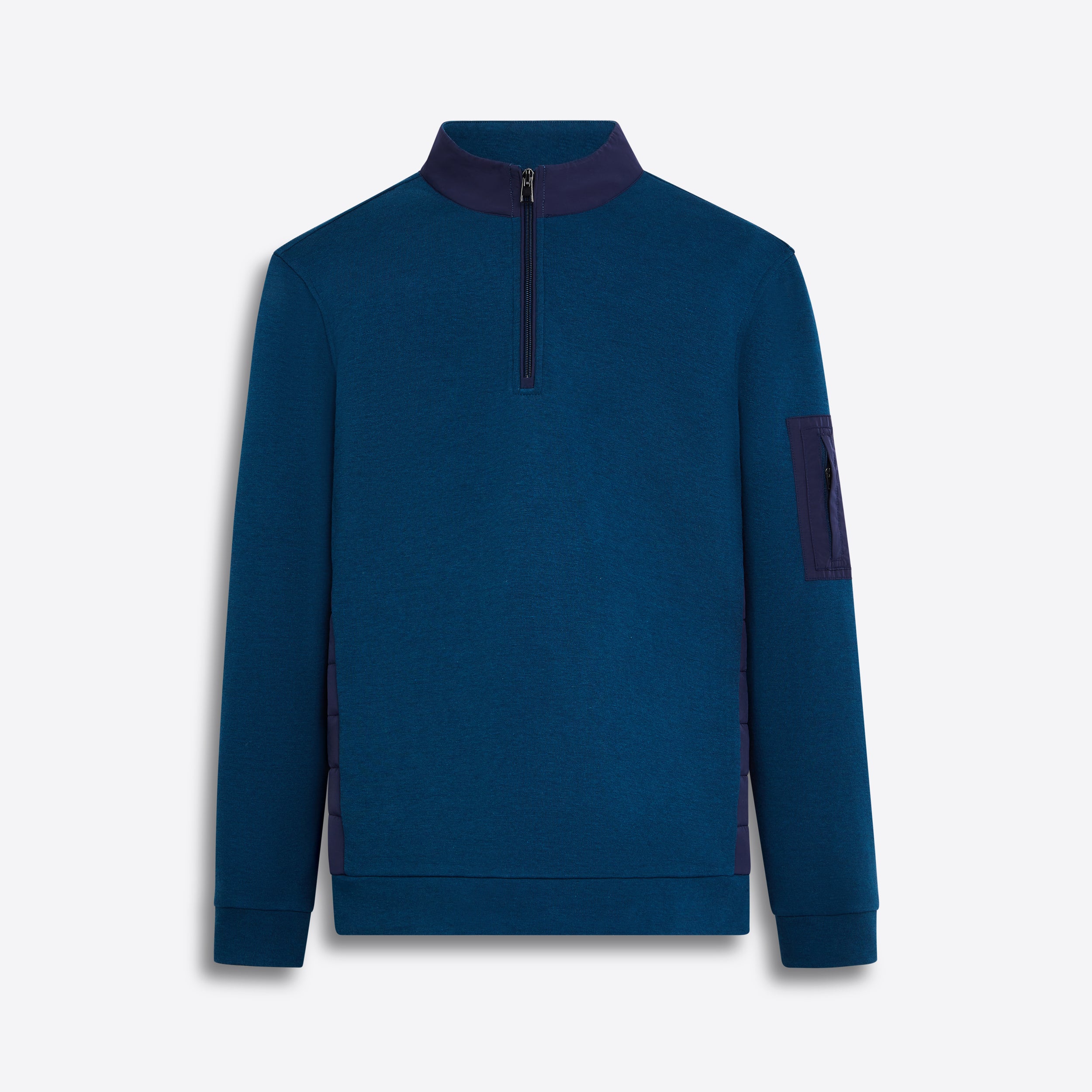 Long sleeve quarter zip pullover in cotton blend with nylon lightly padded collar and quilted side panels, and nylon trimmed zipper placket and side pocket.