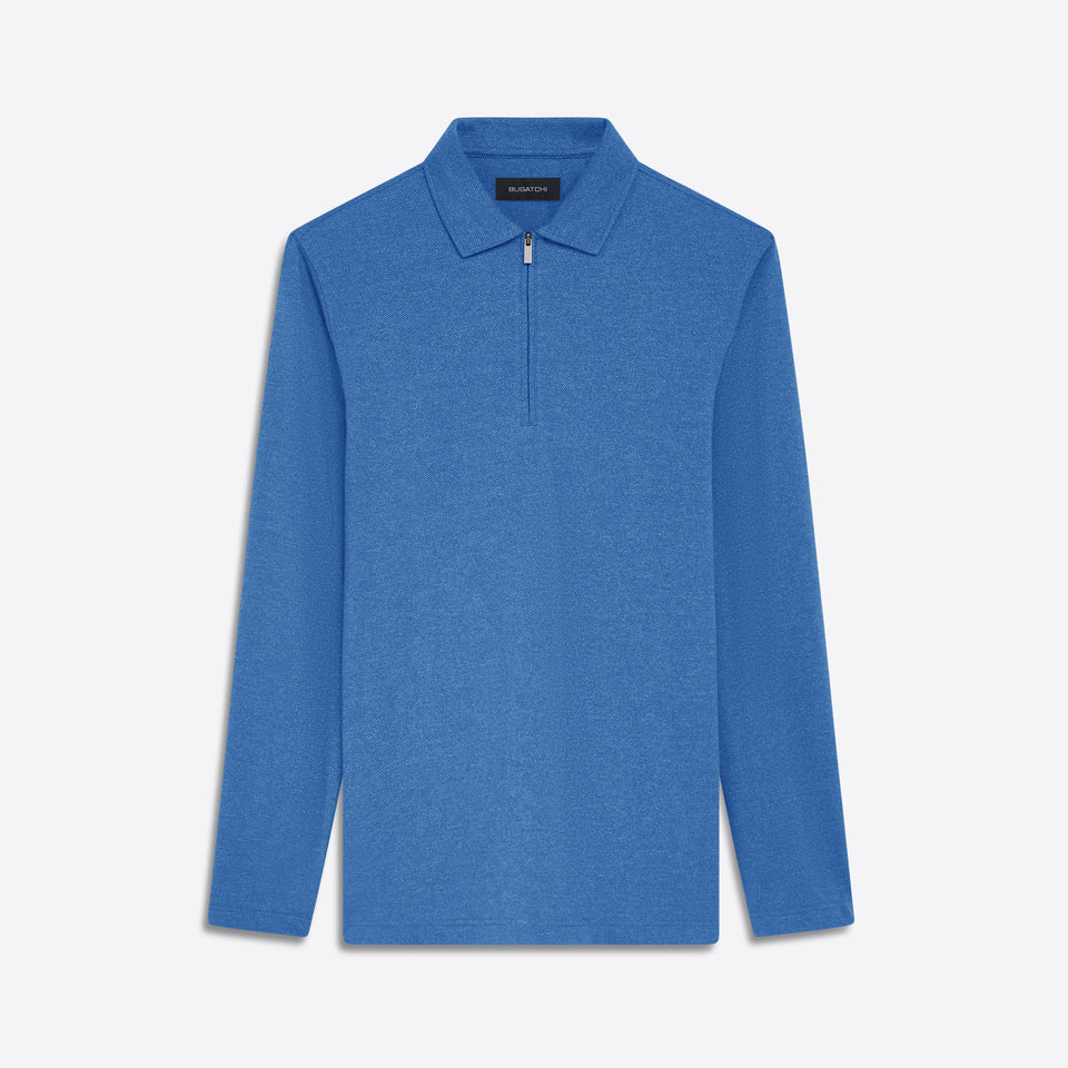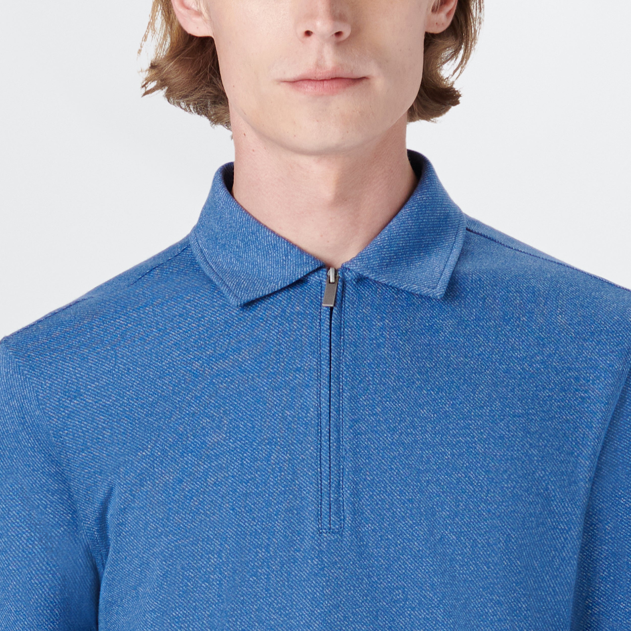 Long sleeve heather polo in 100% cotton with quarter zip closure and self fabric collar.
