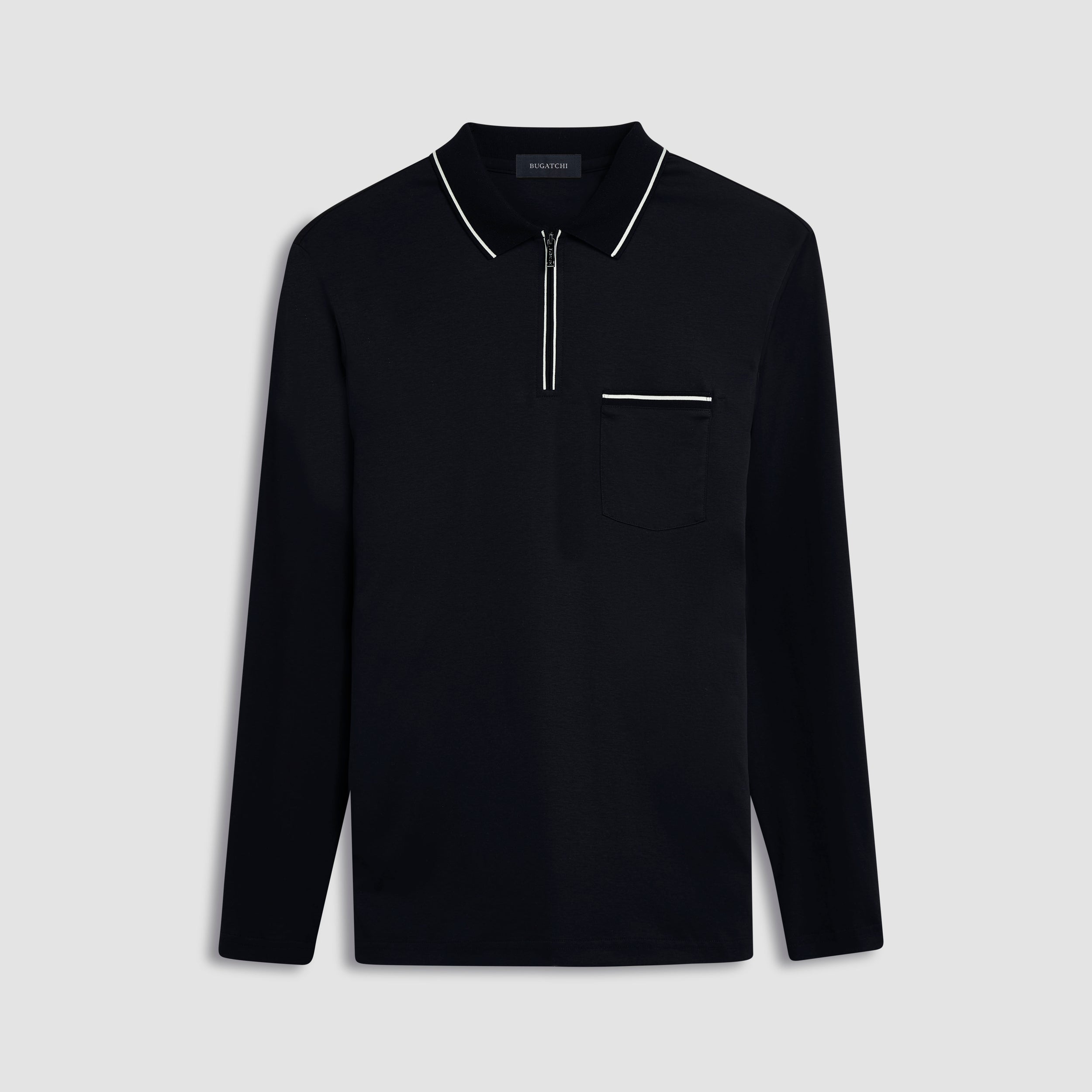 Long-sleeved polo shirt in 100% Pima cotton with quarter zipper closure, contrast trim detail, one chest pocket and a contrast tipped rib knit collar.
