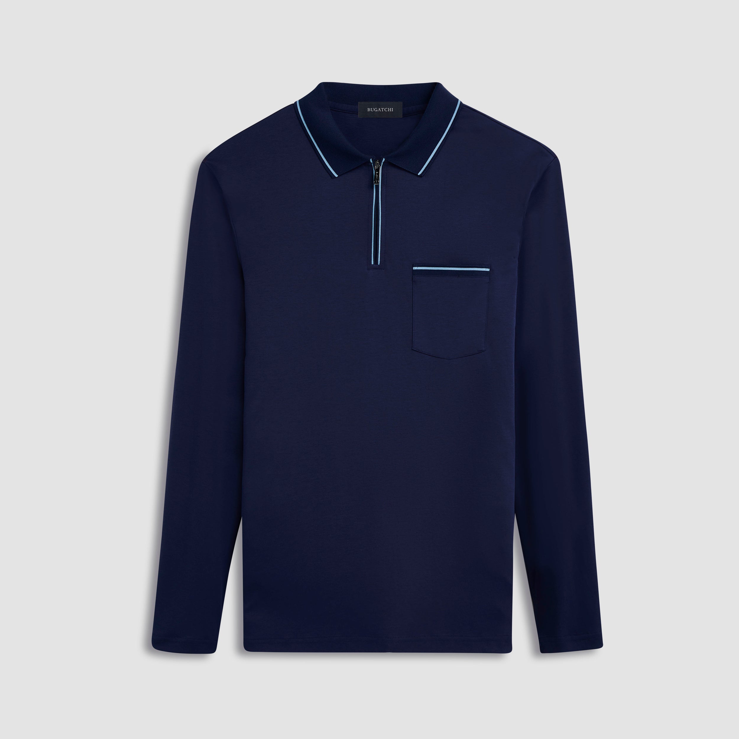 Long-sleeved polo shirt in 100% Pima cotton with quarter zipper closure, contrast trim detail, one chest pocket and a contrast tipped rib knit collar.
