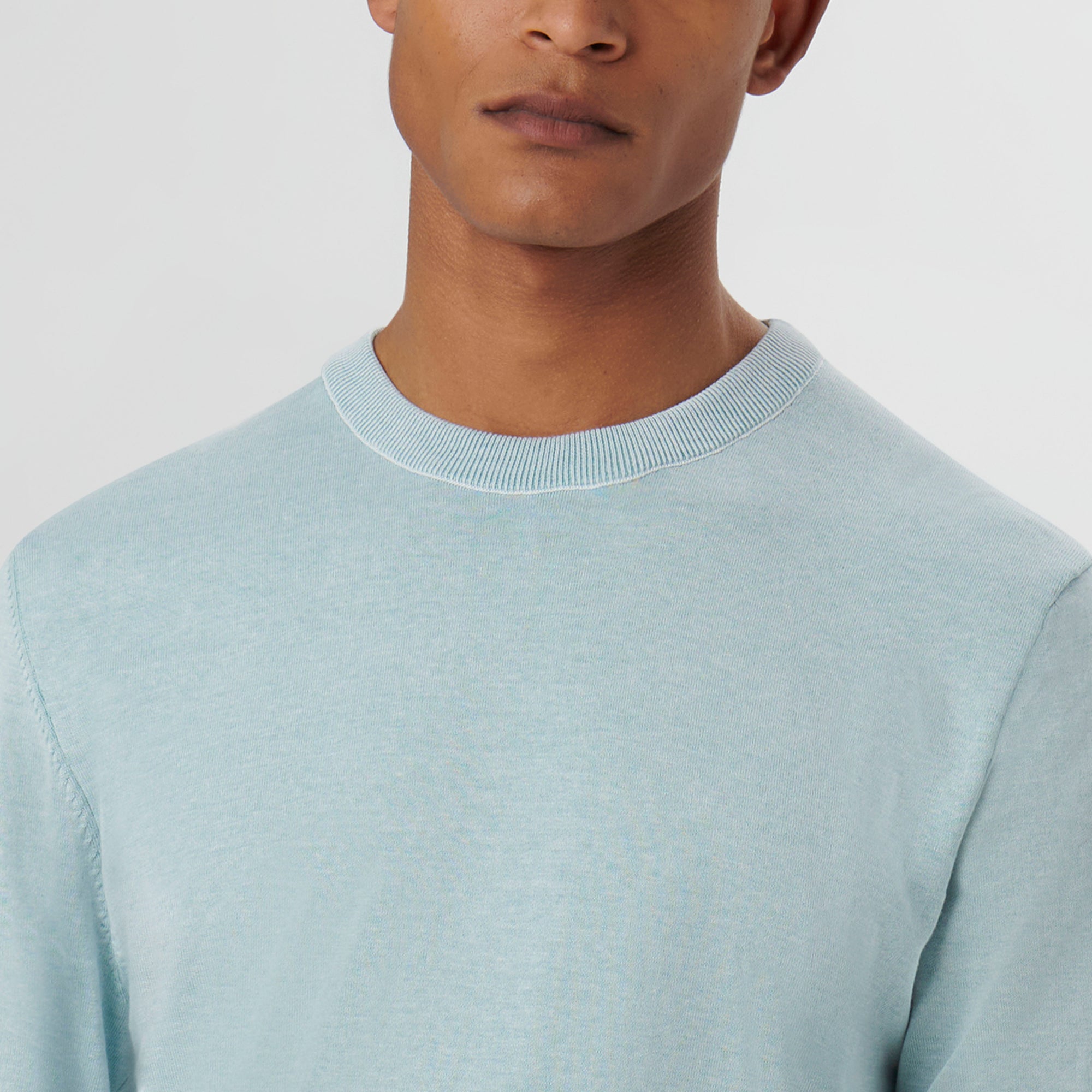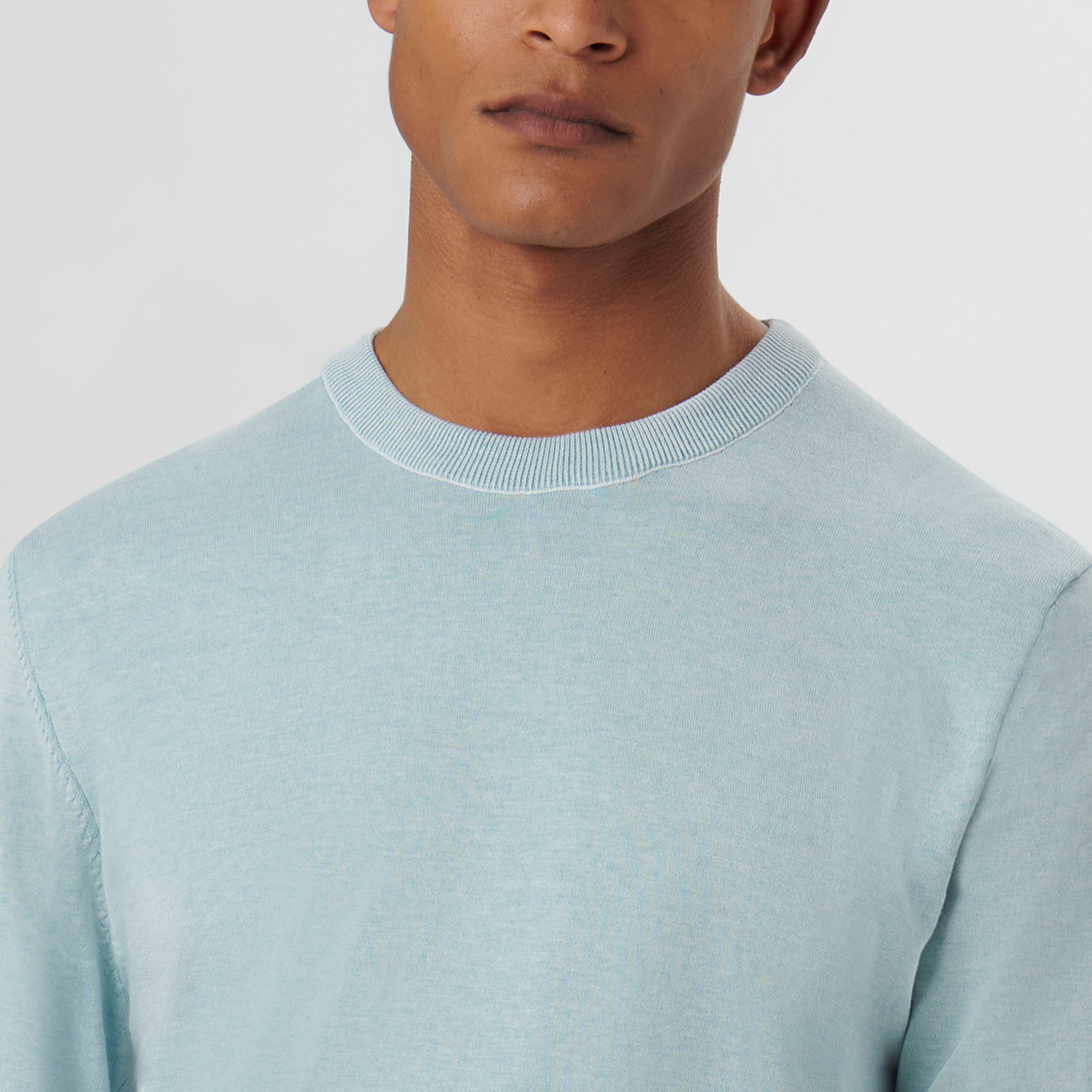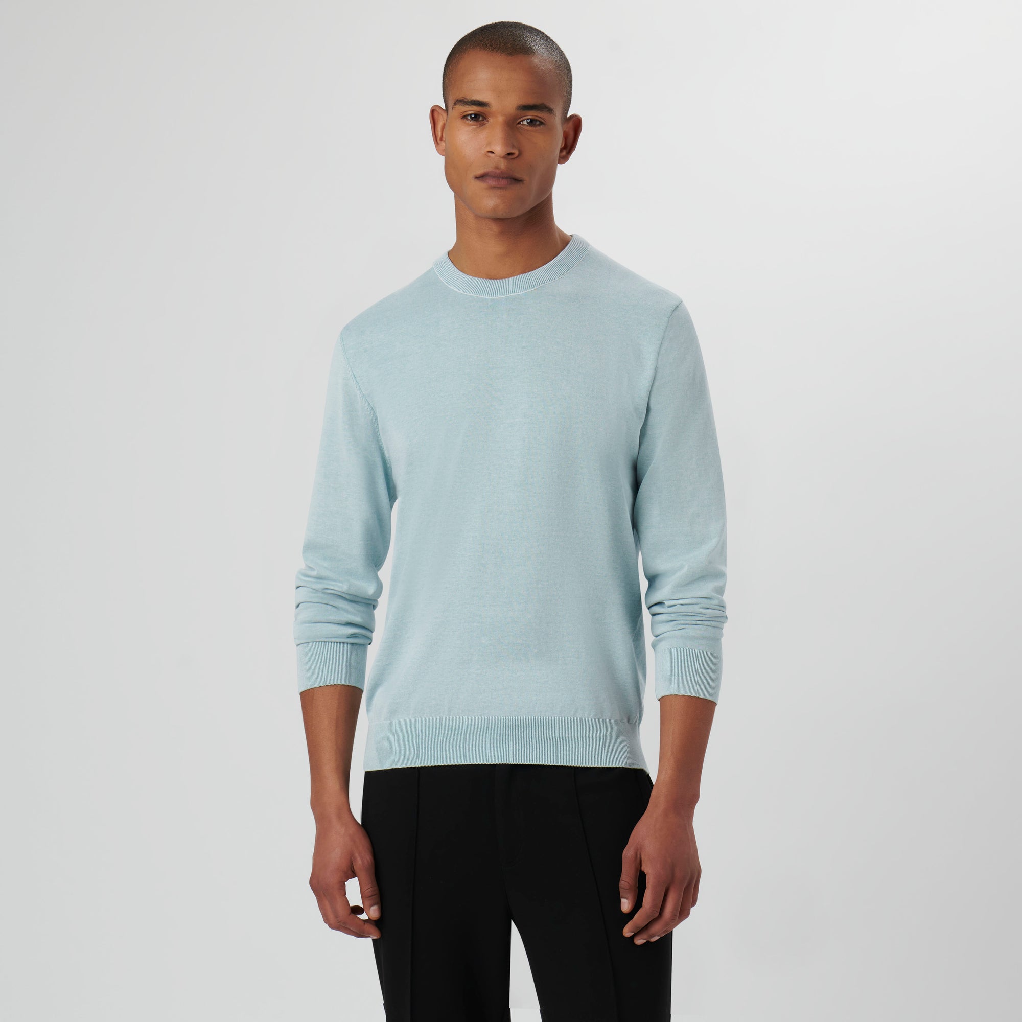 Melange crew neck sweater in 100% cotton with rib knit collar, cuffs and waistband.