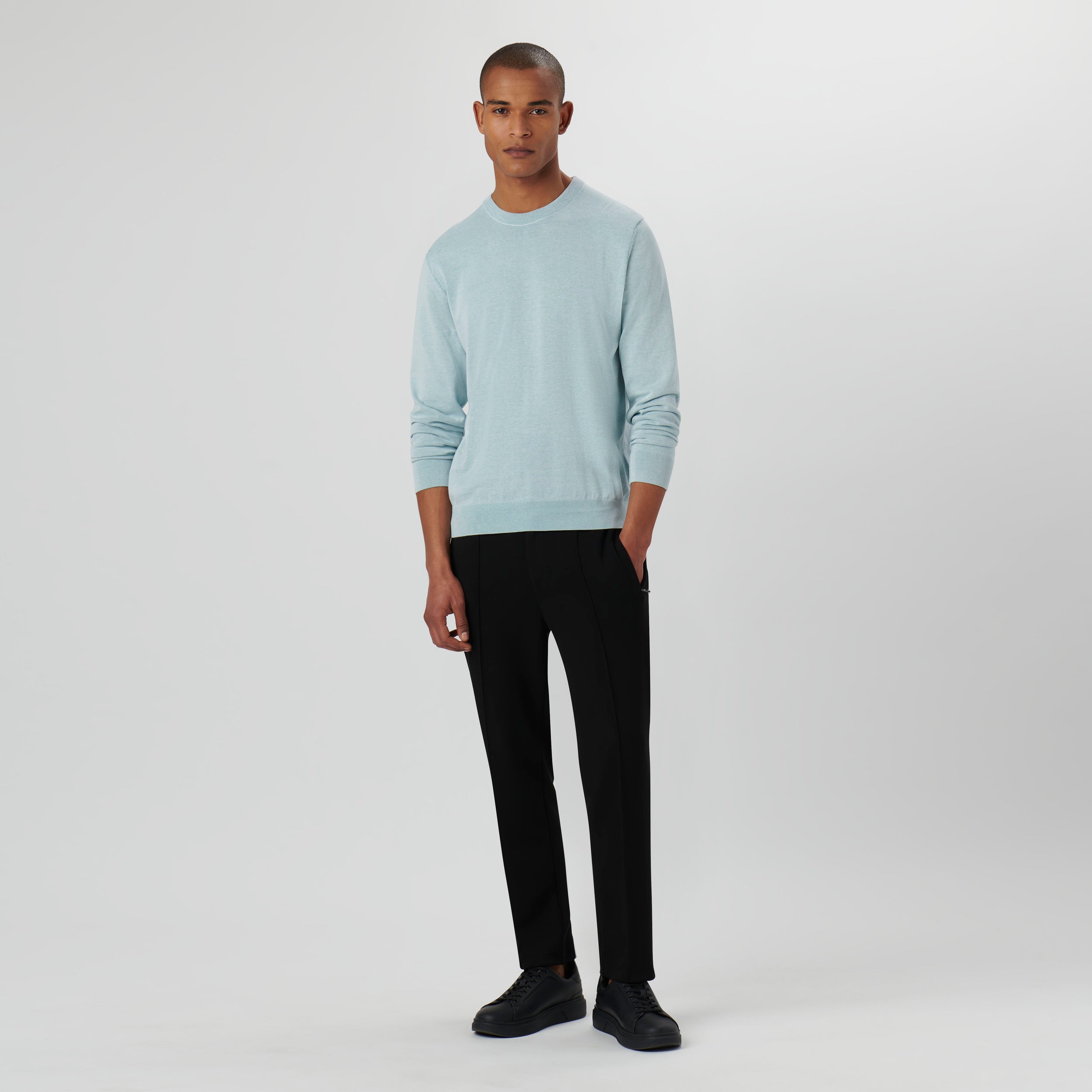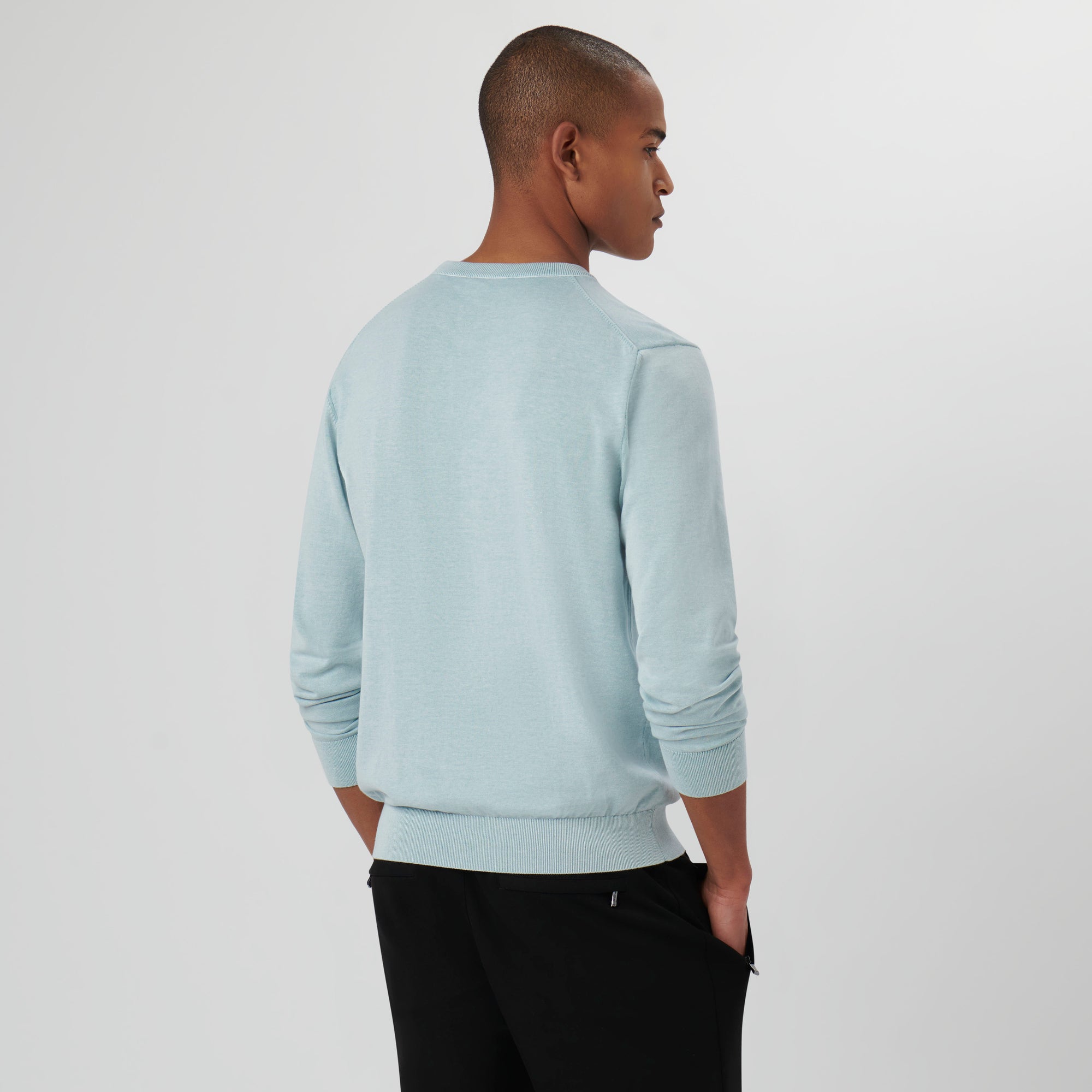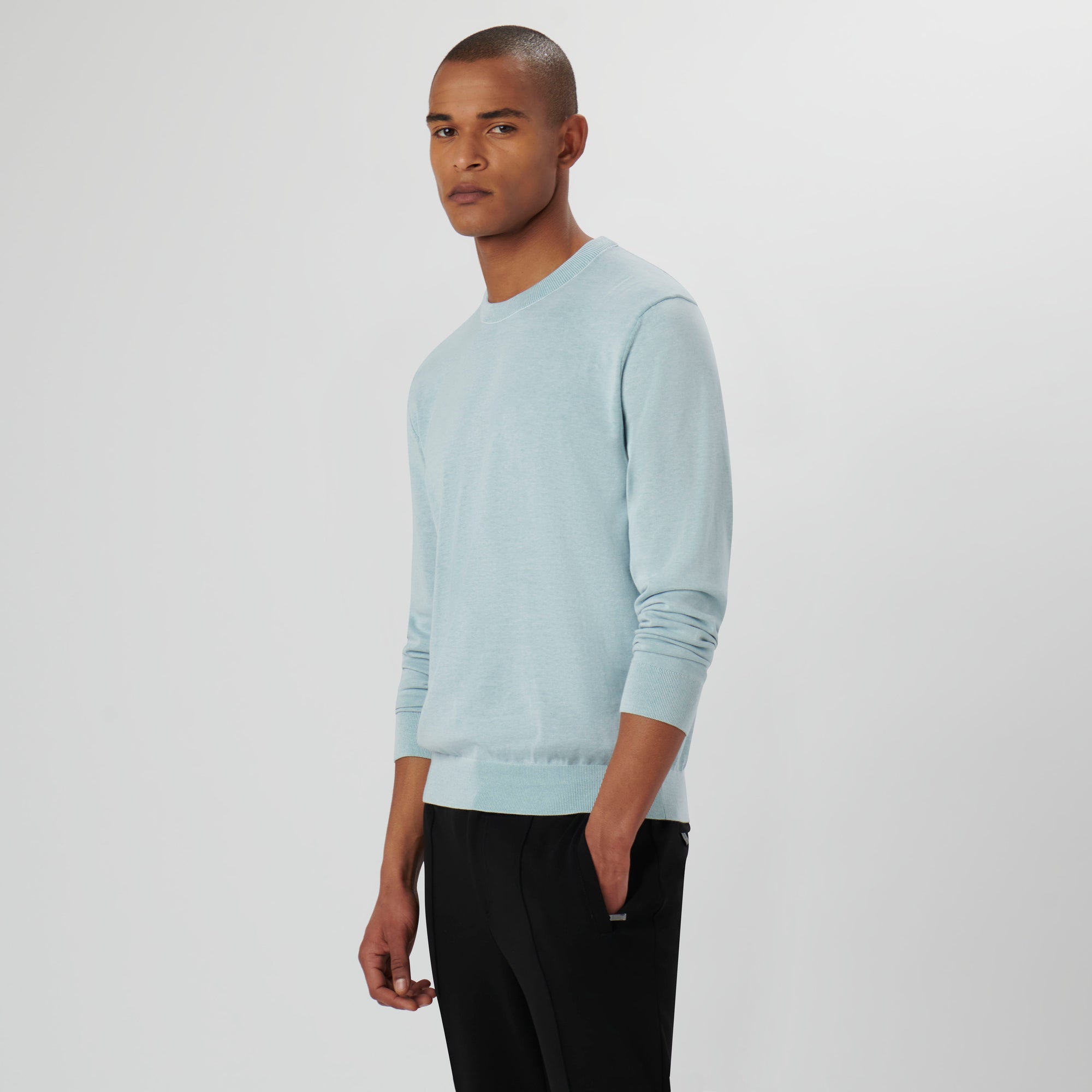 Melange crew neck sweater in 100% cotton with rib knit collar, cuffs and waistband.