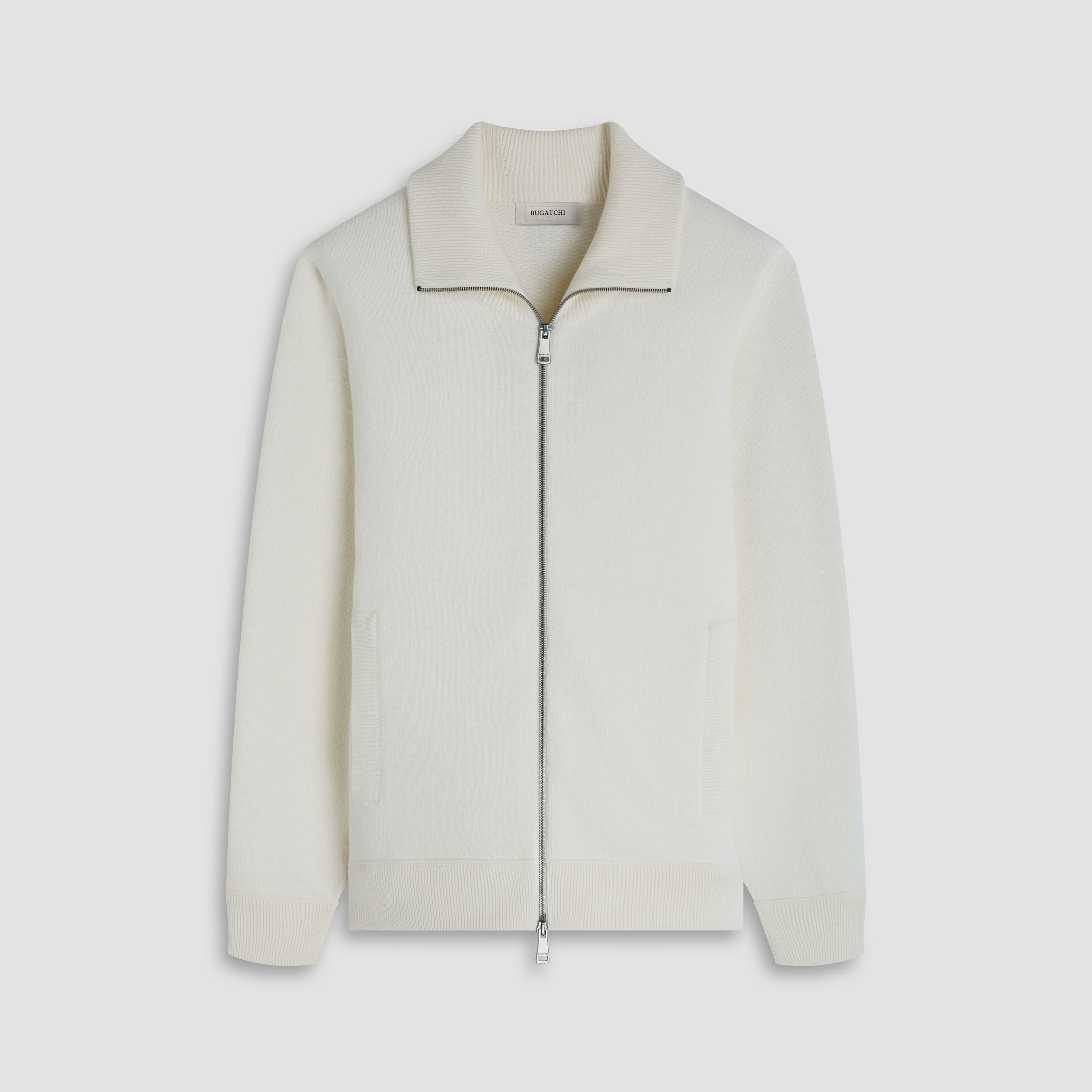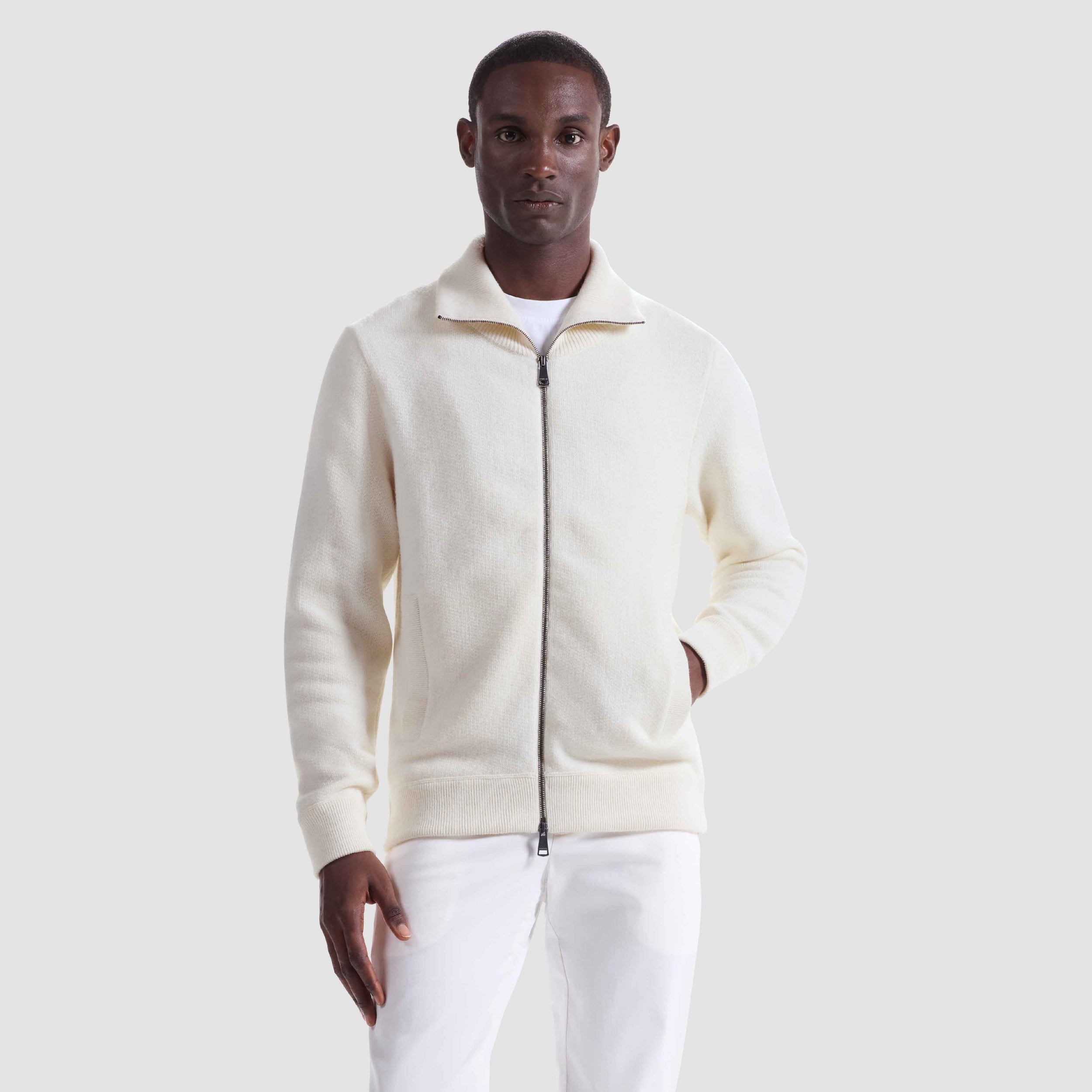 Refined yet versatile, this wool-blend sweater jacket is crafted in a melange herringbone knit for a rich, textured appearance. Designed with a full two-way zipper, it can be worn fully zipped up as a mock neck or folded down for a more relaxed look. The zippered side pockets feature a discreet covered placket, while the ribbed collar, cuffs, and hem provide a polished, structured finish.