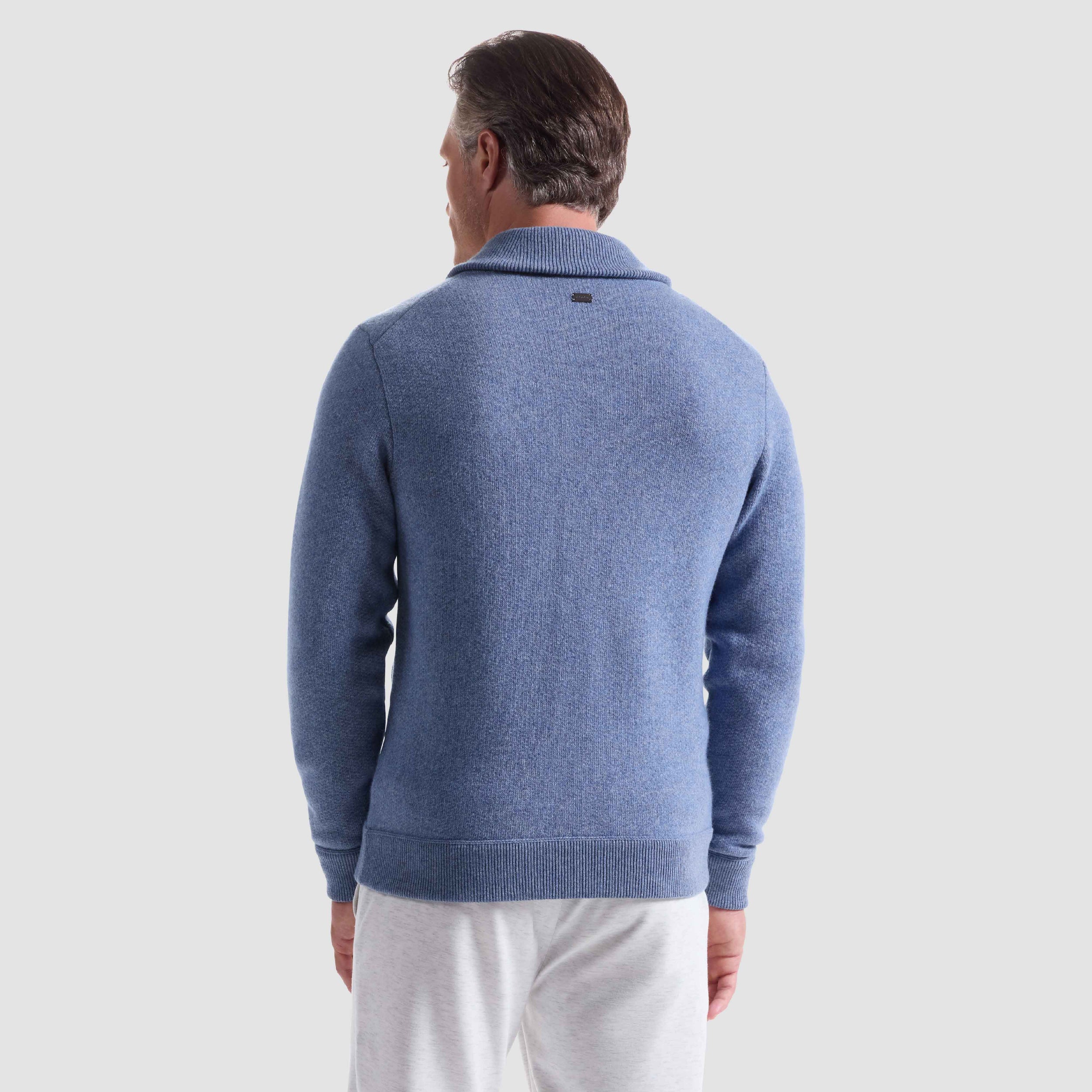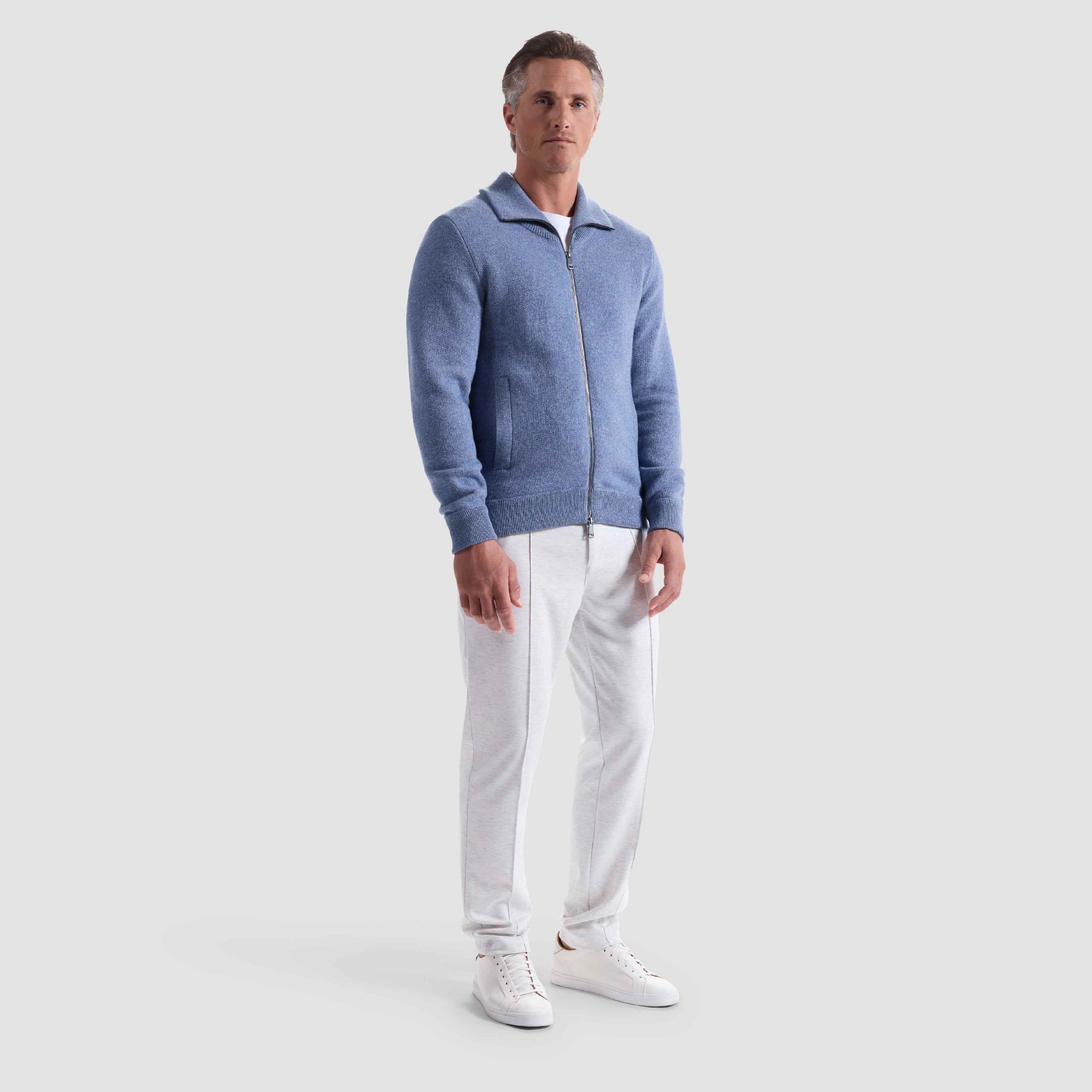 Refined yet versatile, this wool-blend sweater jacket is crafted in a melange herringbone knit for a rich, textured appearance. Designed with a full two-way zipper, it can be worn fully zipped up as a mock neck or folded down for a more relaxed look. The zippered side pockets feature a discreet covered placket, while the ribbed collar, cuffs, and hem provide a polished, structured finish.