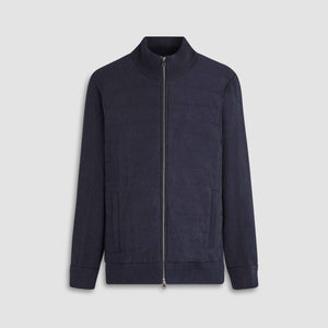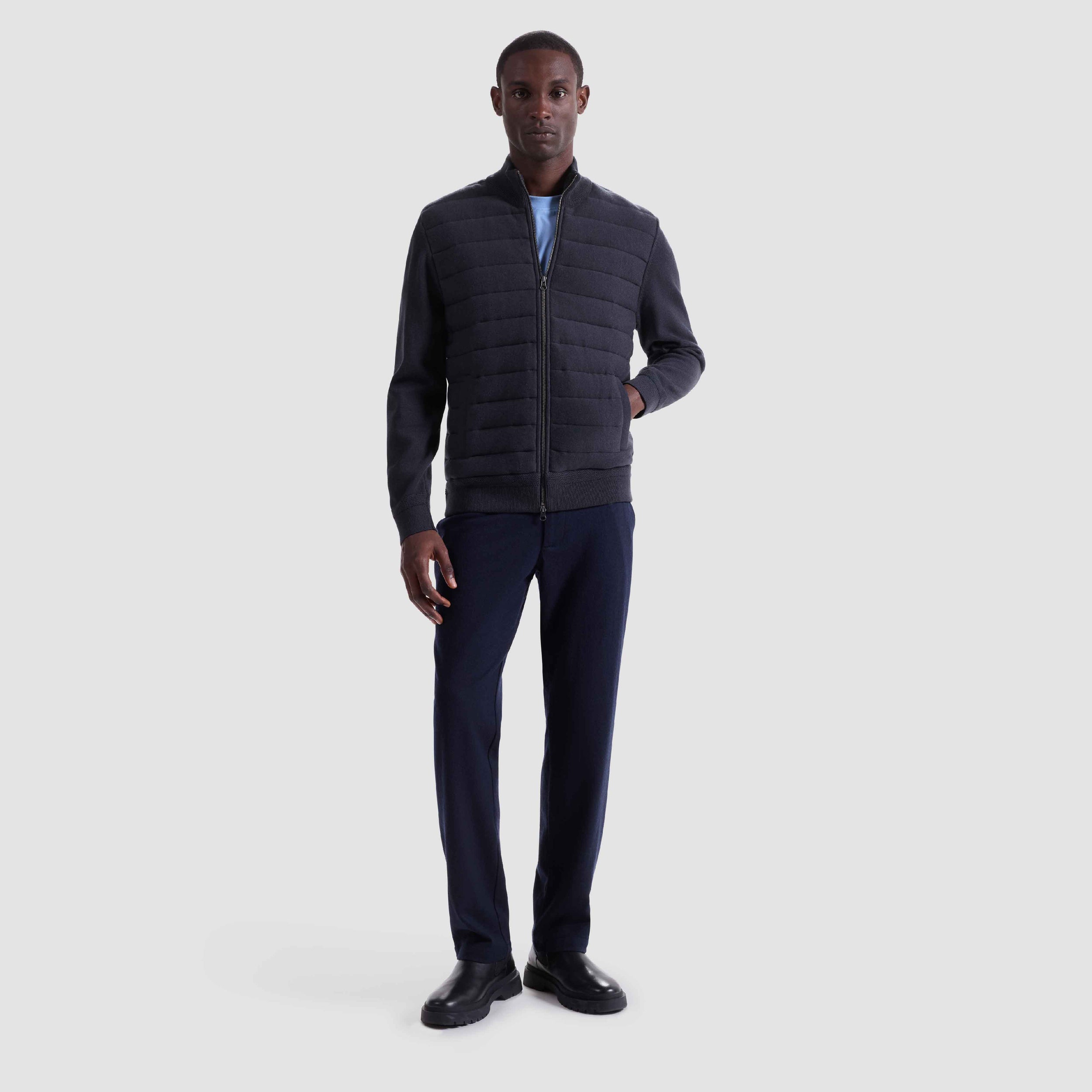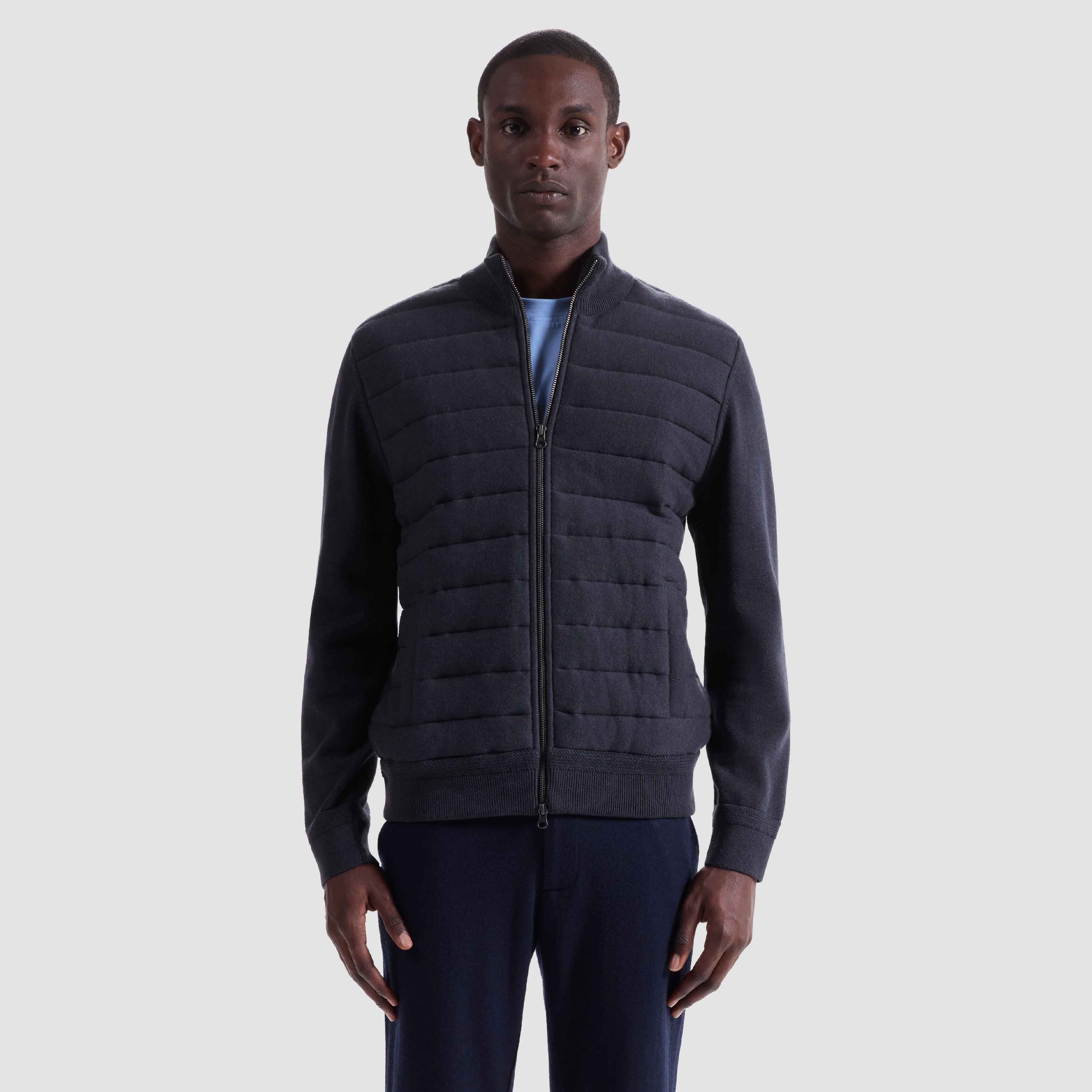 Crafted from 100% cotton, this full-zip sweater features a ribbed mock neck and a quilted front panel contrasted by plain sleeves and back for a sleek, modern look. The ribbed cuffs and hem showcase a distinctive patterned knit for subtle texture. Designed with a two-way zipper and two zippered side pockets with a covered placket for a functional yet elevated appearance.