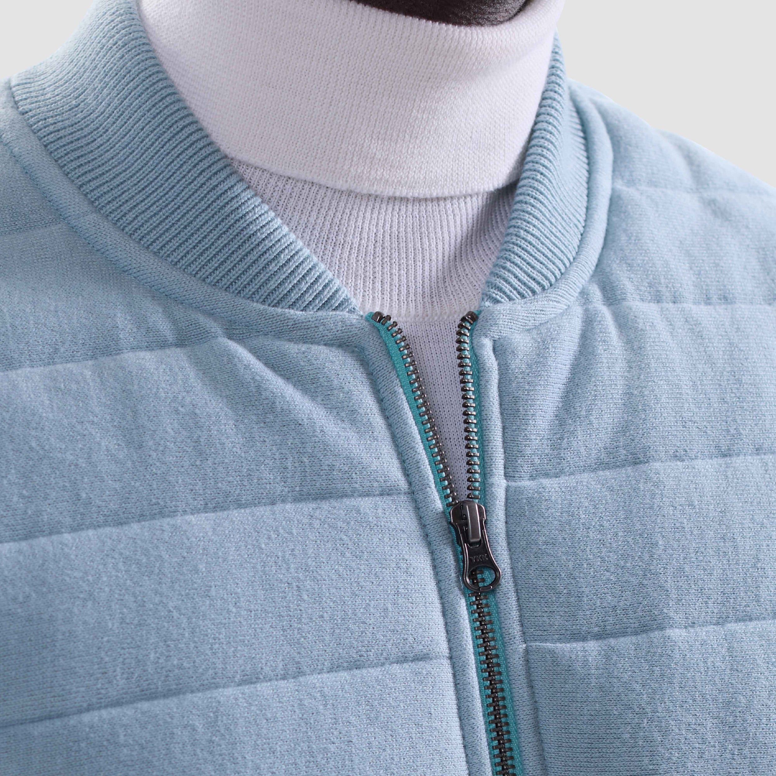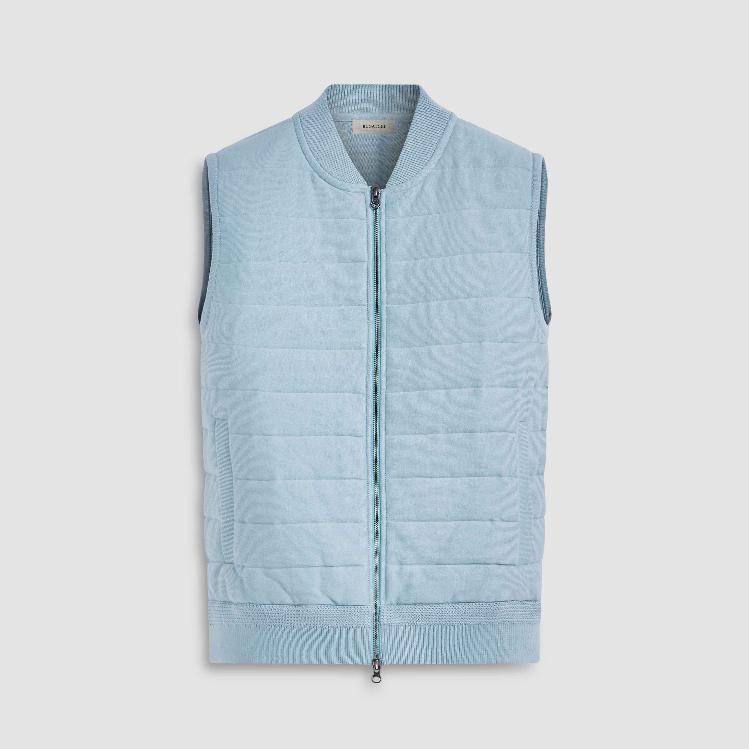 Crafted from 100% cotton, this sweater vest features a quilted front panel contrasted by a smooth back for a clean look, a ribbed baseball collar and a ribbed hem accented with a distinctive patterned knit. Designed with a two-way zipper and two zippered side pockets with a covered placket for a functional yet elevated appearance.