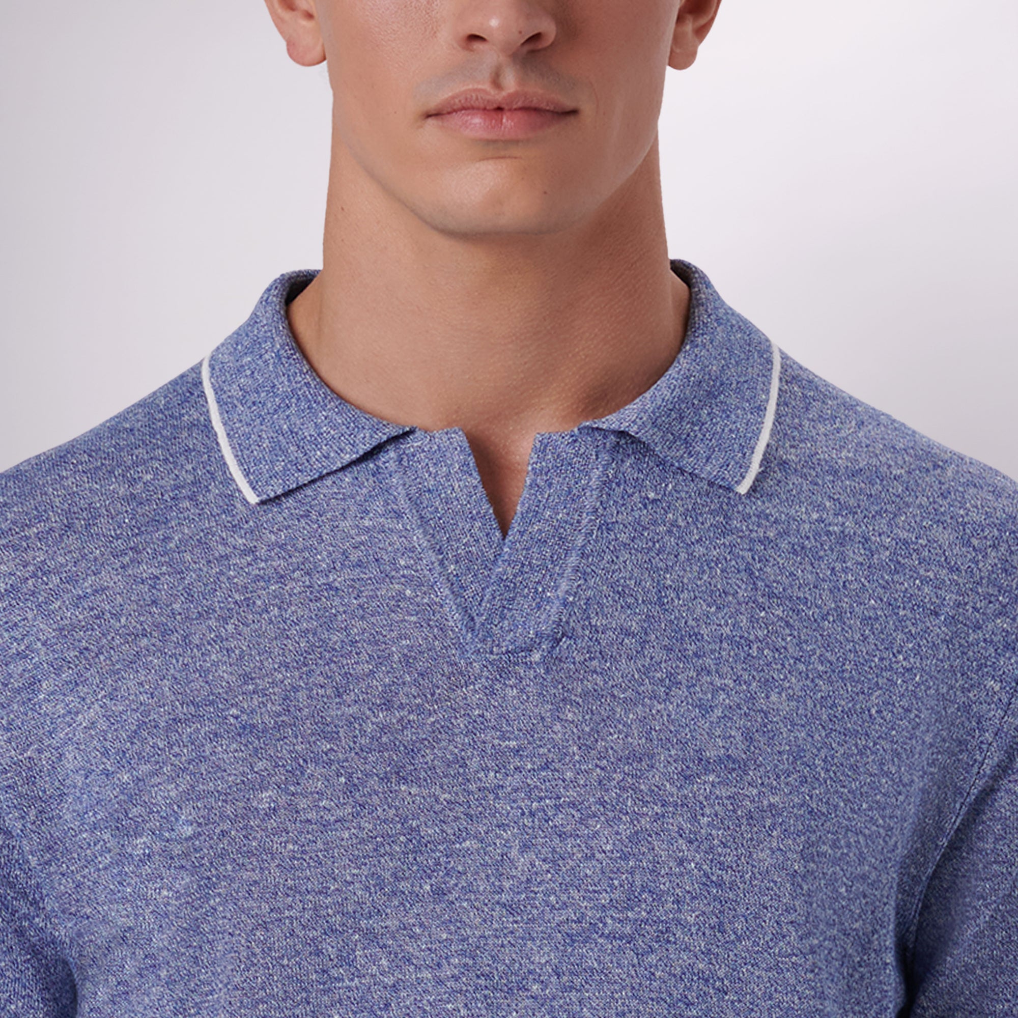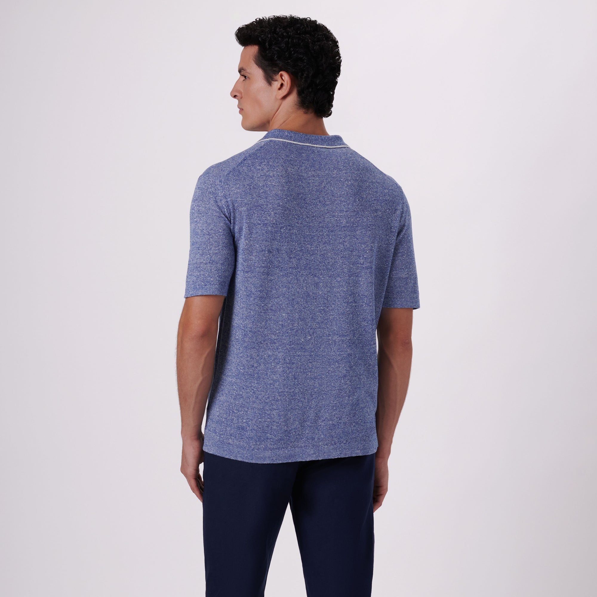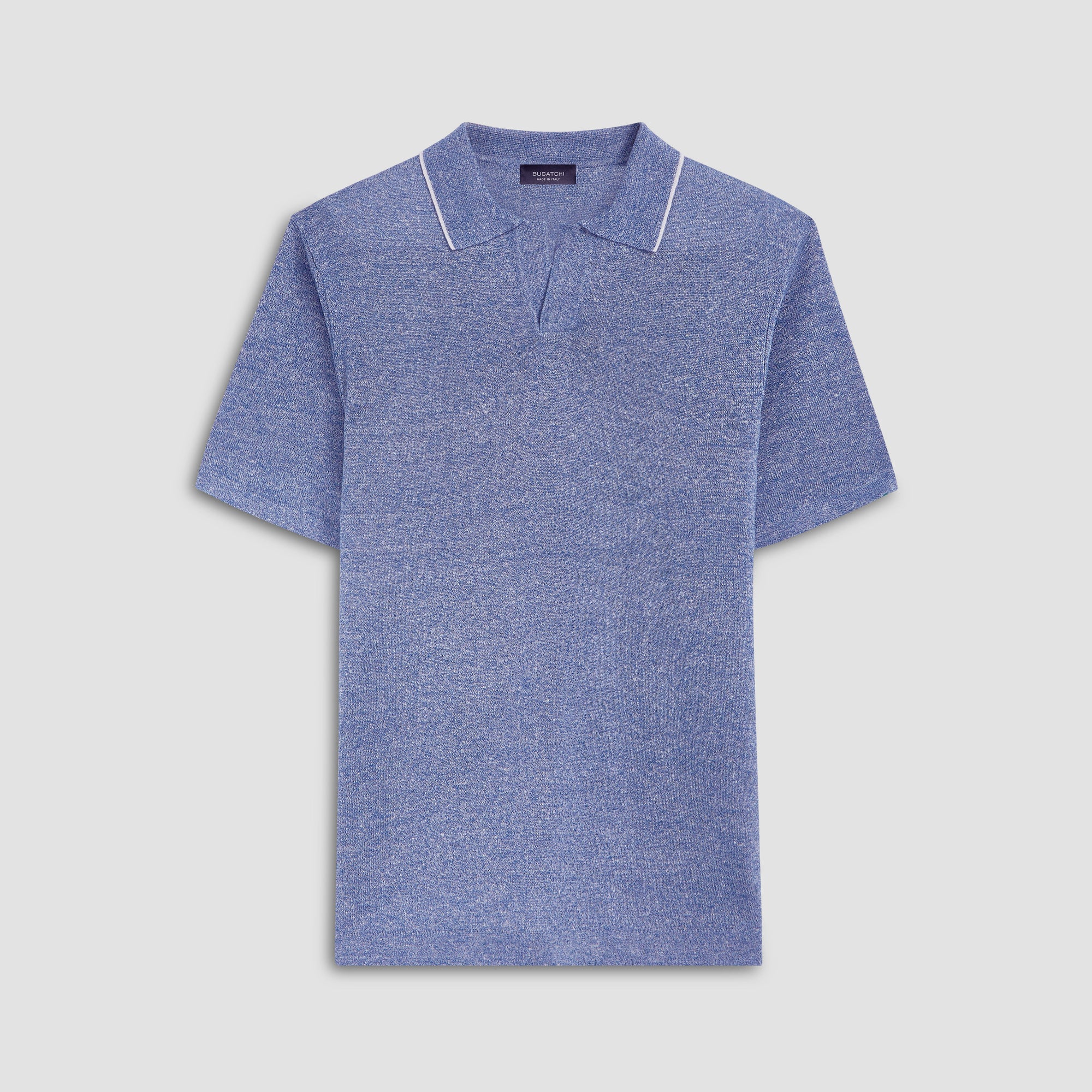 Melange short-sleeved sweater in linen and cotton blend with riviera V-neck and contrast tipped polo collar. Made in Italy.