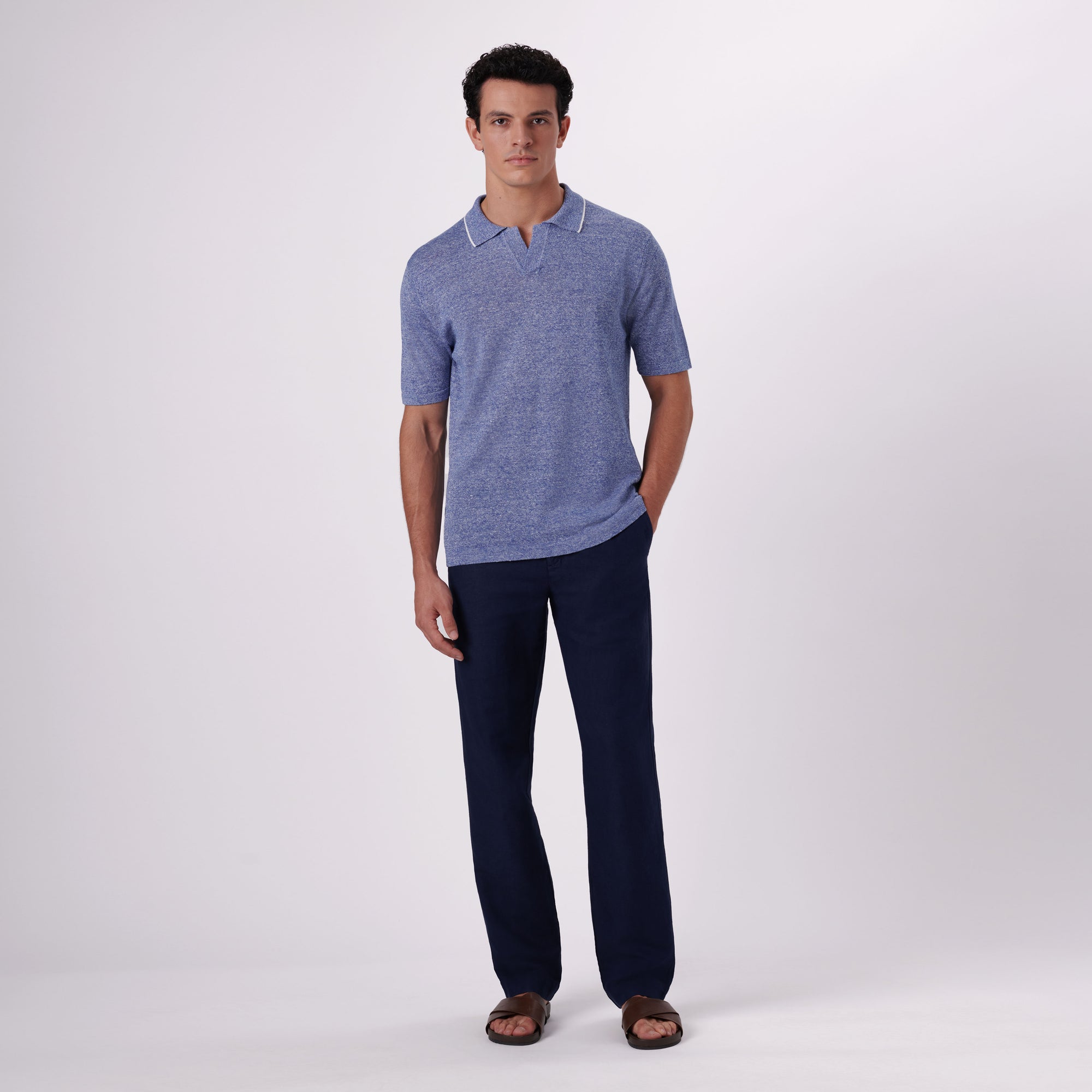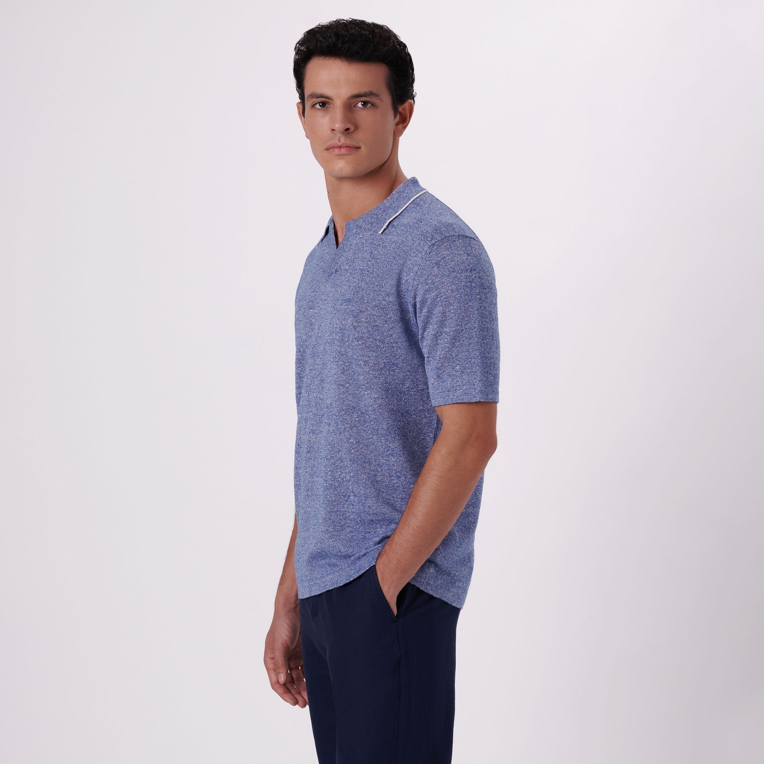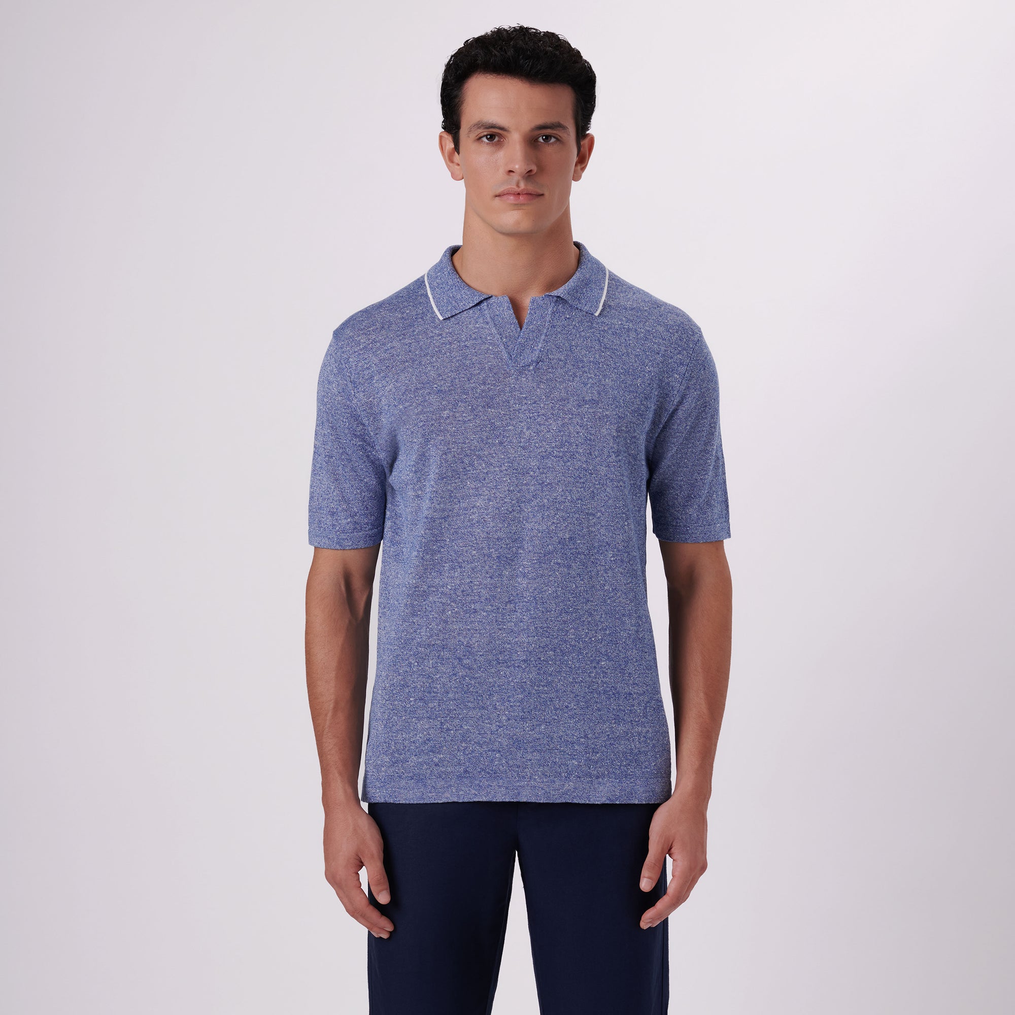 Melange short-sleeved sweater in linen and cotton blend with riviera V-neck and contrast tipped polo collar. Made in Italy.
