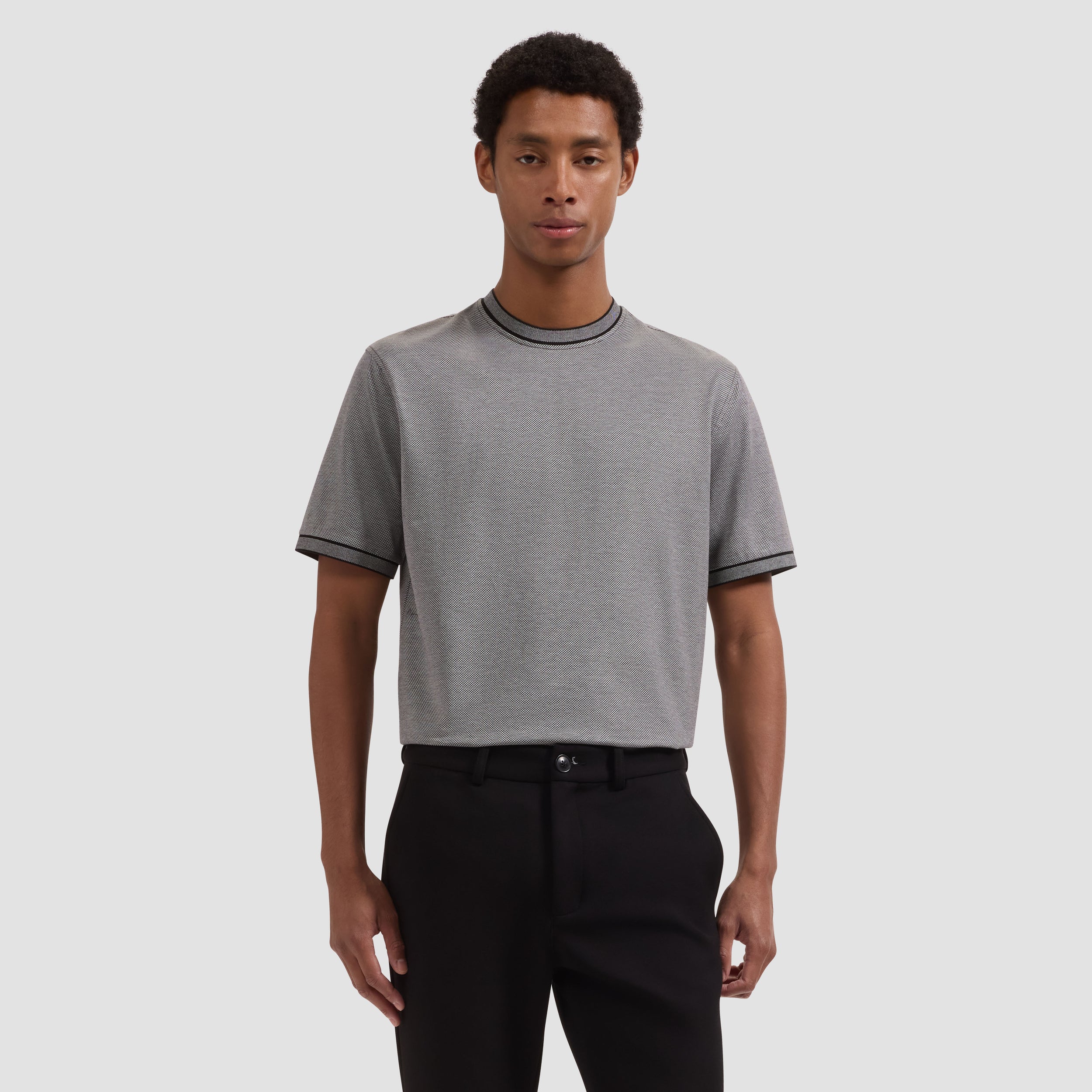 Crafted from a recycled polyester and hemp jersey blend, this elevated performance T-shirt combines technical innovation with refined style. The micro-check pattern lends a modern textural finish, while the crew neckline and short sleeves offer a clean, versatile silhouette. Bird's-eye knit collar and cuffs are outlined with contrast tipping for a sophisticated touch.
