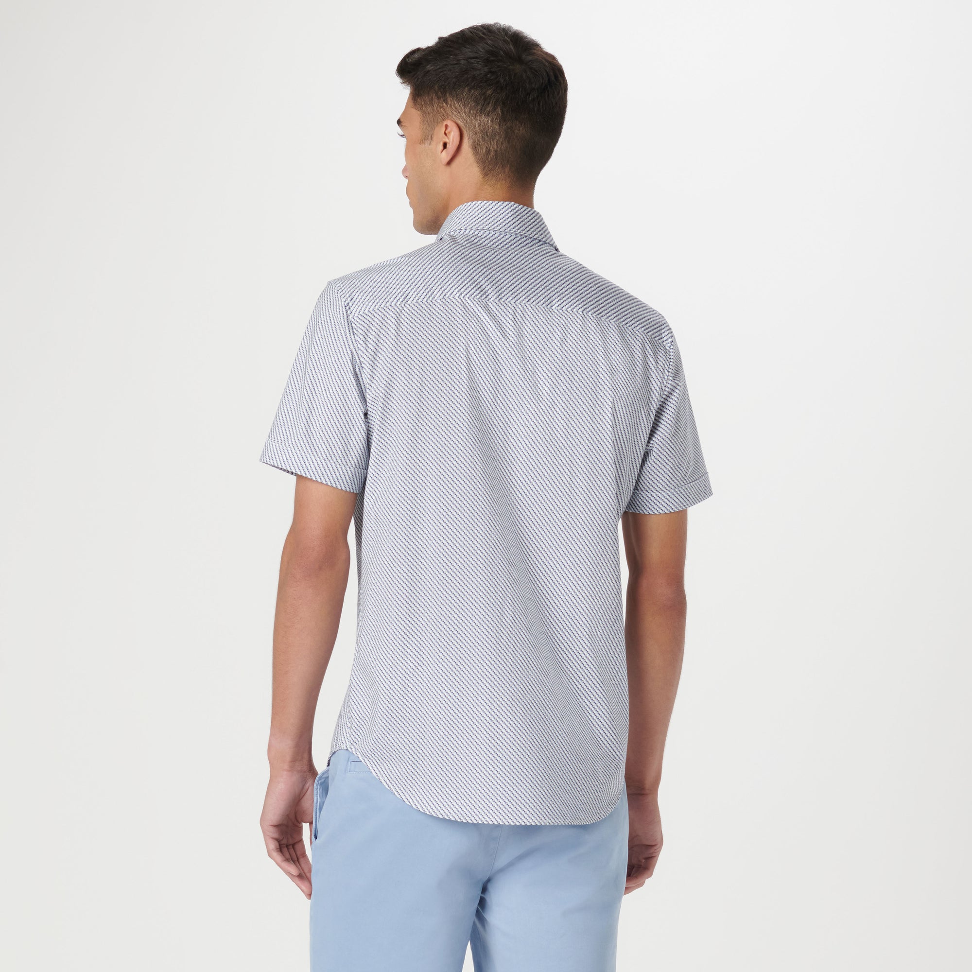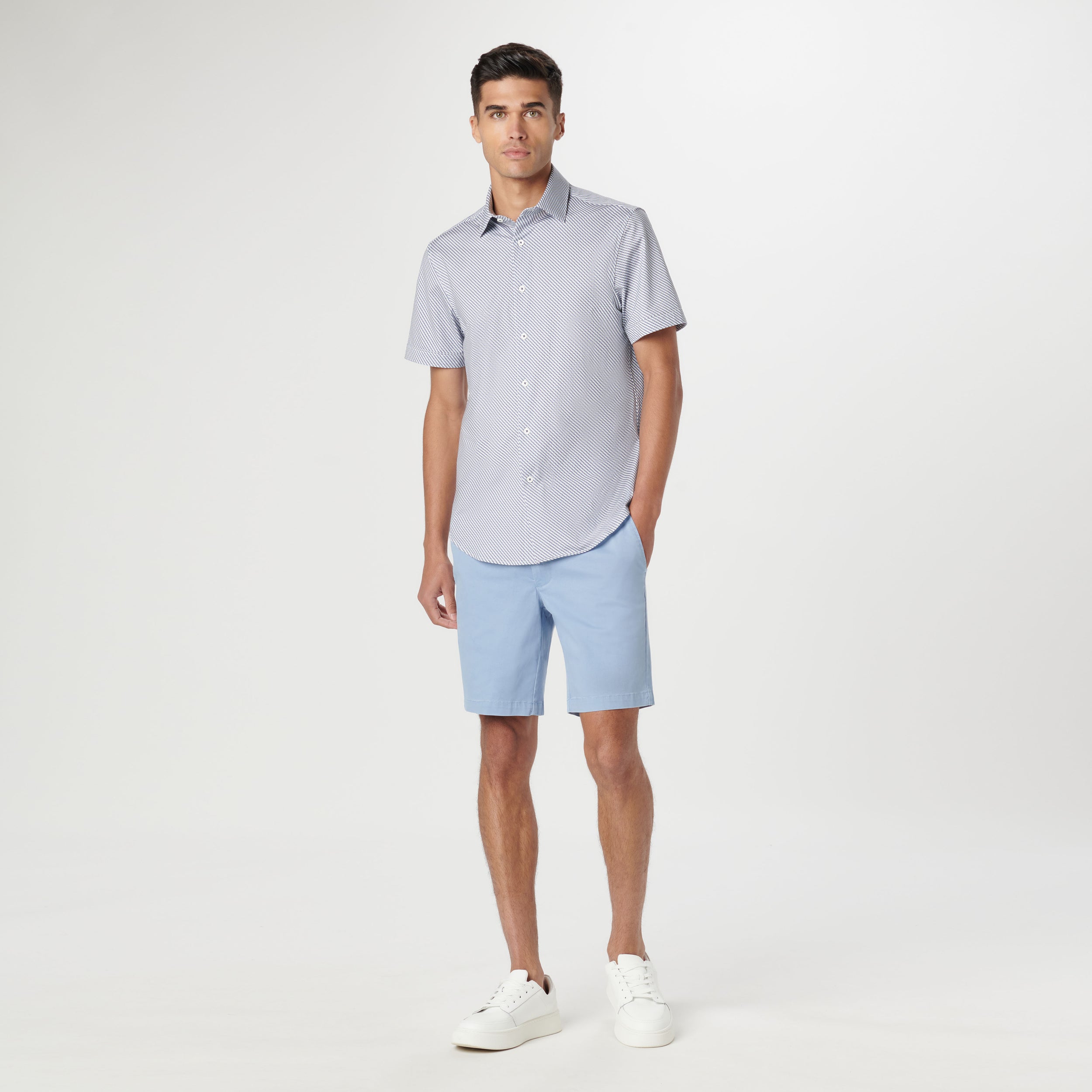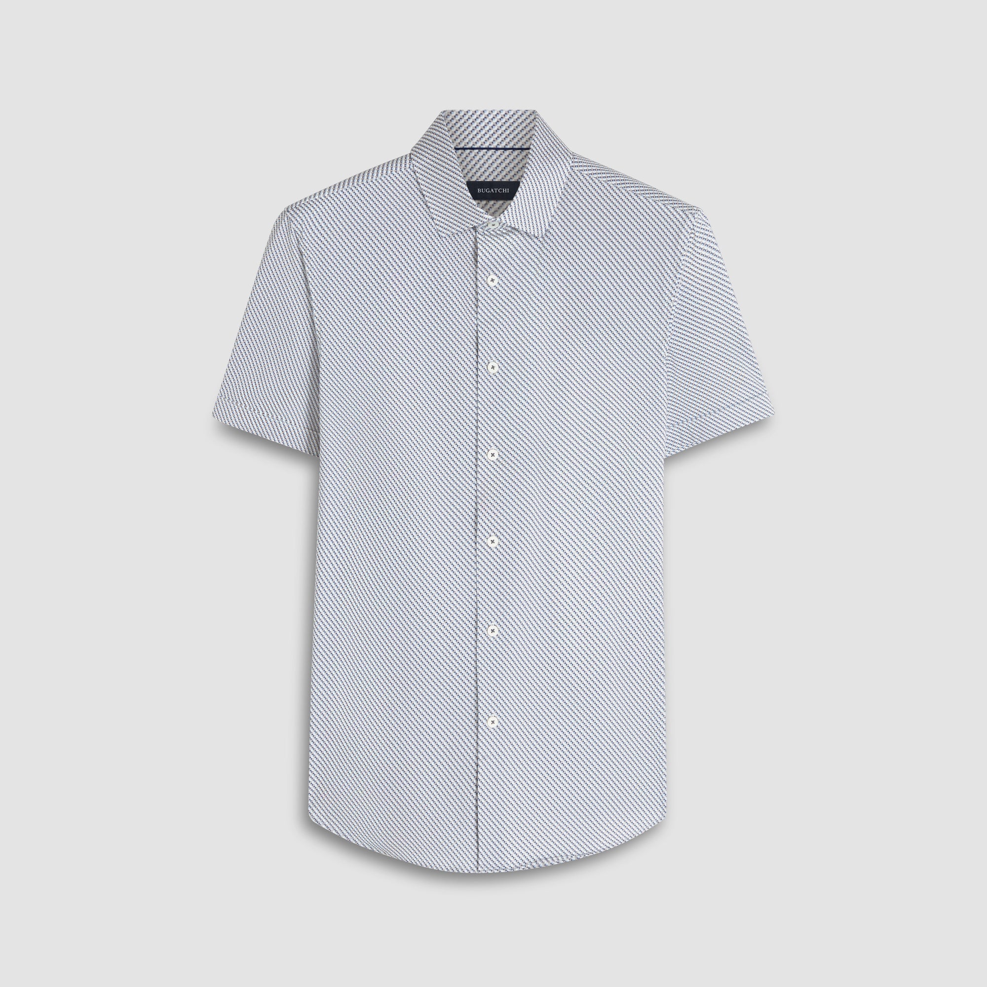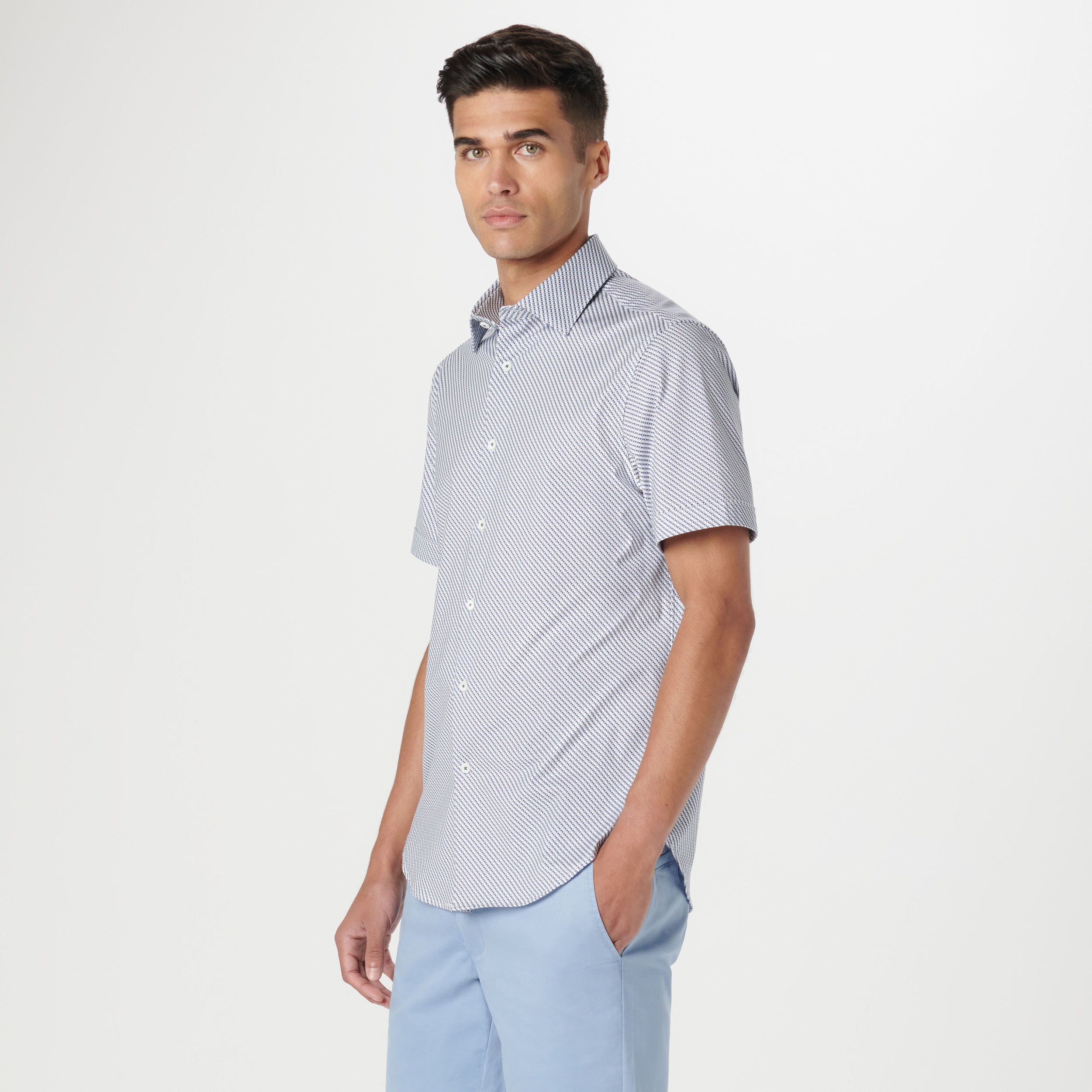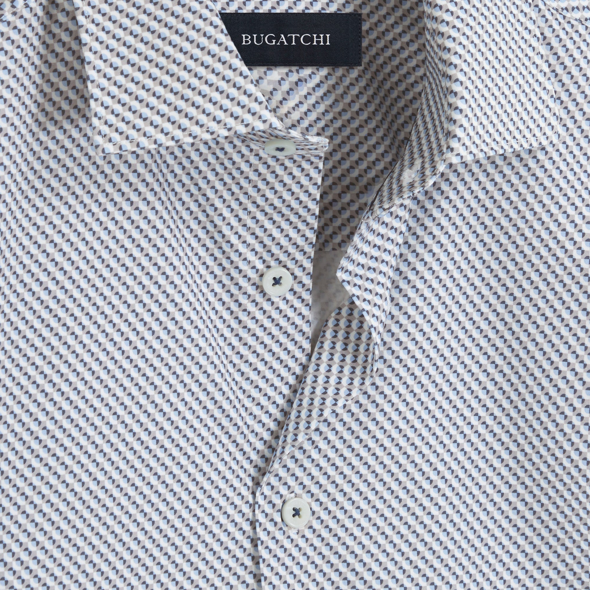 The Miles short-sleeved shirt features a geometric print on OoohCotton fabric, a point collar, genuine shell buttons, and a curved hem. OoohCotton is a double-mercerized, wrinkle-resistant, breathable, and easy-care cotton blend with 8-way stretch, quick-dry, and thermal comfort properties.