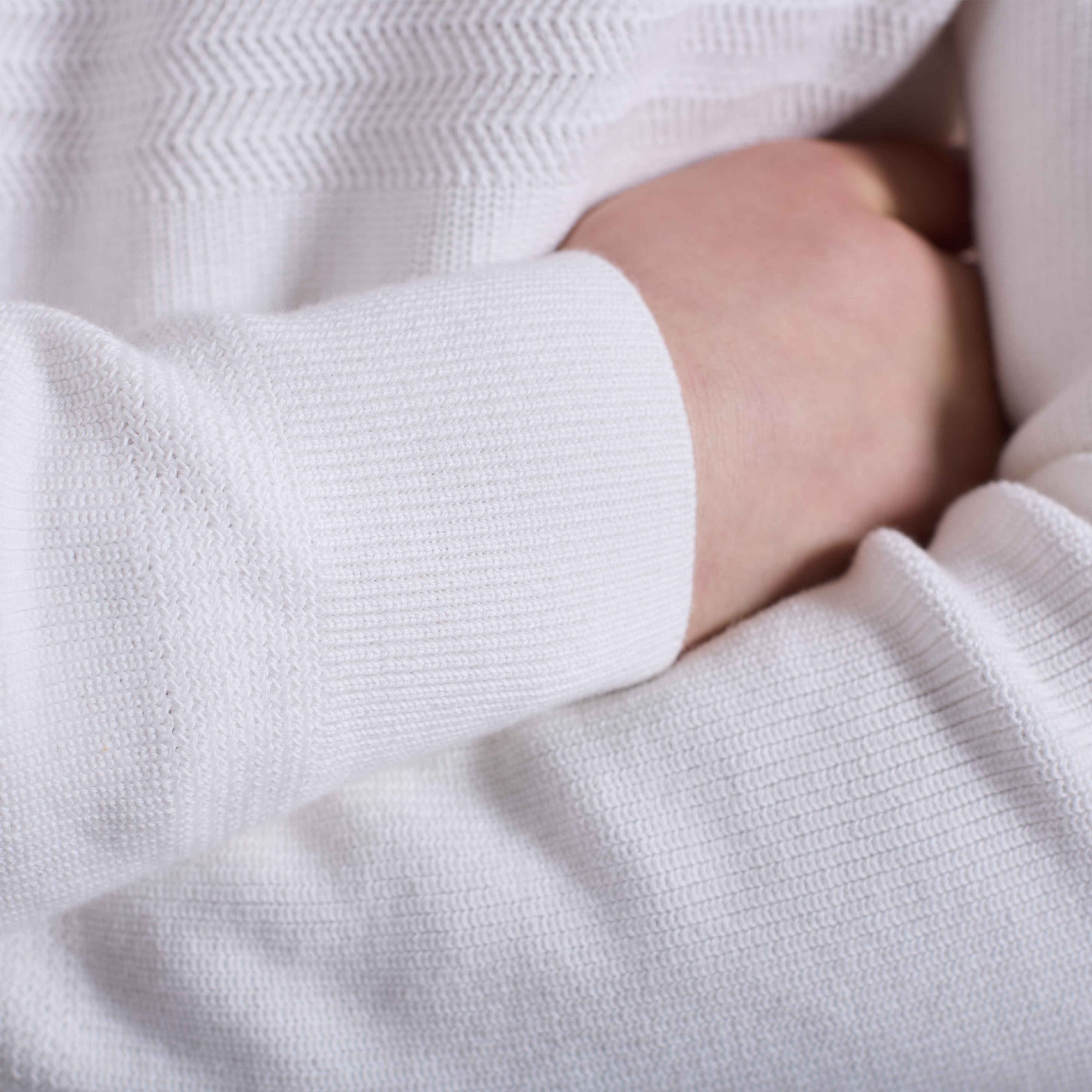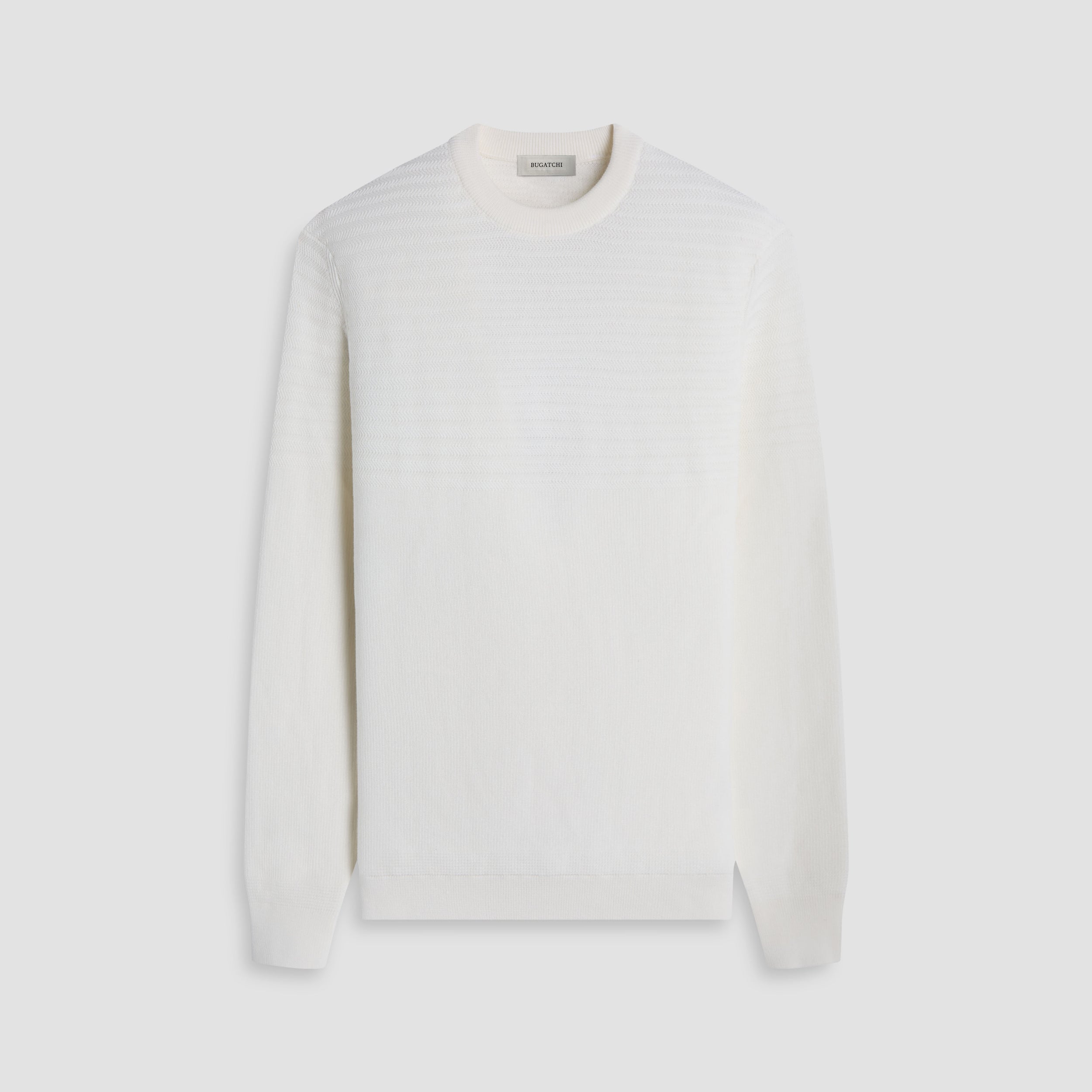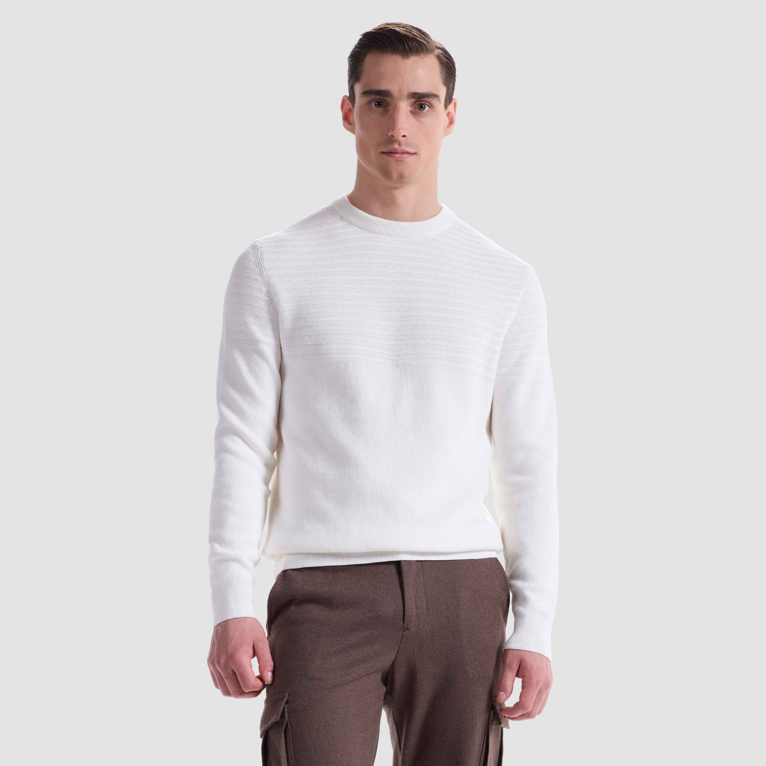 Crafted from 100% cotton, this crewneck sweater features a combination of herringbone and garter stitch for a refined, textured look. The ribbed neckline, cuffs, and hem are accented with subtle herringbone stitch detailing, adding a polished finish. A versatile piece that blends modern structure with classic knit techniques.