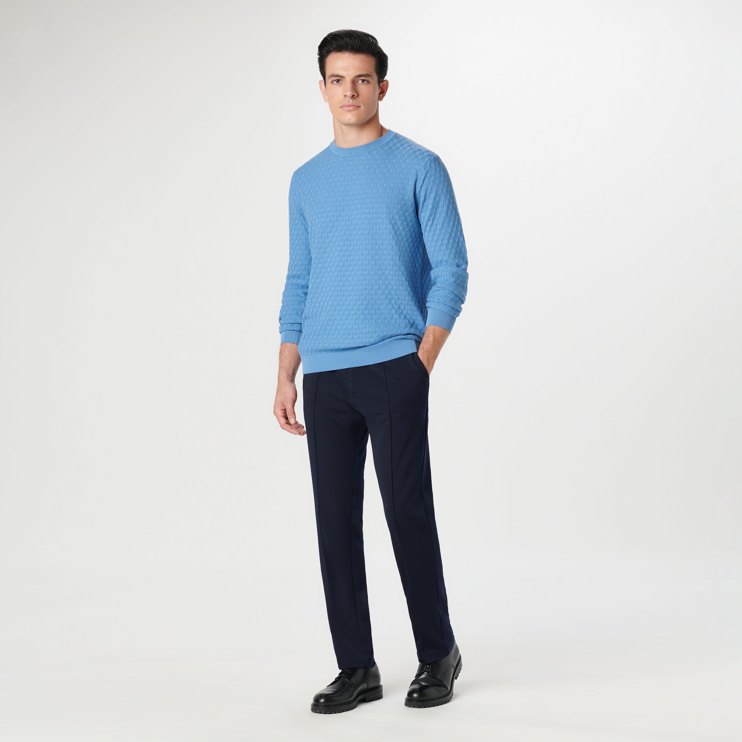 This Italian-made crew neck sweater crafted in 100% cotton yarn combines various textures in solid mixed stitching and features a rib knit collar, cuffs, and waistband. Breathable, moisture-wicking, and low-pilling, it's a versatile choice for day-to-evening wear.