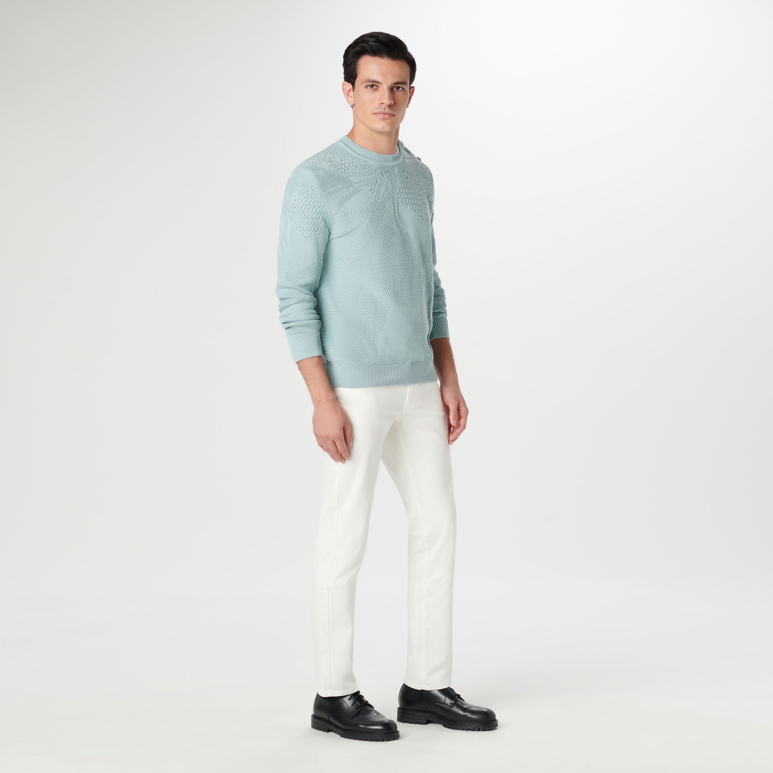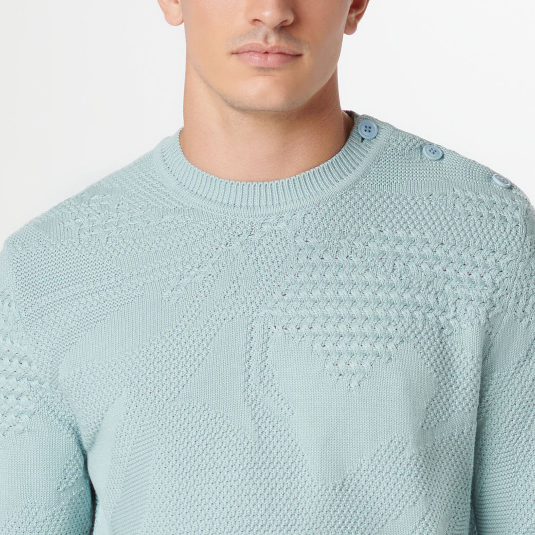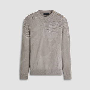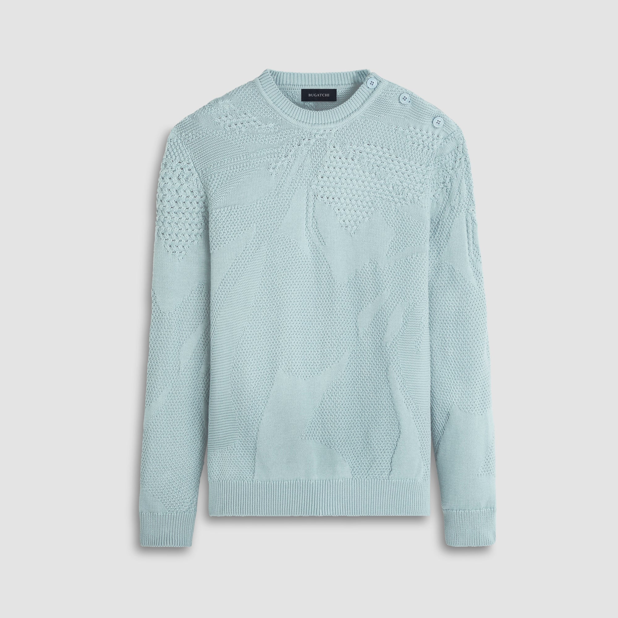 Contemporary and stylish, this crew neck sweater blends various textures in solid mixed stitching using 100% cotton yarn. It boasts a rib collar, cuffs, and waistband, along with unique one-shoulder buttons for added flair. Breathable, moisture-wicking, and chemical-free, this sweater is soft and machine washable with low pilling, it effortlessly transitions from casual to sophisticated, making it a versatile choice for day-to-evening wear.