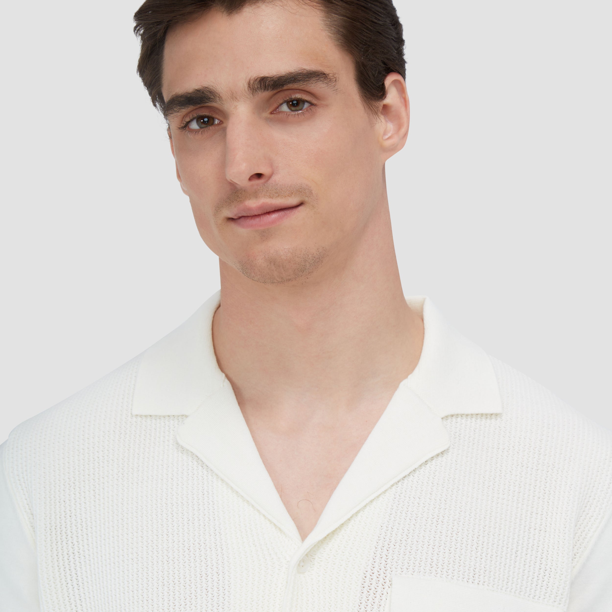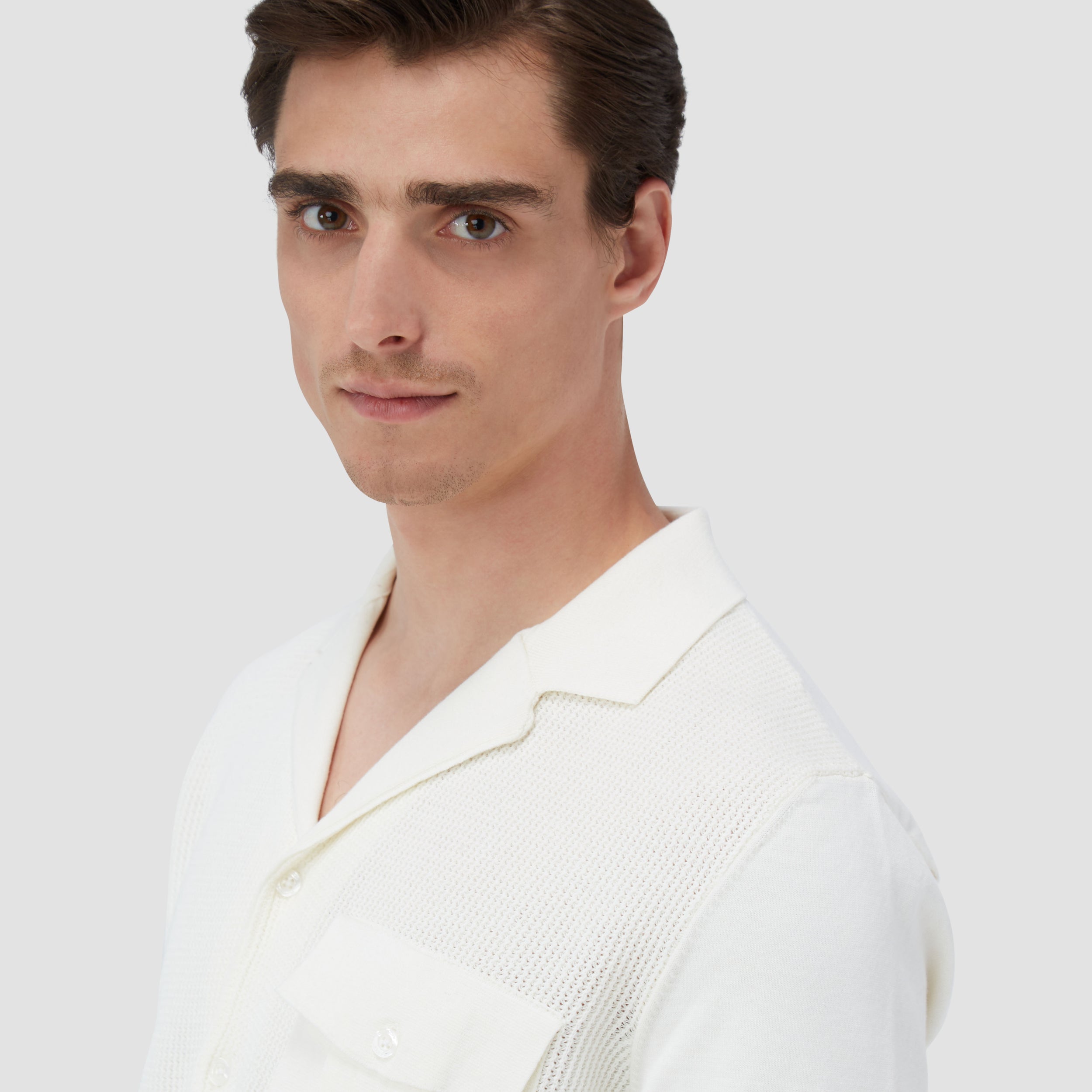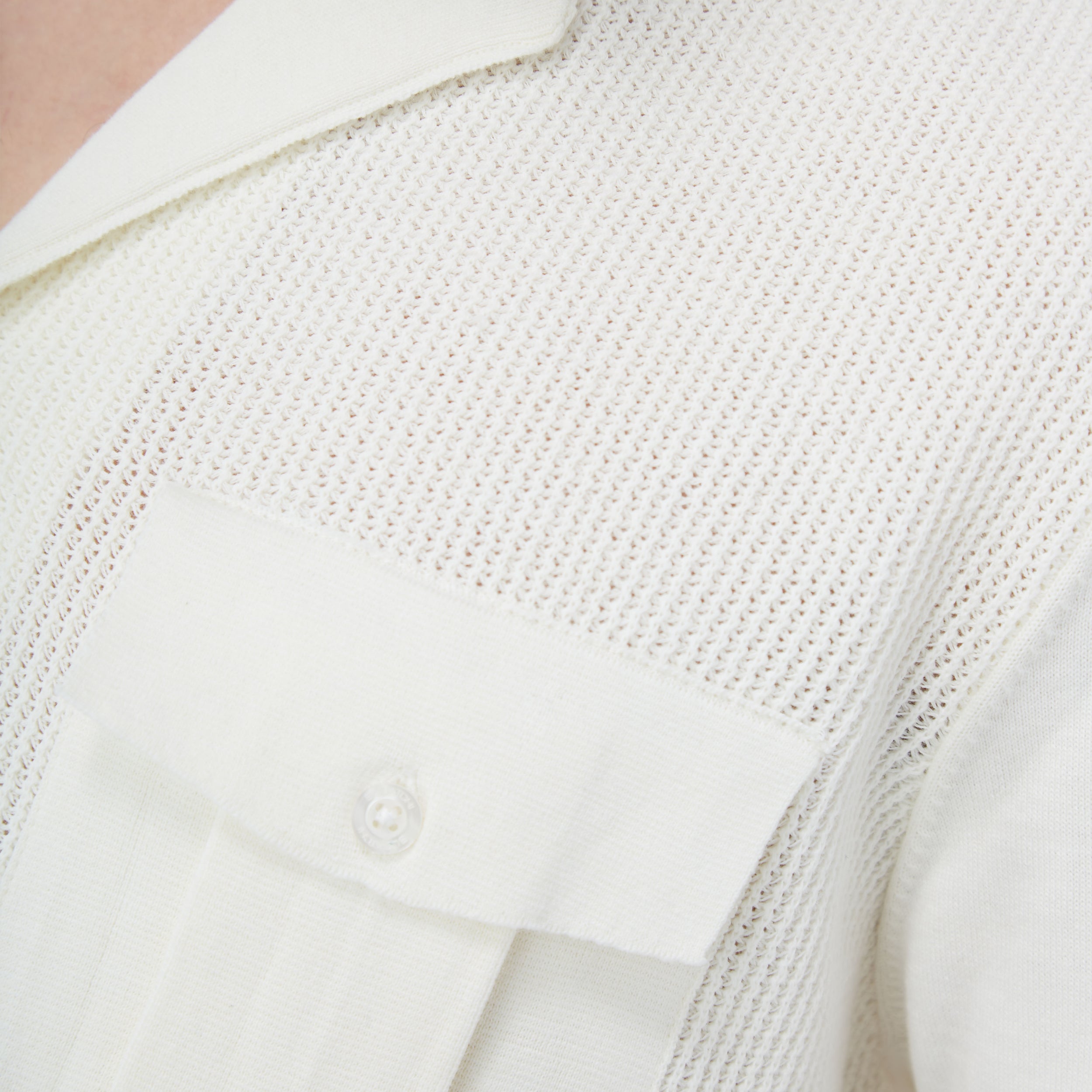 Crafted from a cotton and silk blend, this short-sleeved shirt sweater reflects elegance with a modern twist. Textured front stitch adds depth, while Milano jersey stitch on the back provides contrast. Features a camp collar, pocket, and mother of pearl buttons.