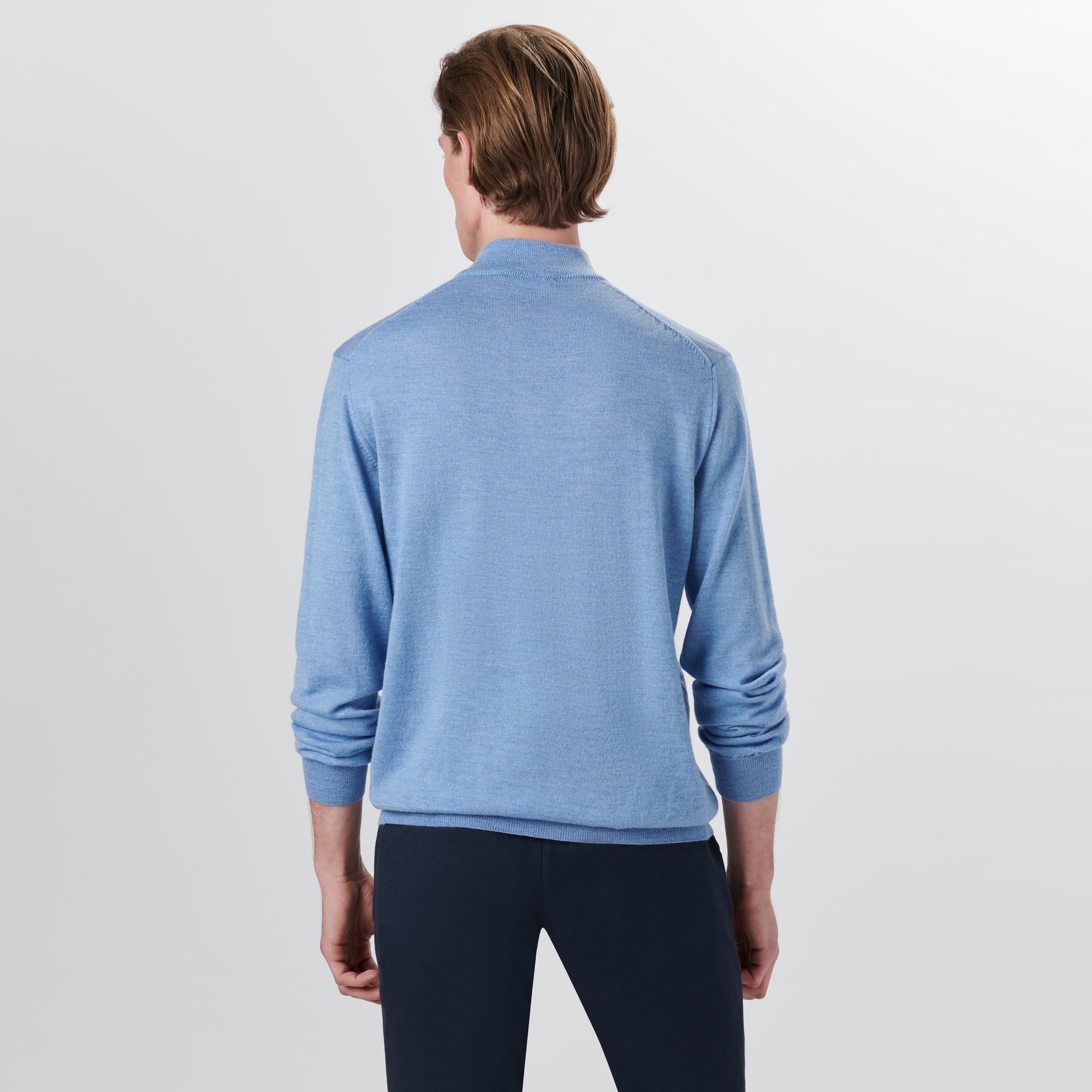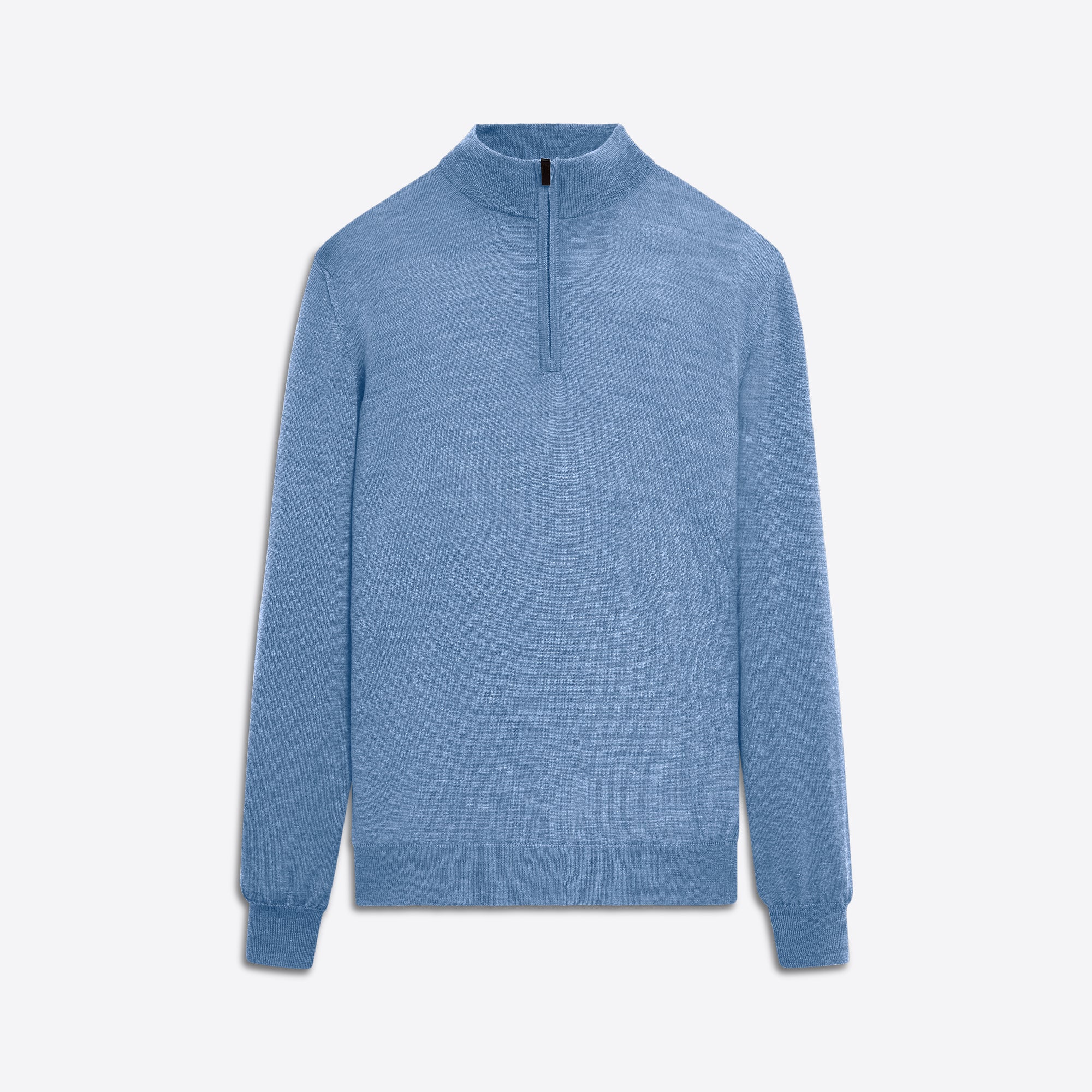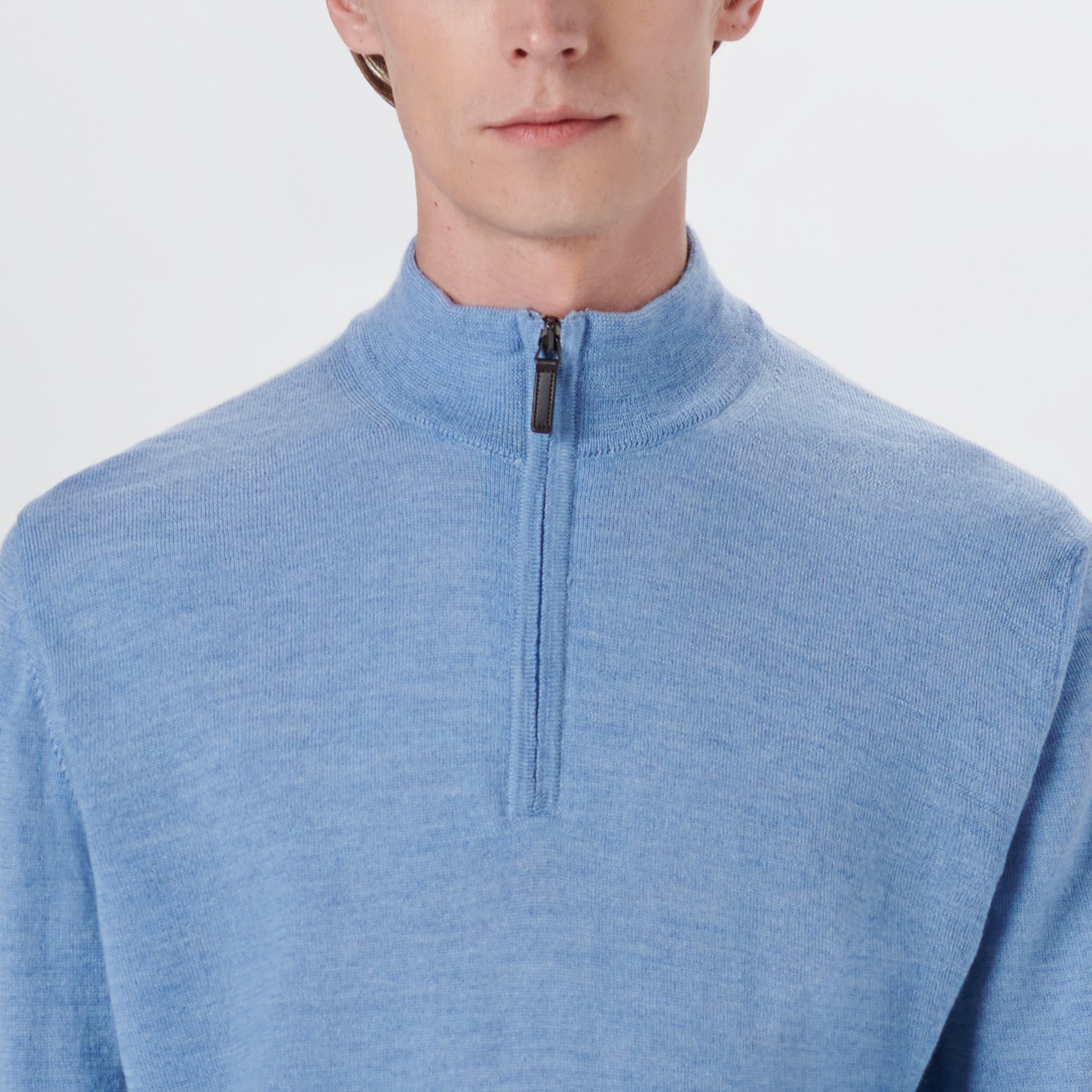 Solid quarter zip sweater in solid 100% extra fine merino wool with Harmony 4.0 special finishing. This sweater is made with a high twist yarn that is breathable, hygroscopic, water repellent, machine washable and crease proof for long lasting performance wash after wash. Made in Italy.