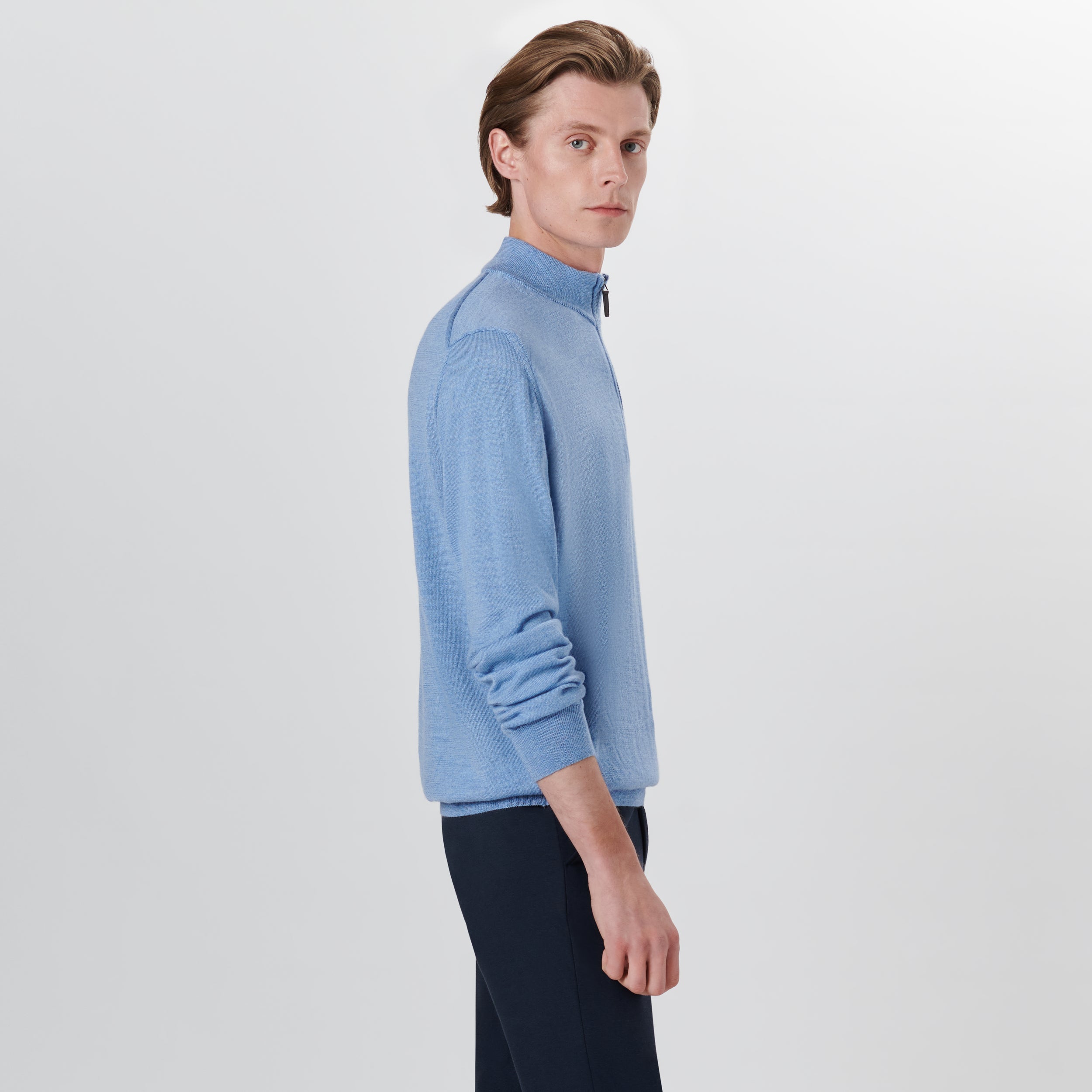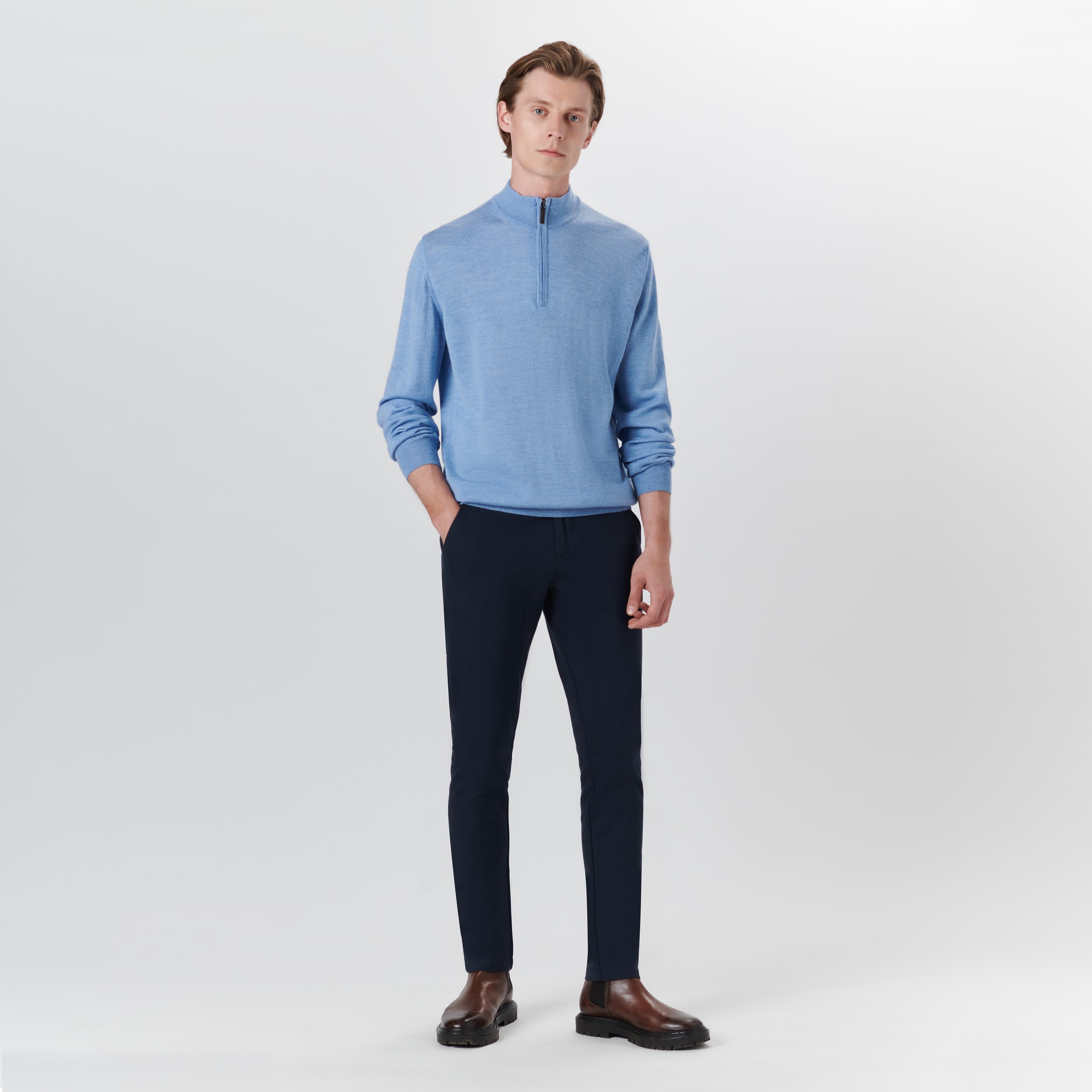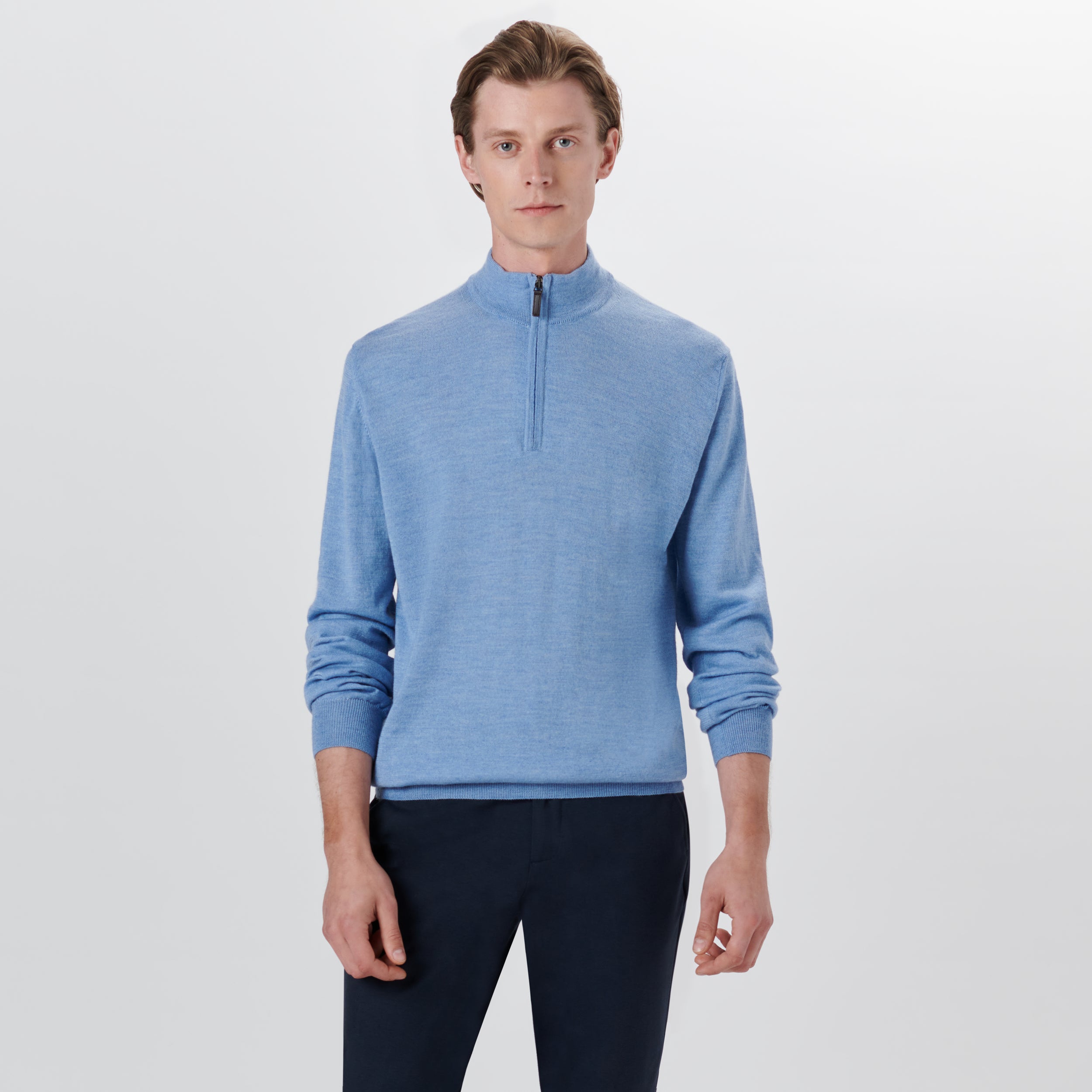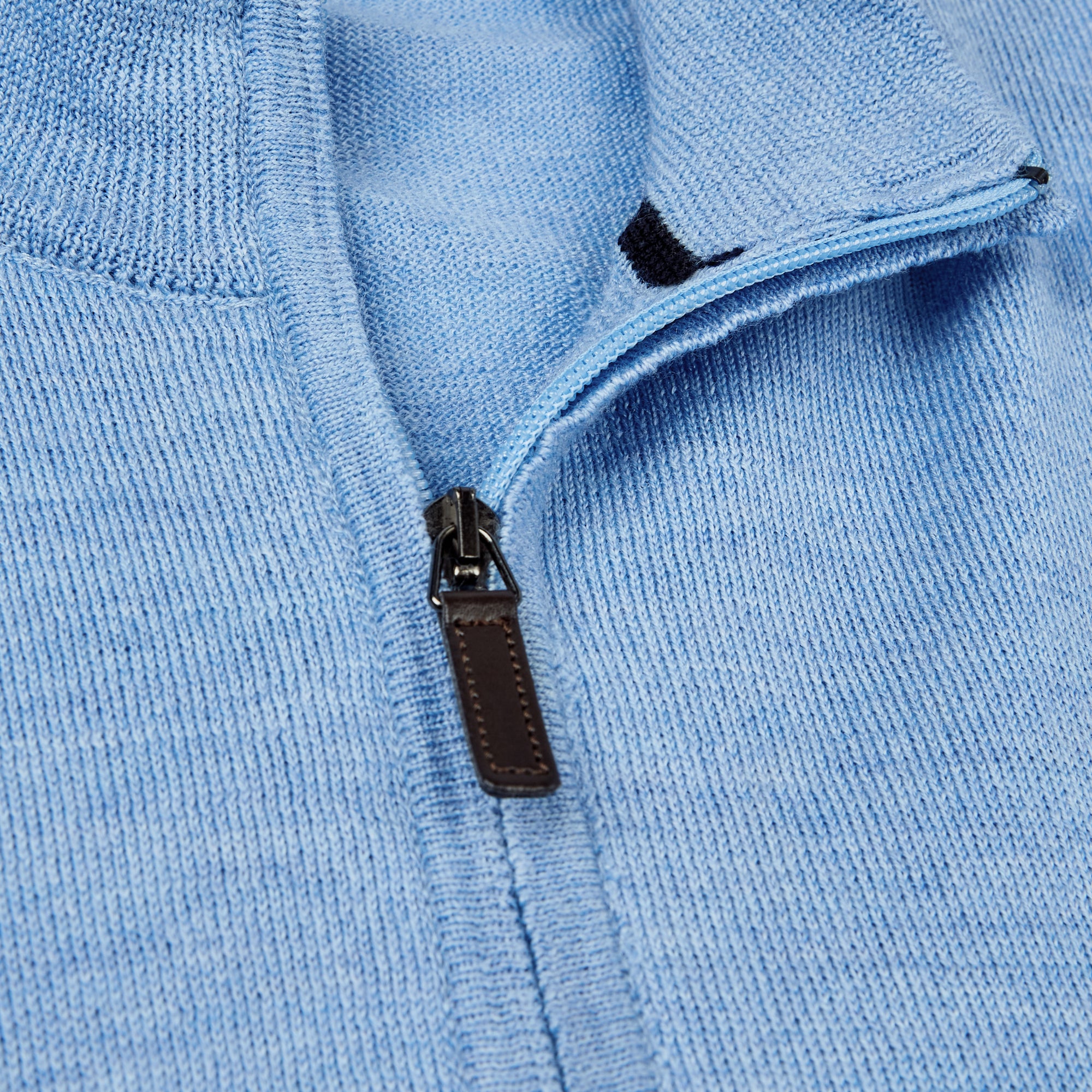 Solid quarter zip sweater in solid 100% extra fine merino wool with Harmony 4.0 special finishing. This sweater is made with a high twist yarn that is breathable, hygroscopic, water repellent, machine washable and crease proof for long lasting performance wash after wash. Made in Italy.