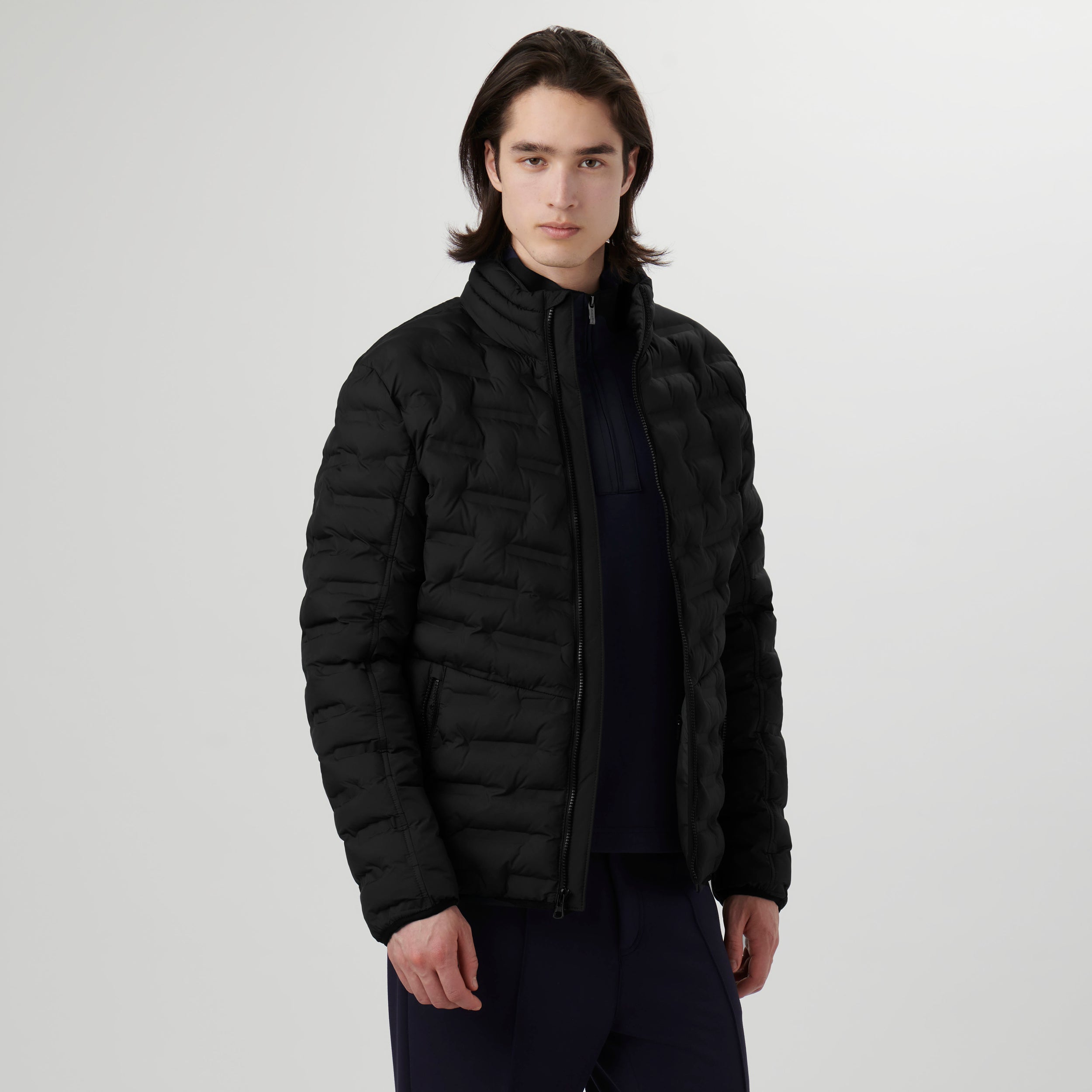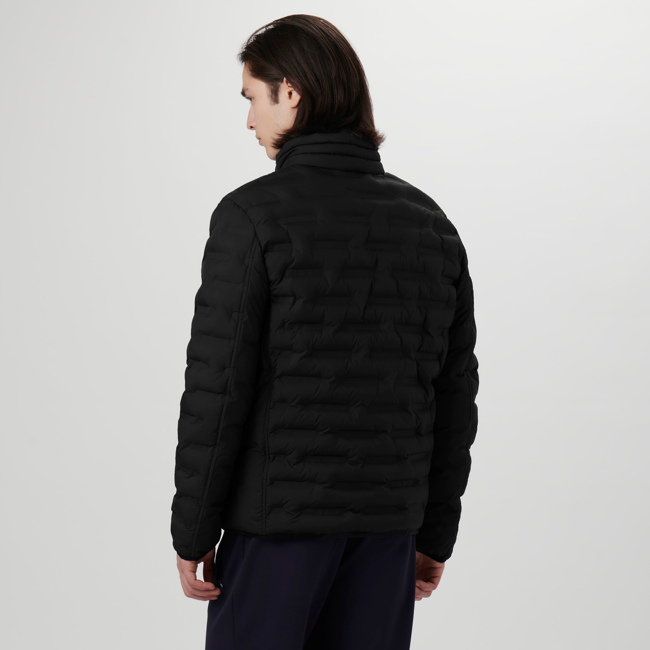 Bomber jacket in crinkle quilted, water repellent nylon with high standing puffer collar, thermal insulation, full zipper closure, angled zippered pockets and contrast detail.
