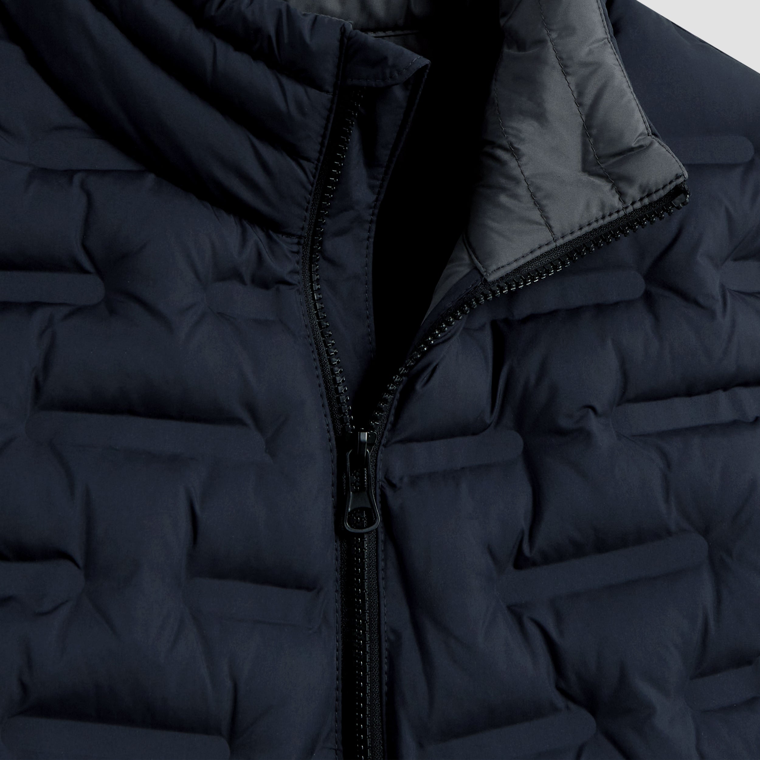 Bomber jacket in crinkle quilted, water repellent nylon with high standing puffer collar, thermal insulation, full zipper closure, angled zippered pockets and contrast detail.
