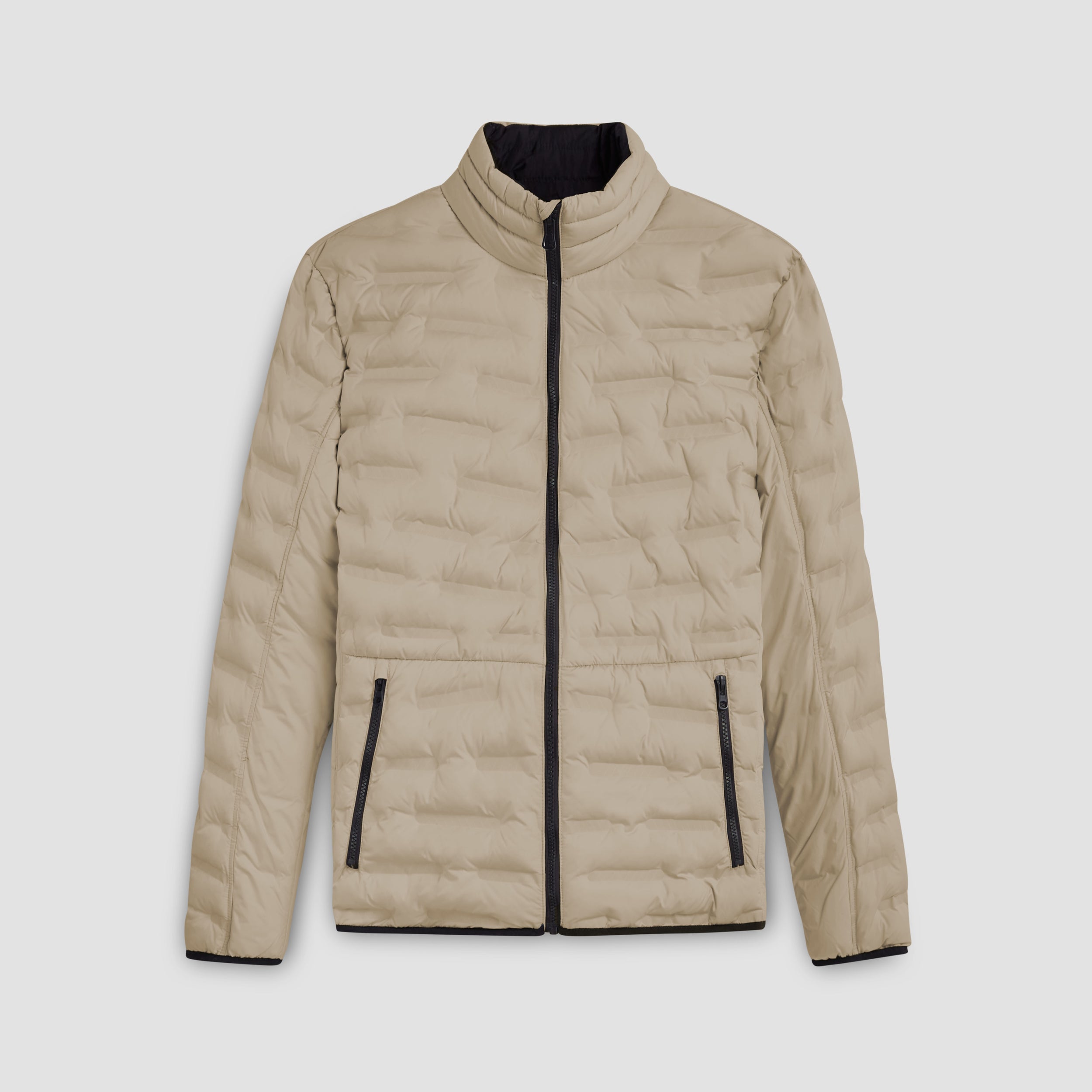 Bomber jacket in crinkle quilted, water repellent nylon with high standing puffer collar, thermal insulation, full zipper closure, angled zippered pockets and contrast detail.