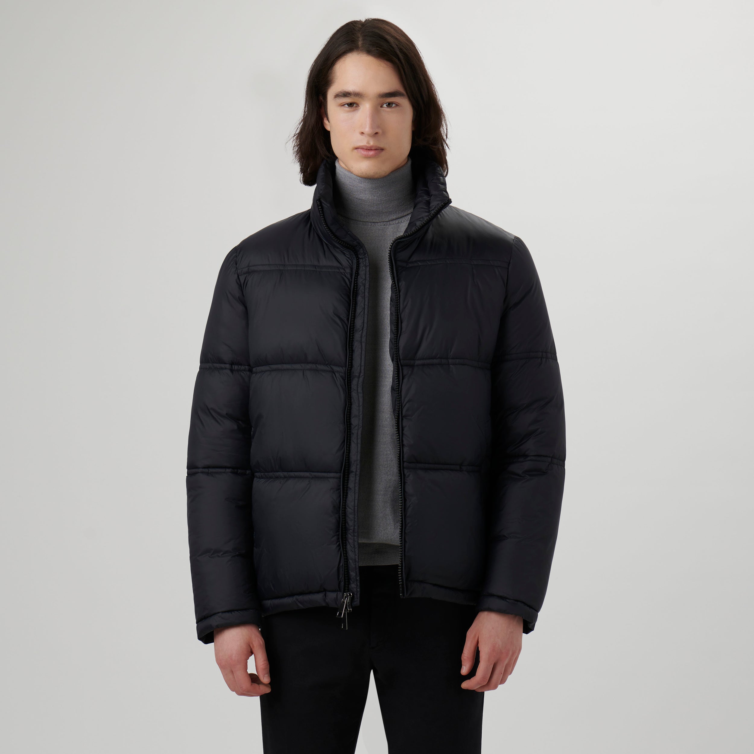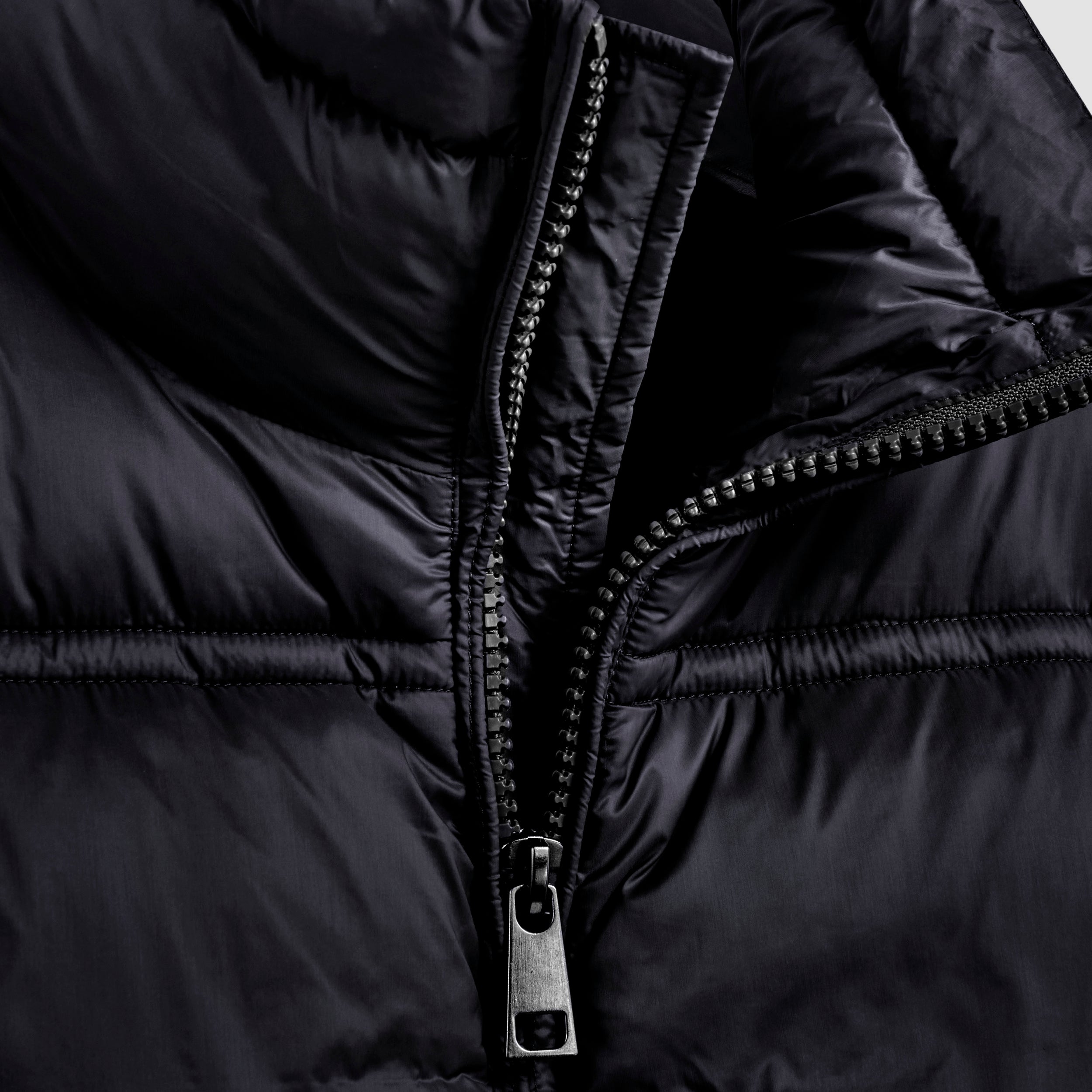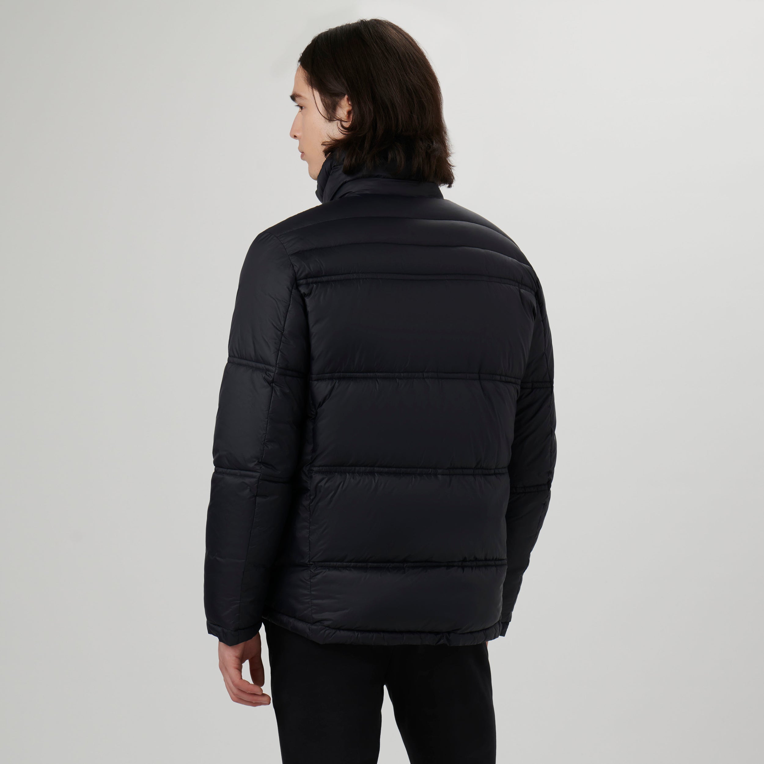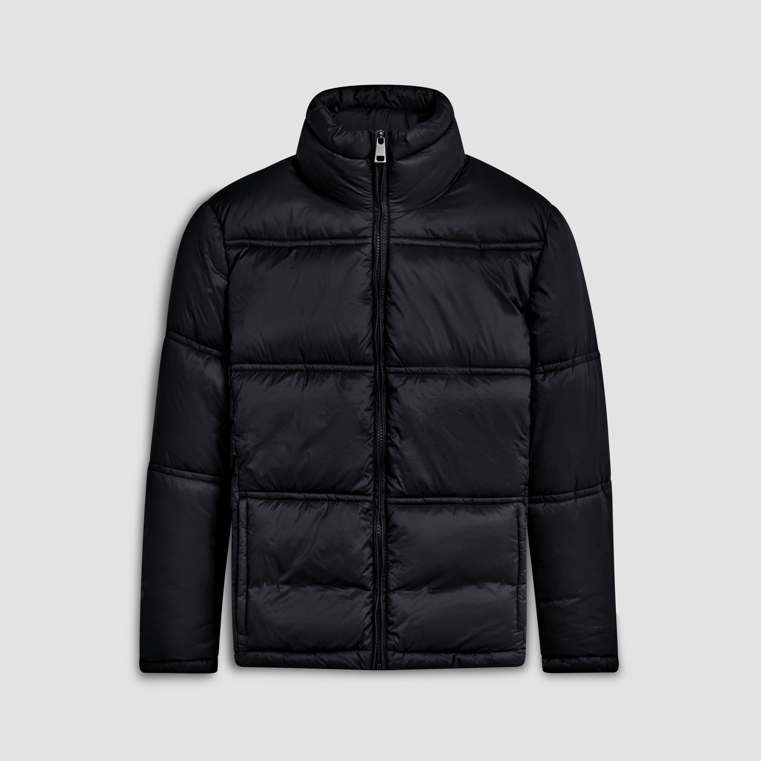 Puffer jacket in water repellent nylon with high standing collar, thermal insulation, two-way zipper closure and on-seam hand entry pockets.