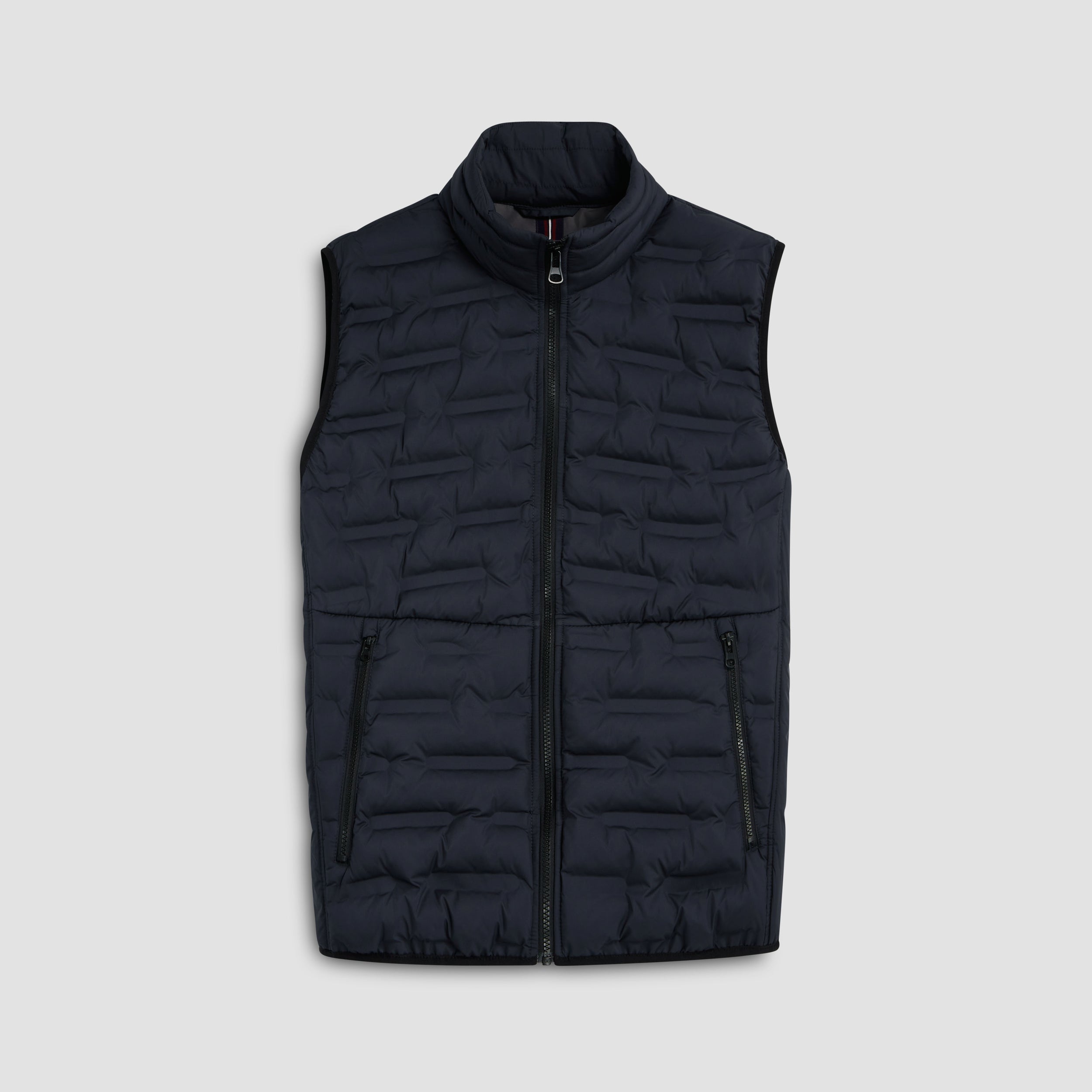 Sleeveless vest in crinkle quilted, water repellent nylon with high standing puffer collar, thermal insulation, full zipper closure, angled zippered pockets and contrast detail.