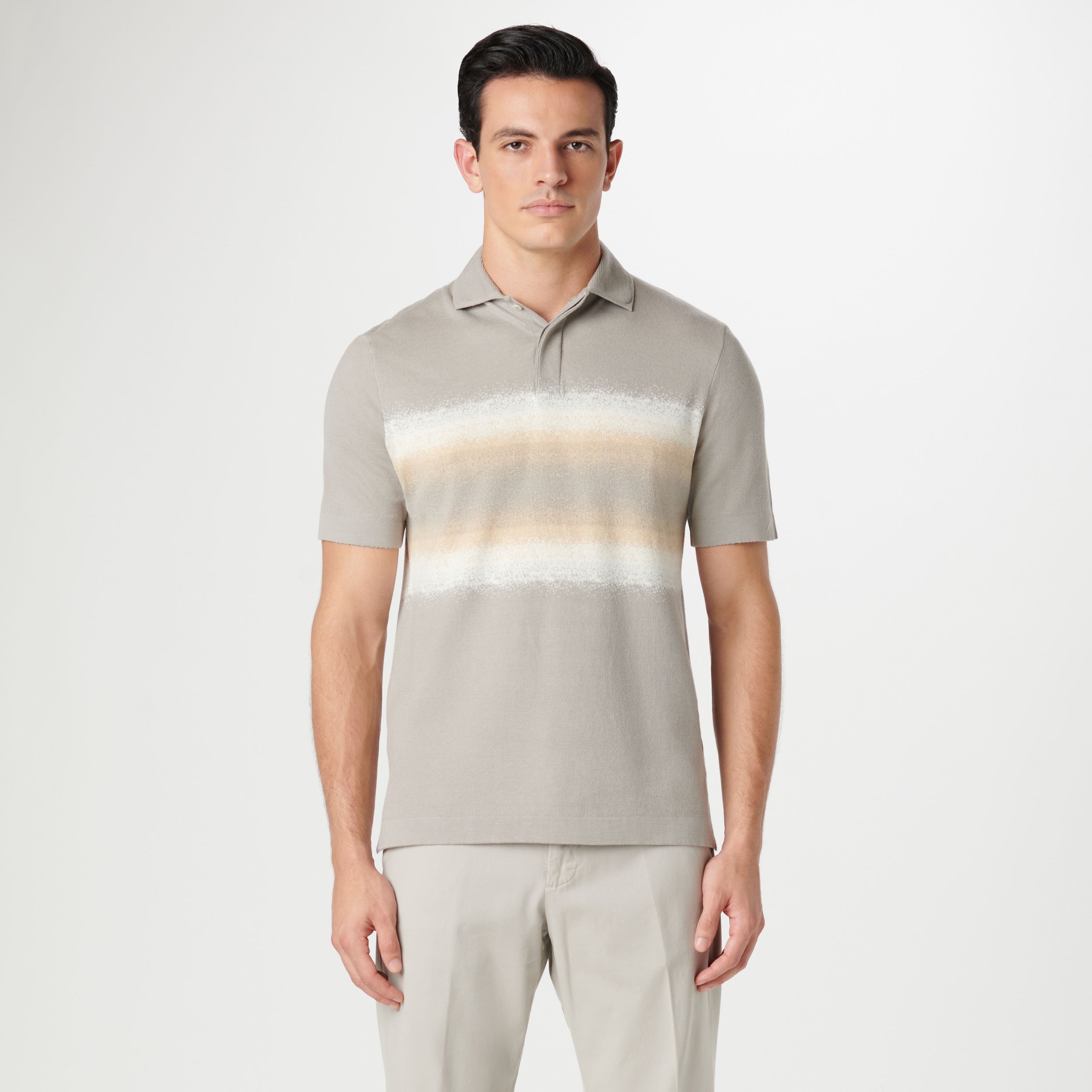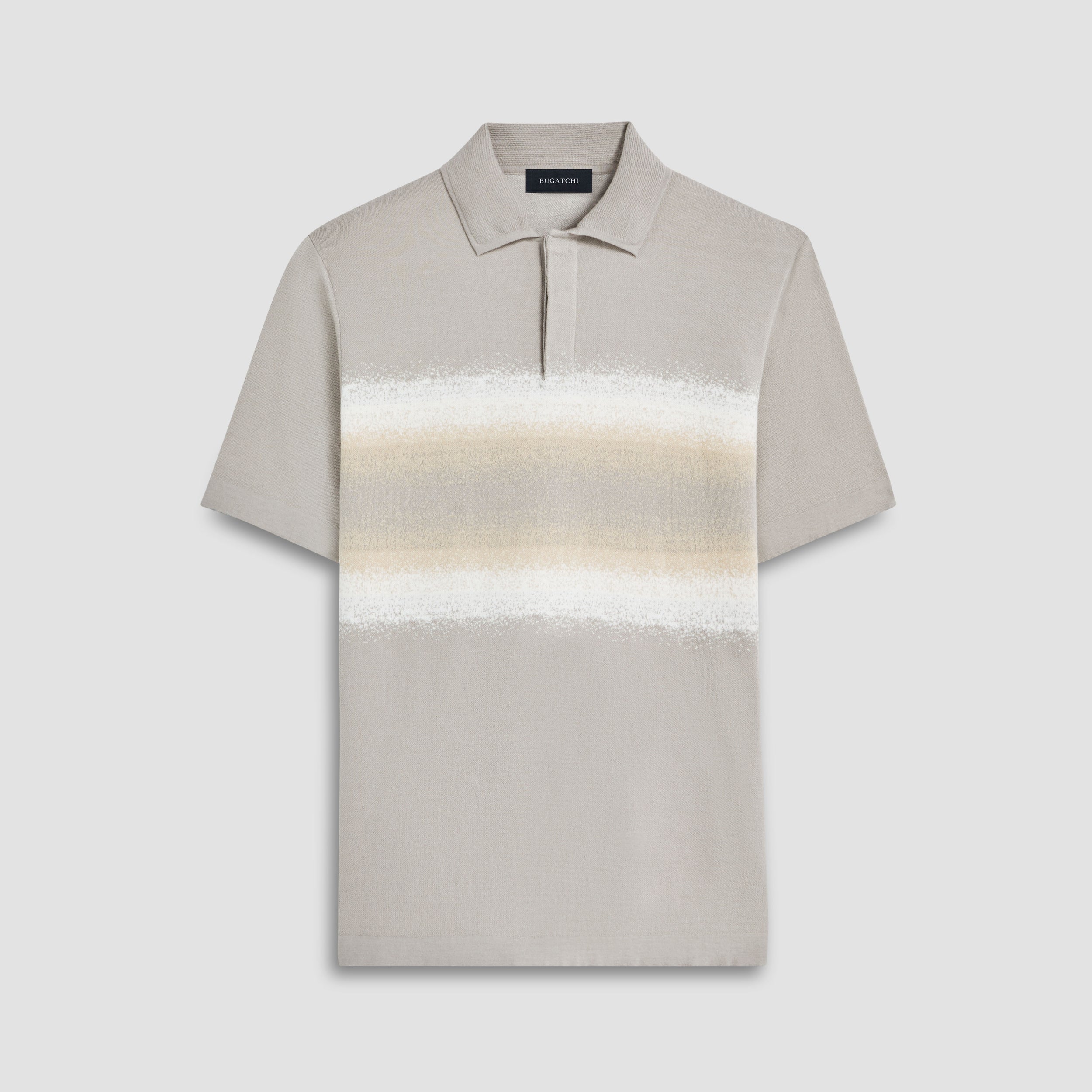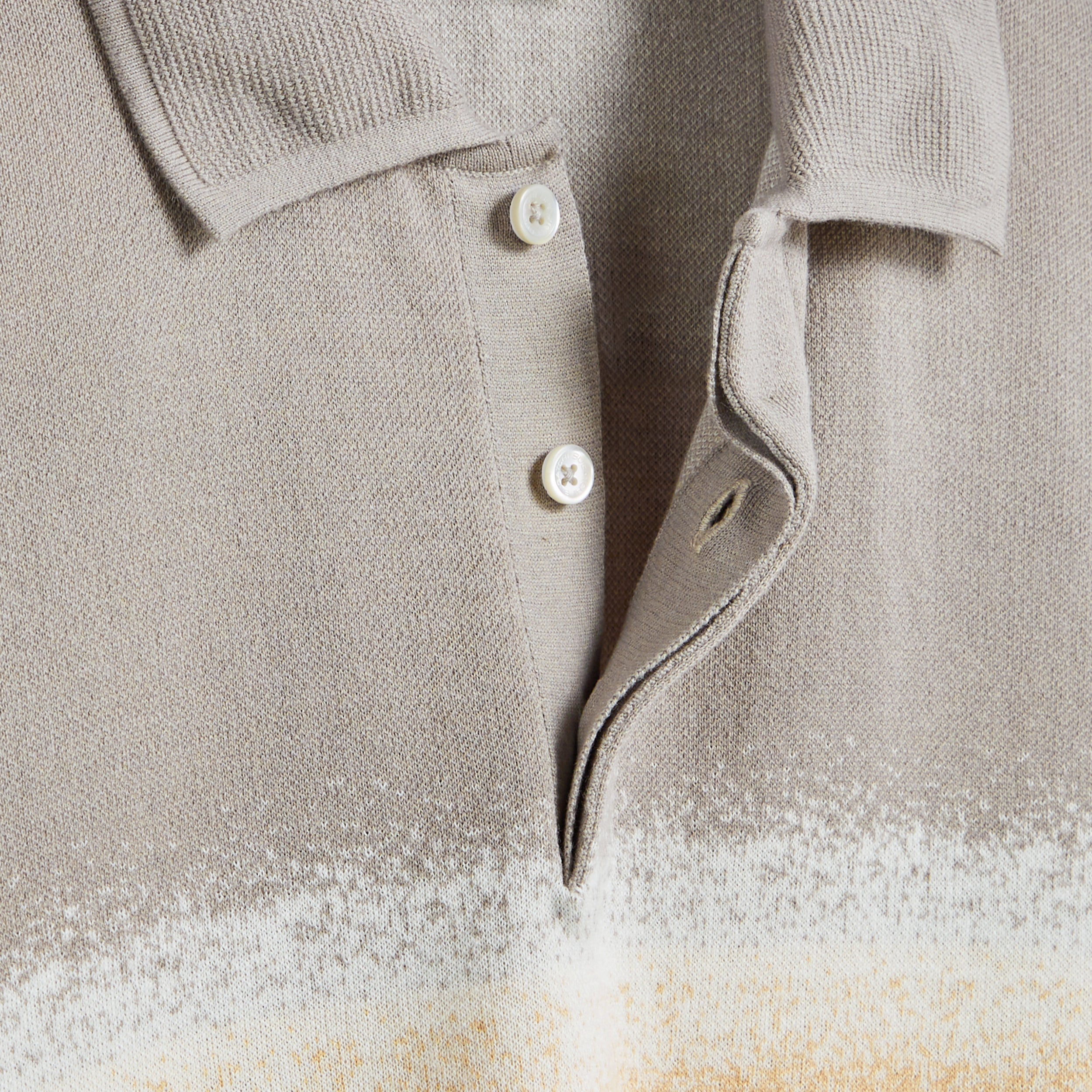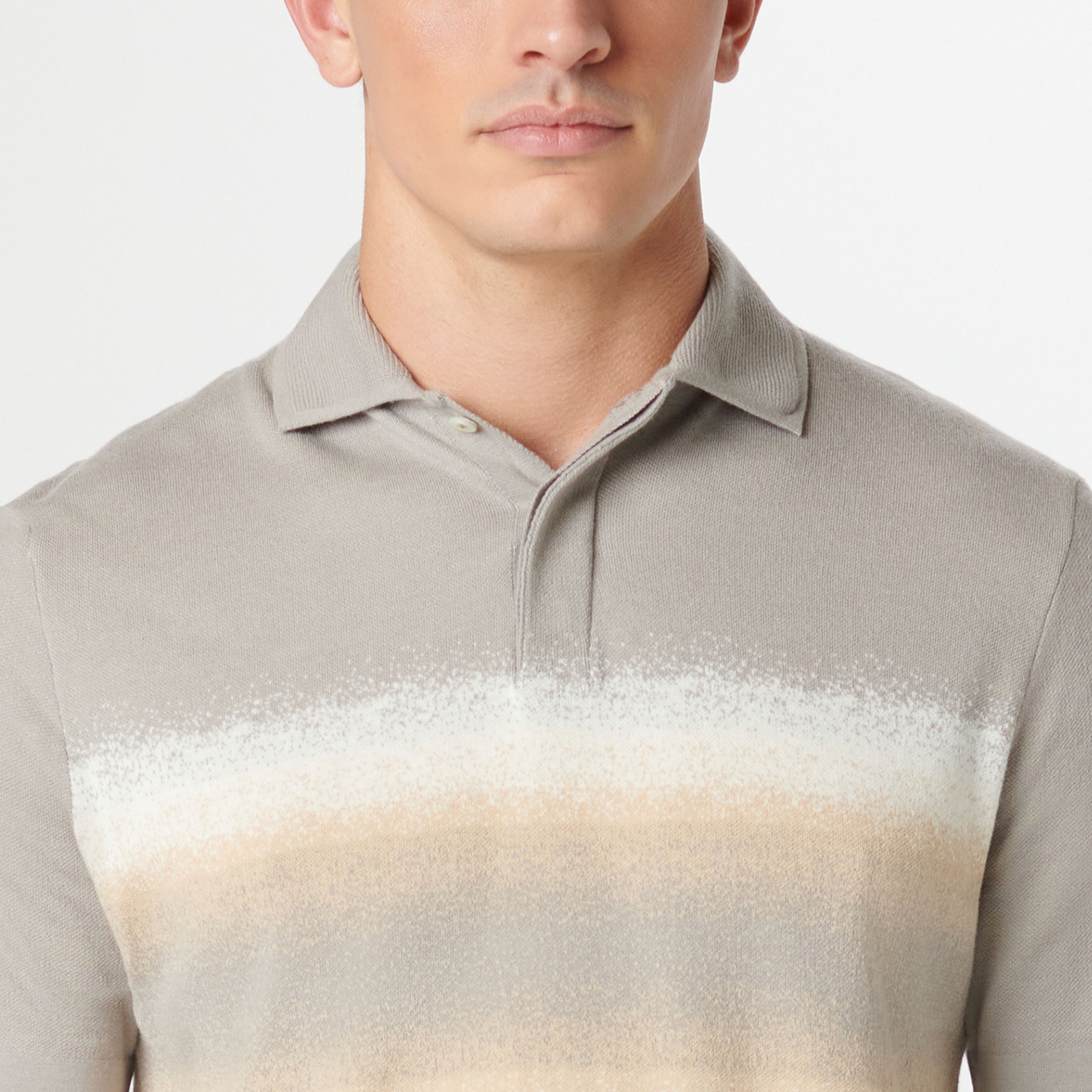 Crafted from a blend of cotton and silk yarns, this short-sleeved polo sweater features ombre stripes, a self collar, and a covered three-button placket. Lightweight, soft, and luxurious, this sweater is machine washable, low-pilling, and promises to retain its pristine appearance and refined quality over time.