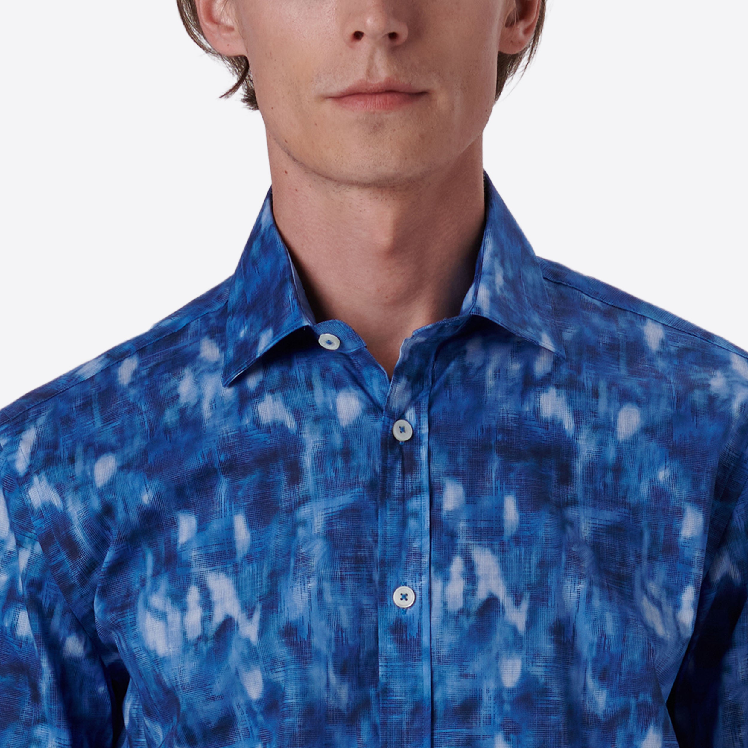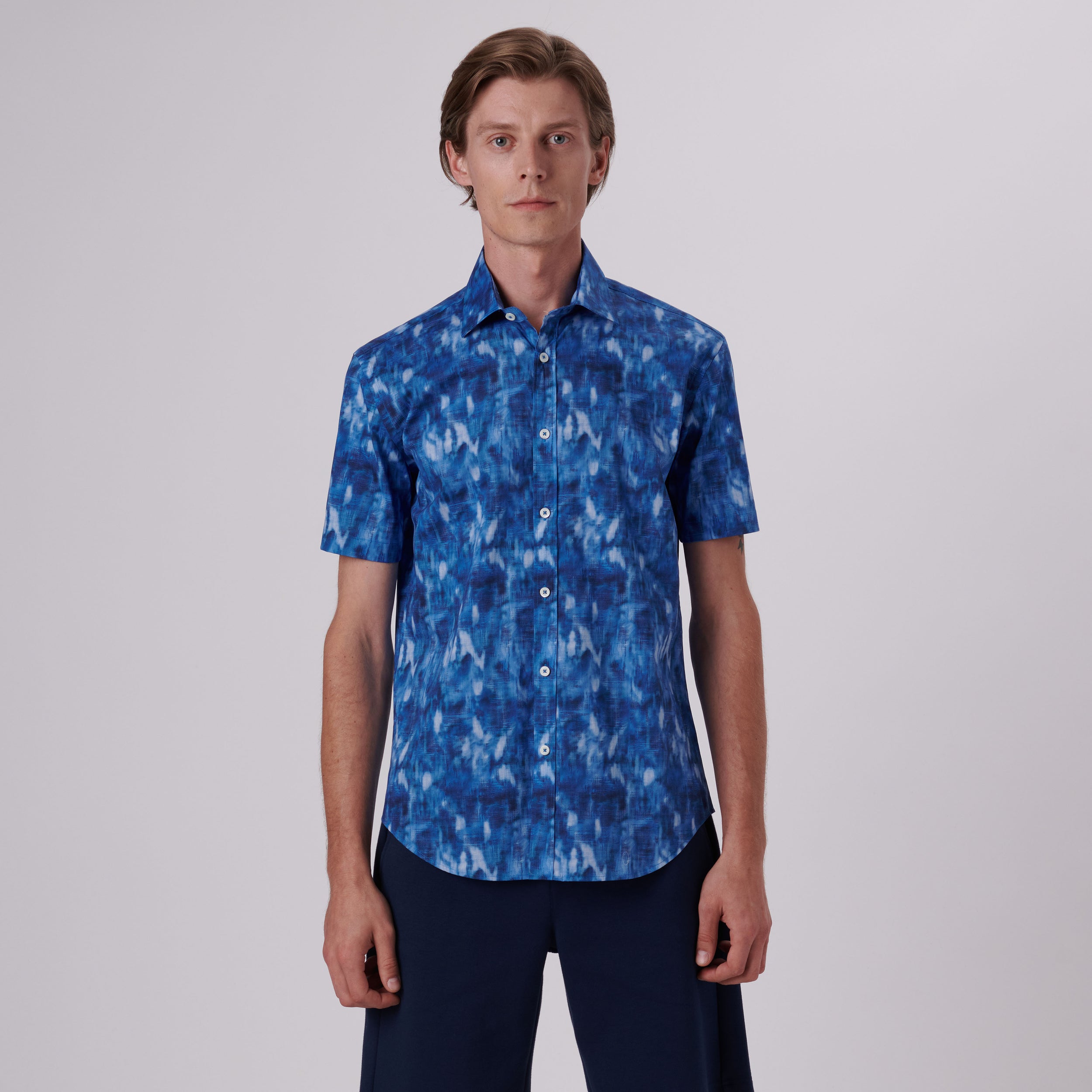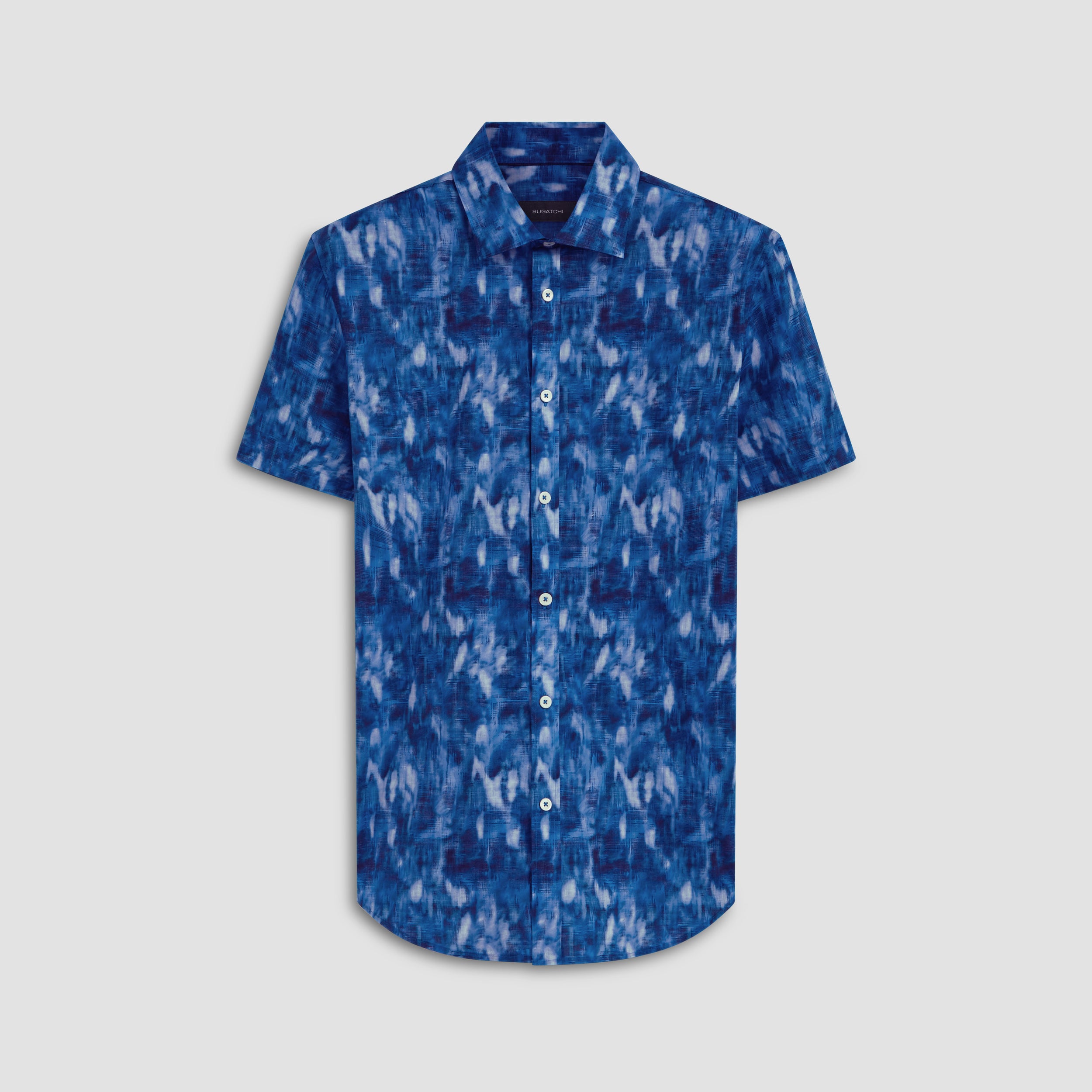 Orson abstract print short-sleeved shirt in comfort stretch cotton with point collar, genuine shell buttons and a curved hemline.