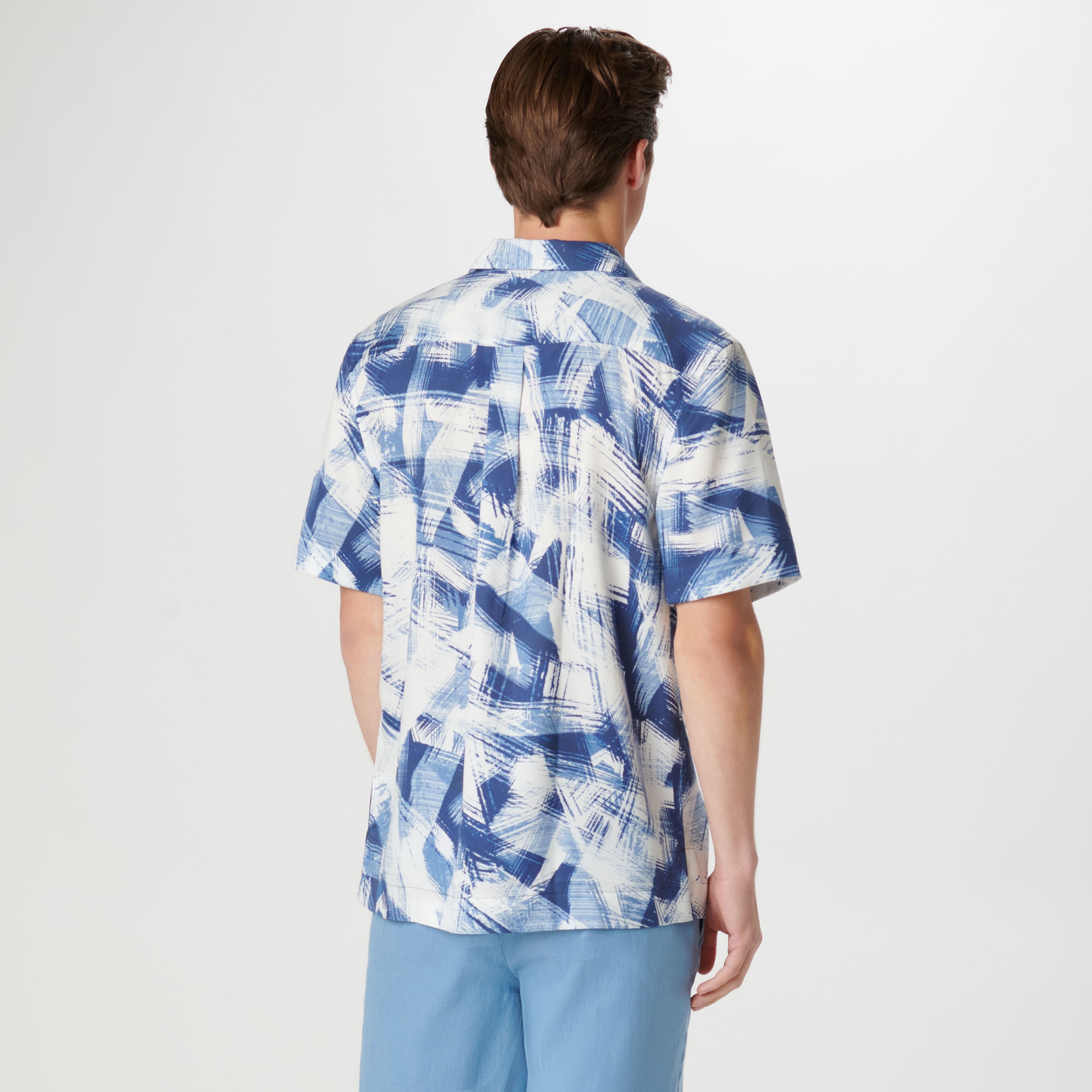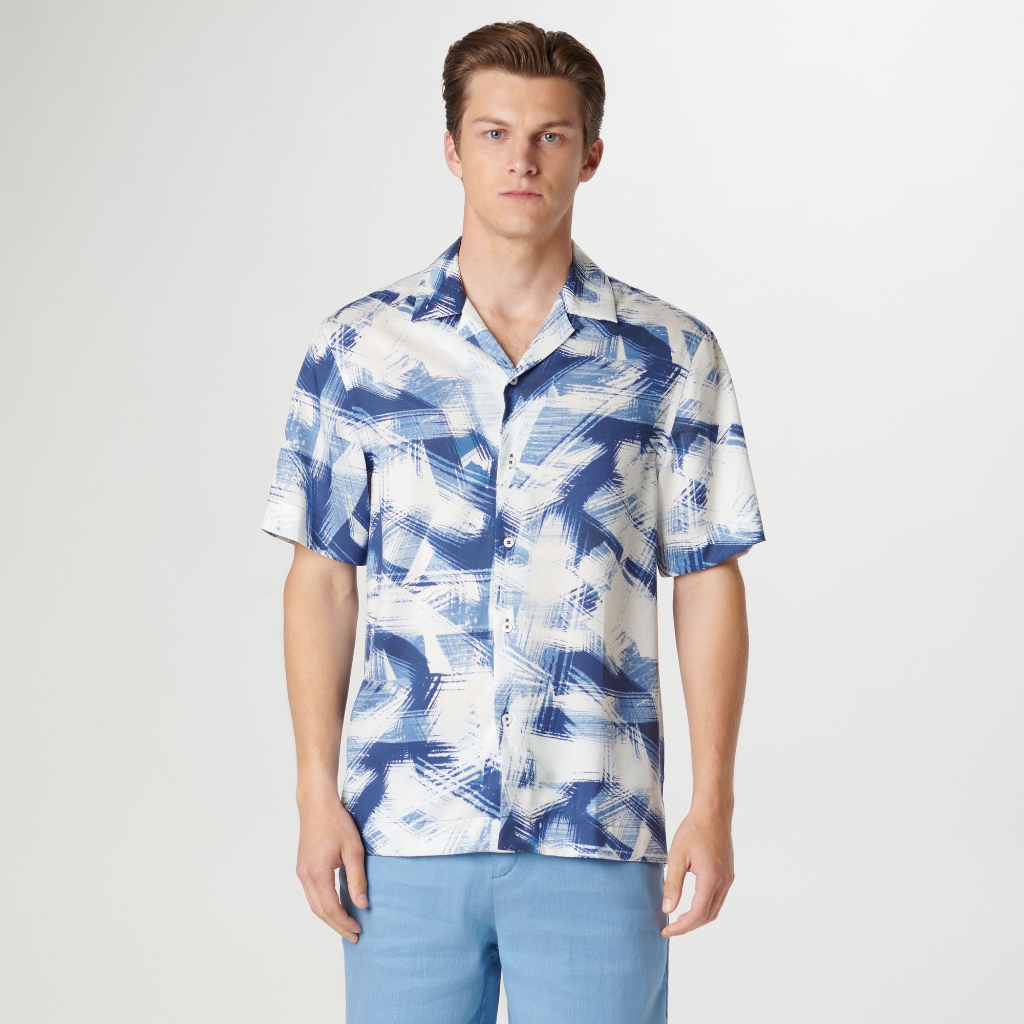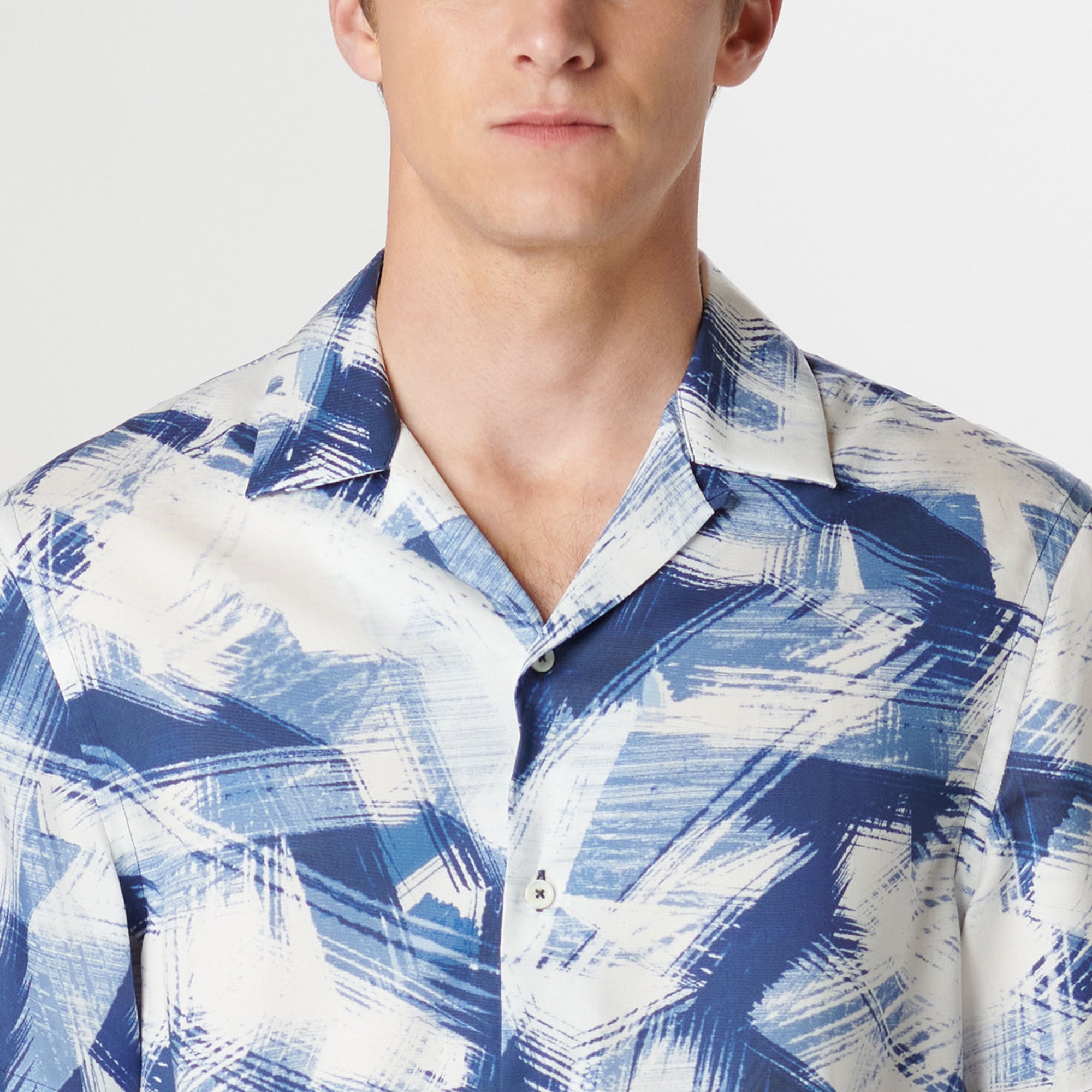 The Orson short-sleeved shirt is crafted from 100% sustainable lyocell and features an abstract print, a spread collar, and a curved hem.