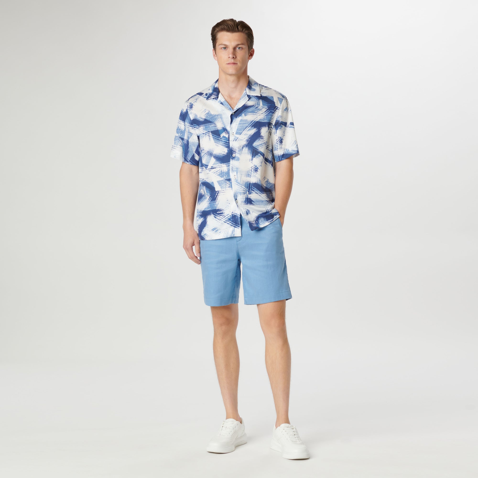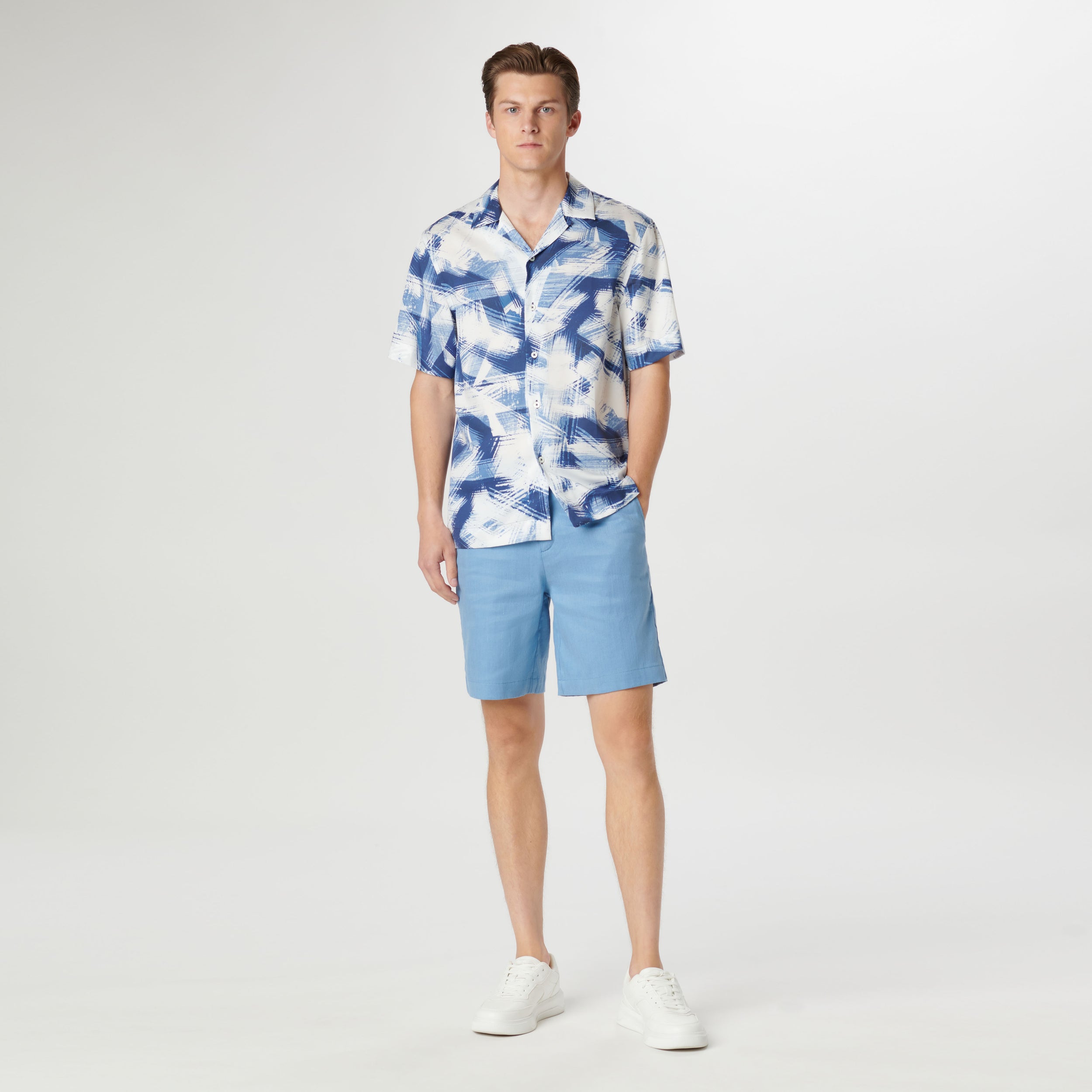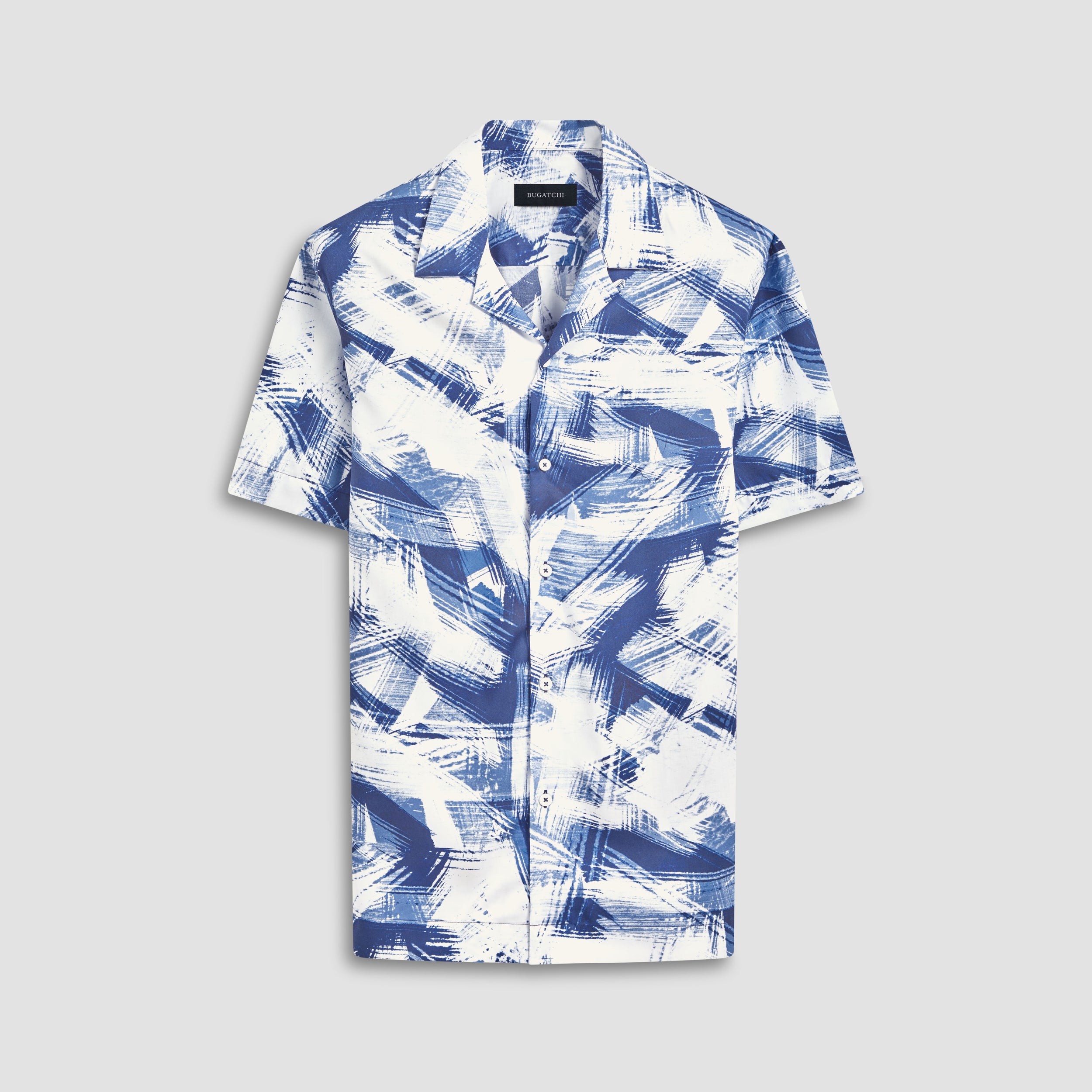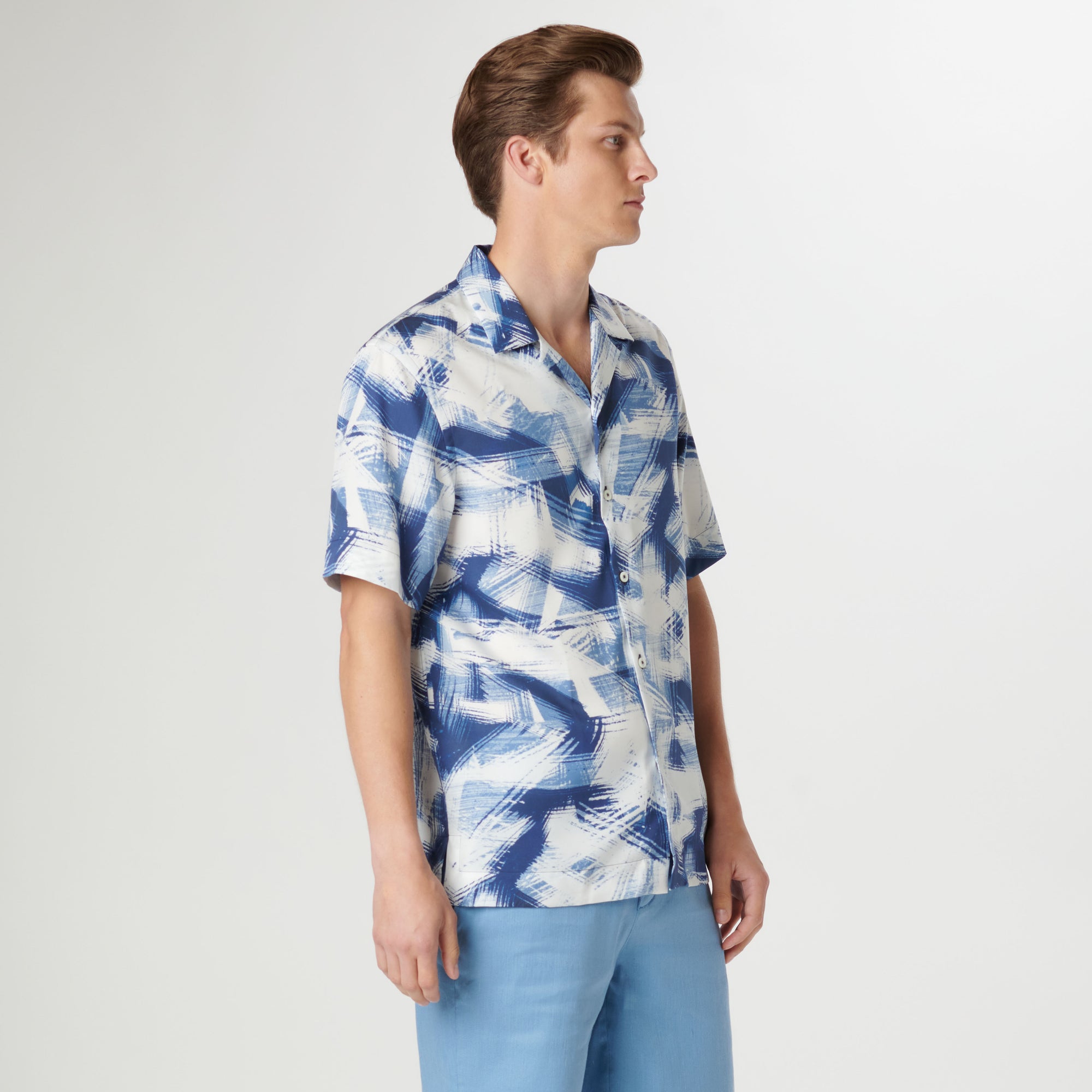 The Orson short-sleeved shirt is crafted from 100% sustainable lyocell and features an abstract print, a spread collar, and a curved hem.