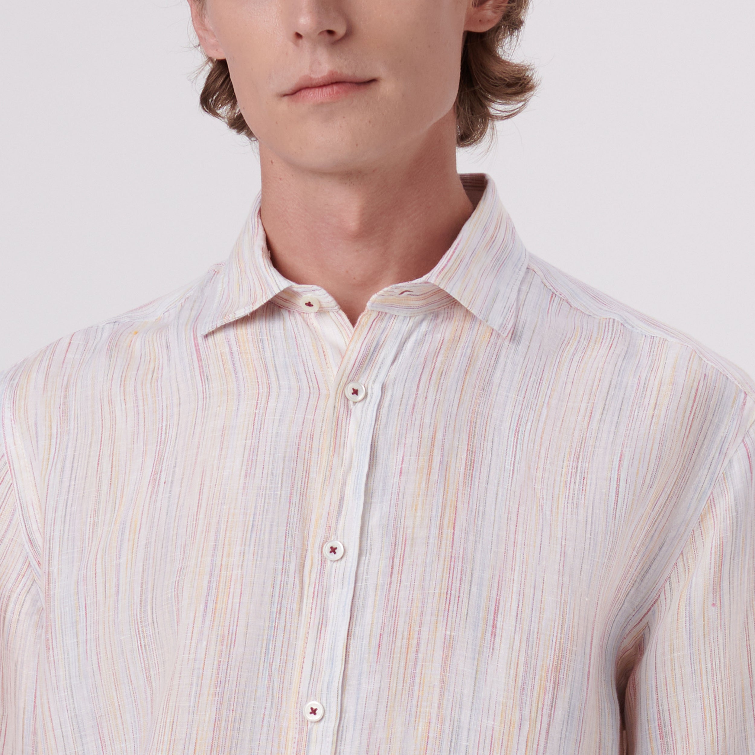 Orson chalk stripe short-sleeved shirt in 100% linen with point collar, genuine shell buttons and a curved hemline.