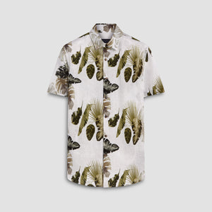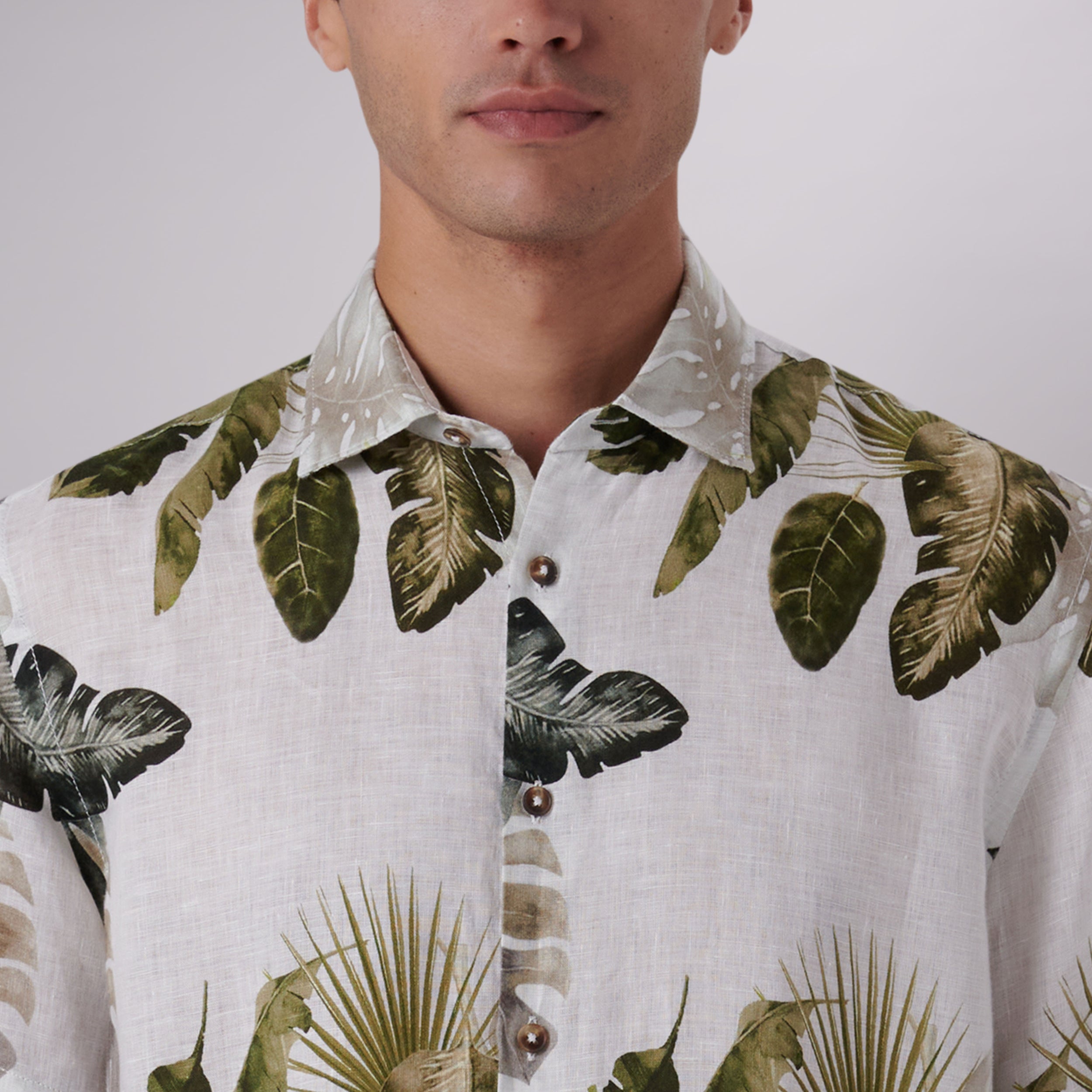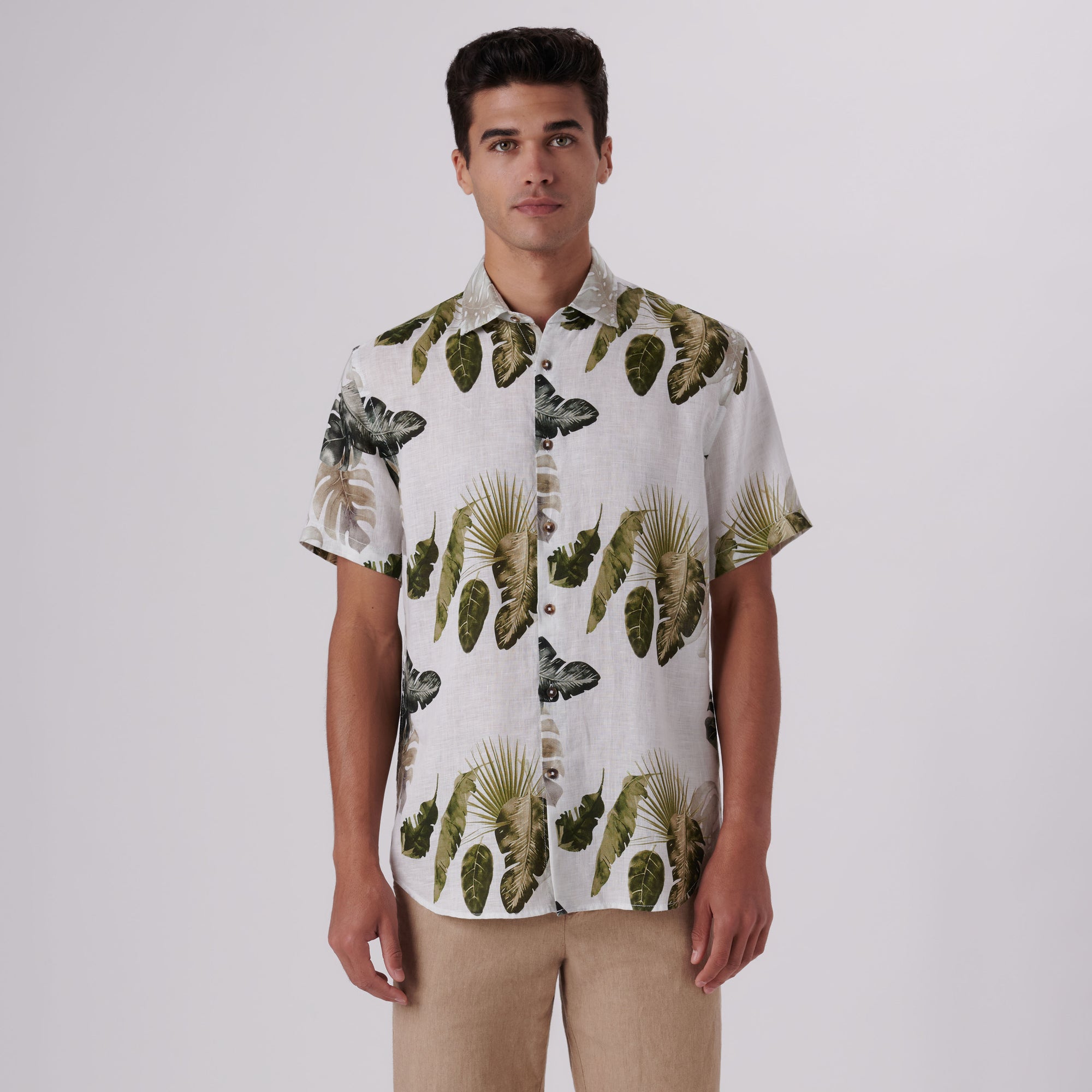 Orson leaf print short-sleeved shirt in 100% linen with point collar, French placket, genuine shell buttons and a curved hemline.
