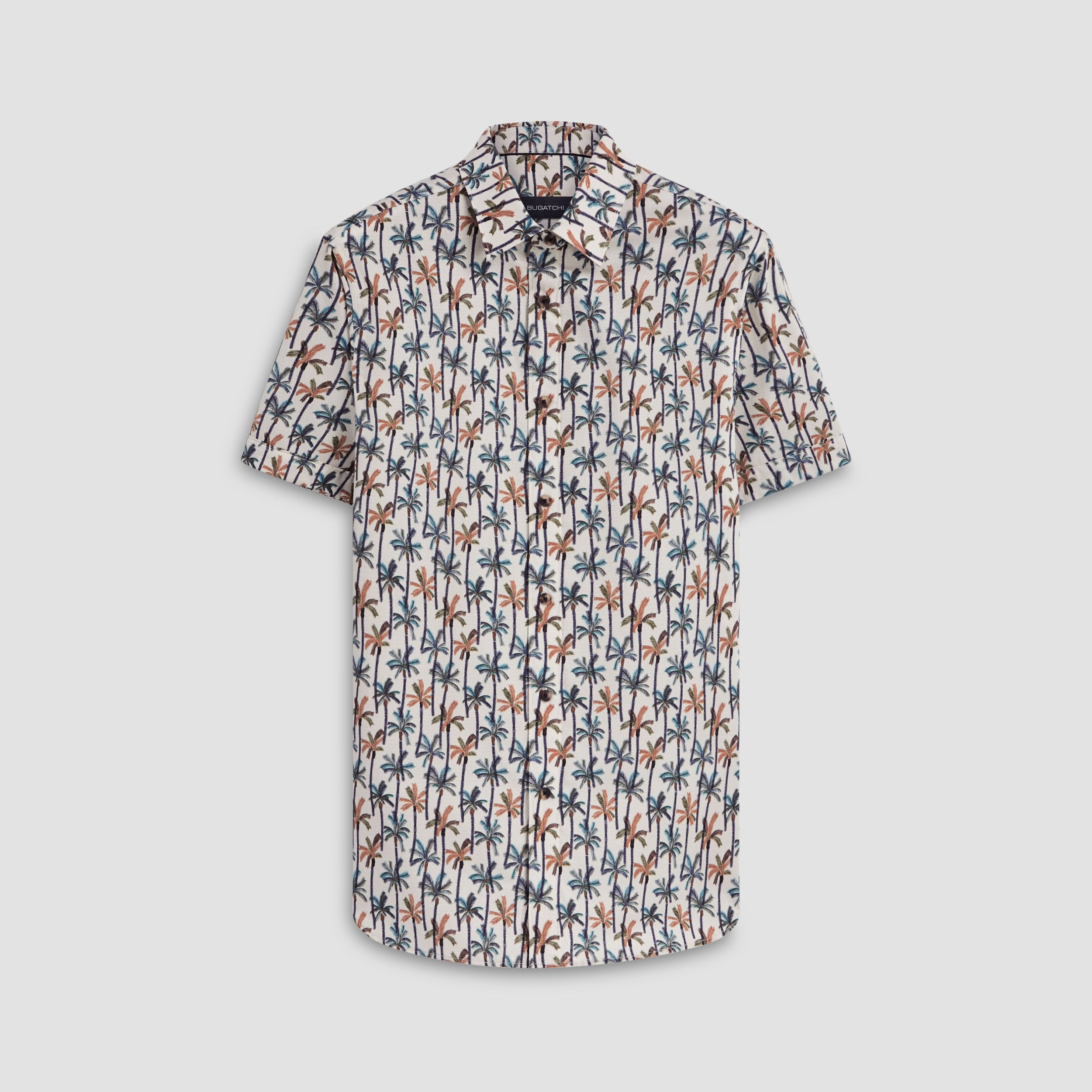 Orson palm tree print short-sleeved shirt in 100% cotton with point collar, French placket, genuine shell buttons and a curved hemline.