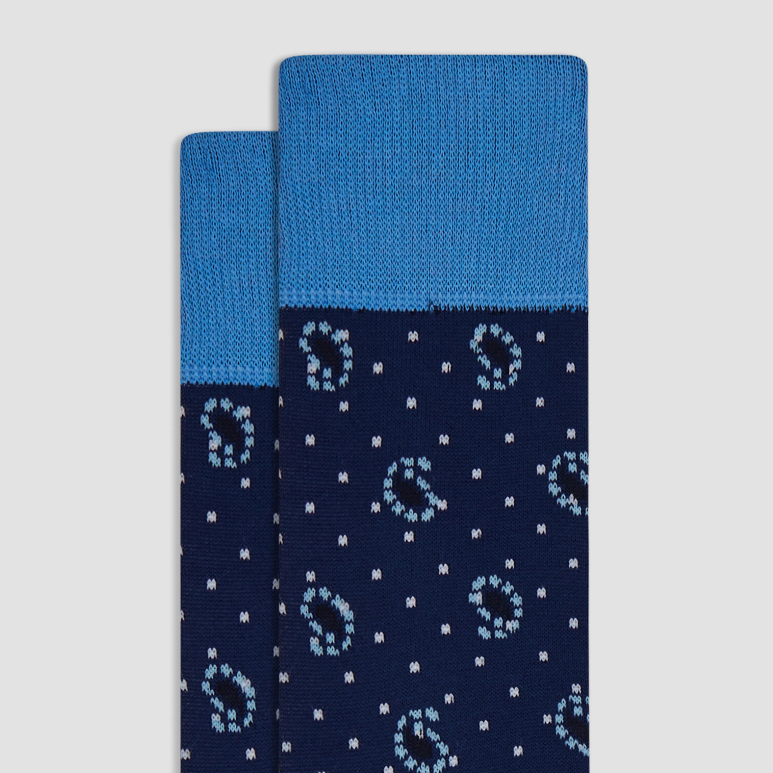 Paisley mid-calf socks in fine cotton and silk blend with rib knit cuff band, hand linked toe and reinforced heel seams. Made in Italy.