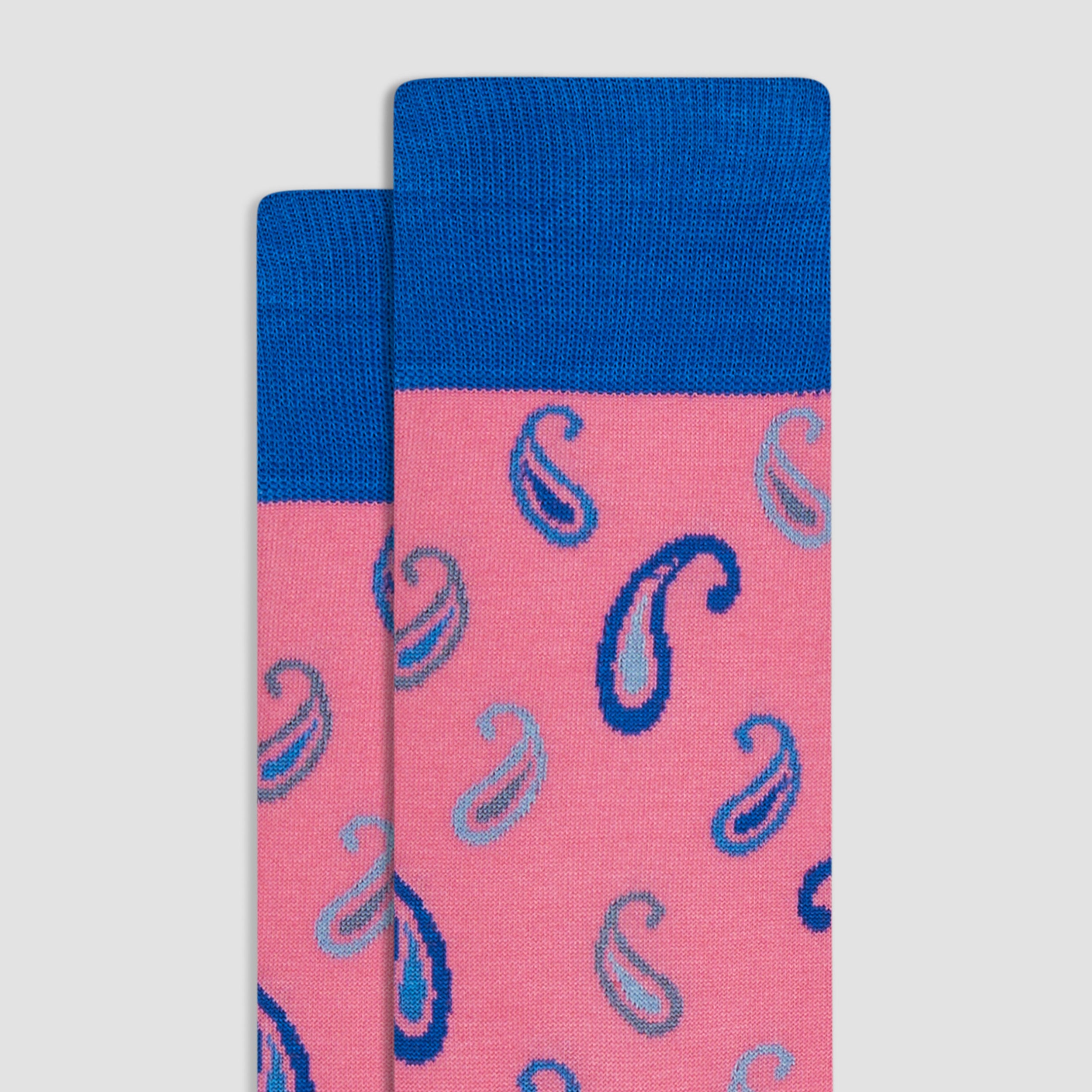Paisley mid-calf socks in fine gauge mercerized cotton blend with rib knit cuff band, hand linked toe and reinforced heel seams. Made in Italy.