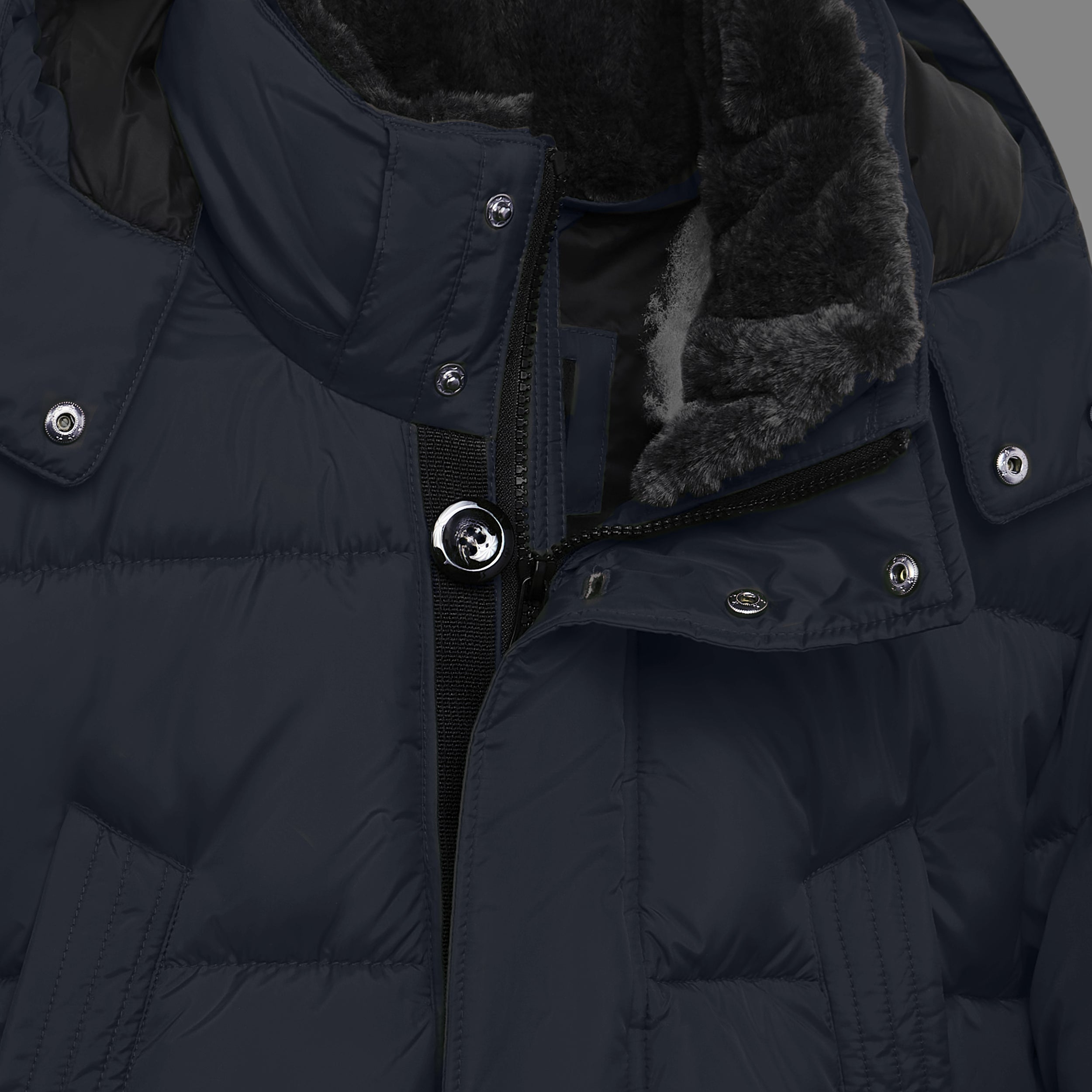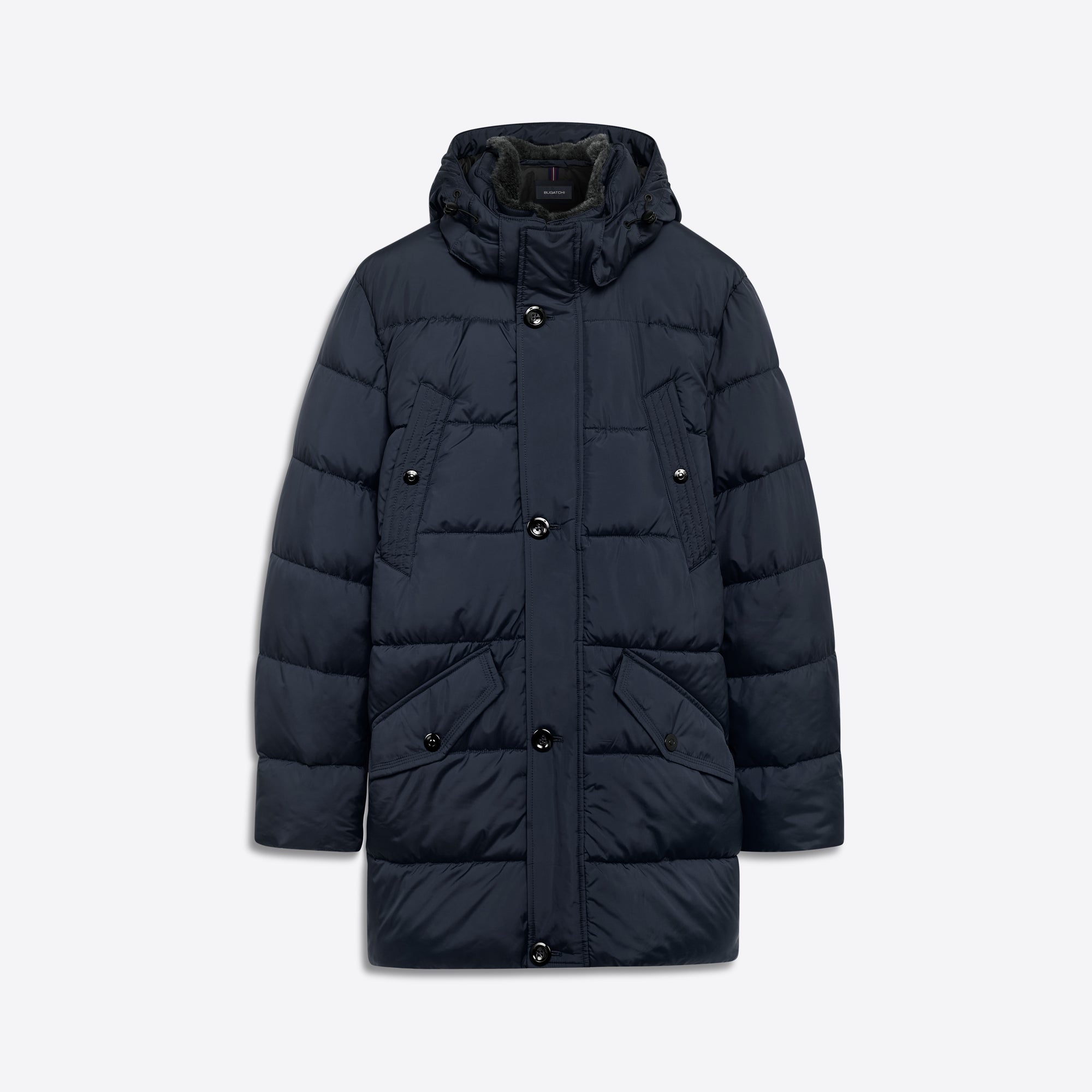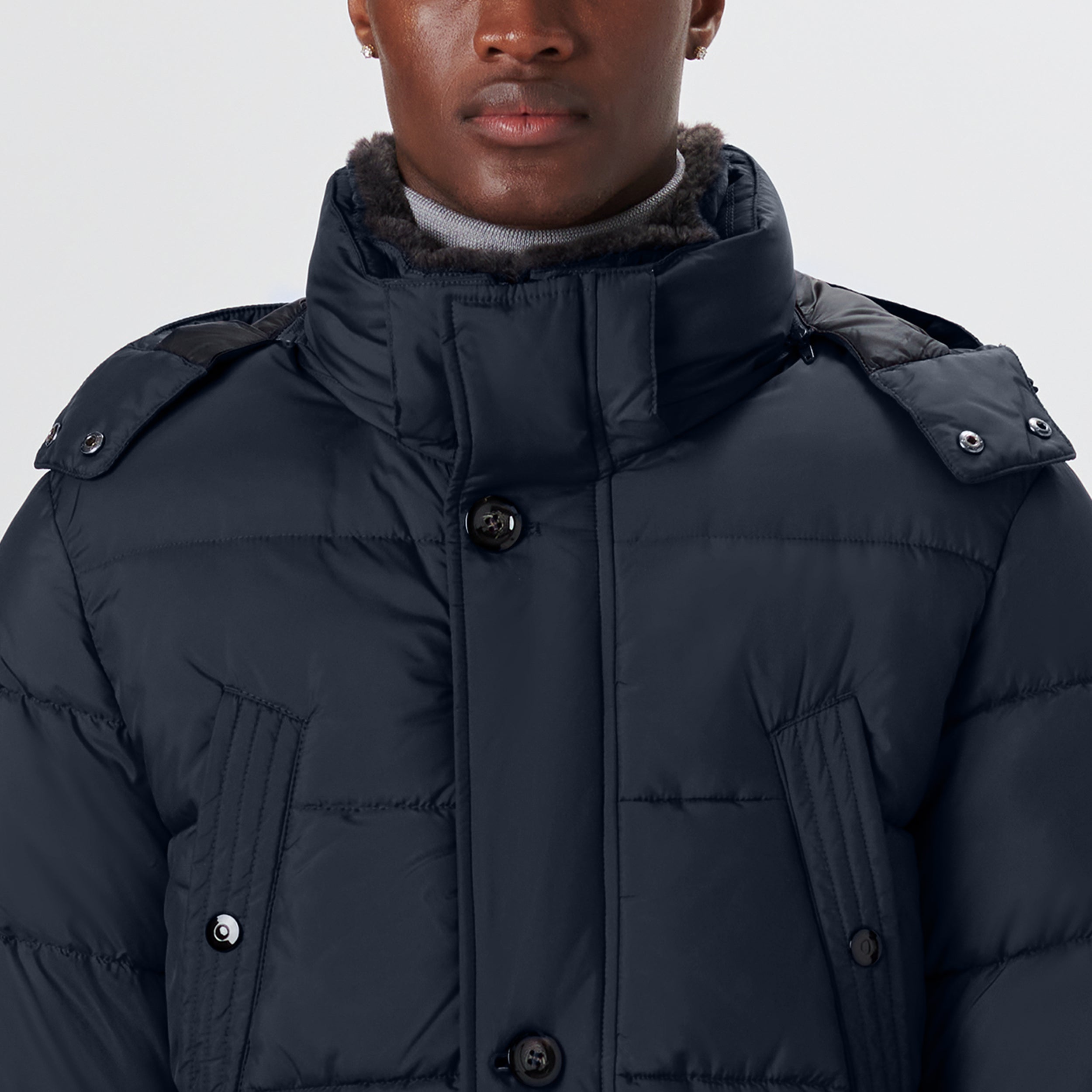 Water repellent, certified Sorona Aura filled puffer parka with removable hood, faux-fur collar, two-way zipper and buttons closure, and four pockets. Sorona Aura is a lightweight and breathable insulation with long-lasting shape retention and warmth. Outerwear made from this innovative and partially plant-based insulation benefit from exceptional breathability and comfort, at a lower environmental footprint.