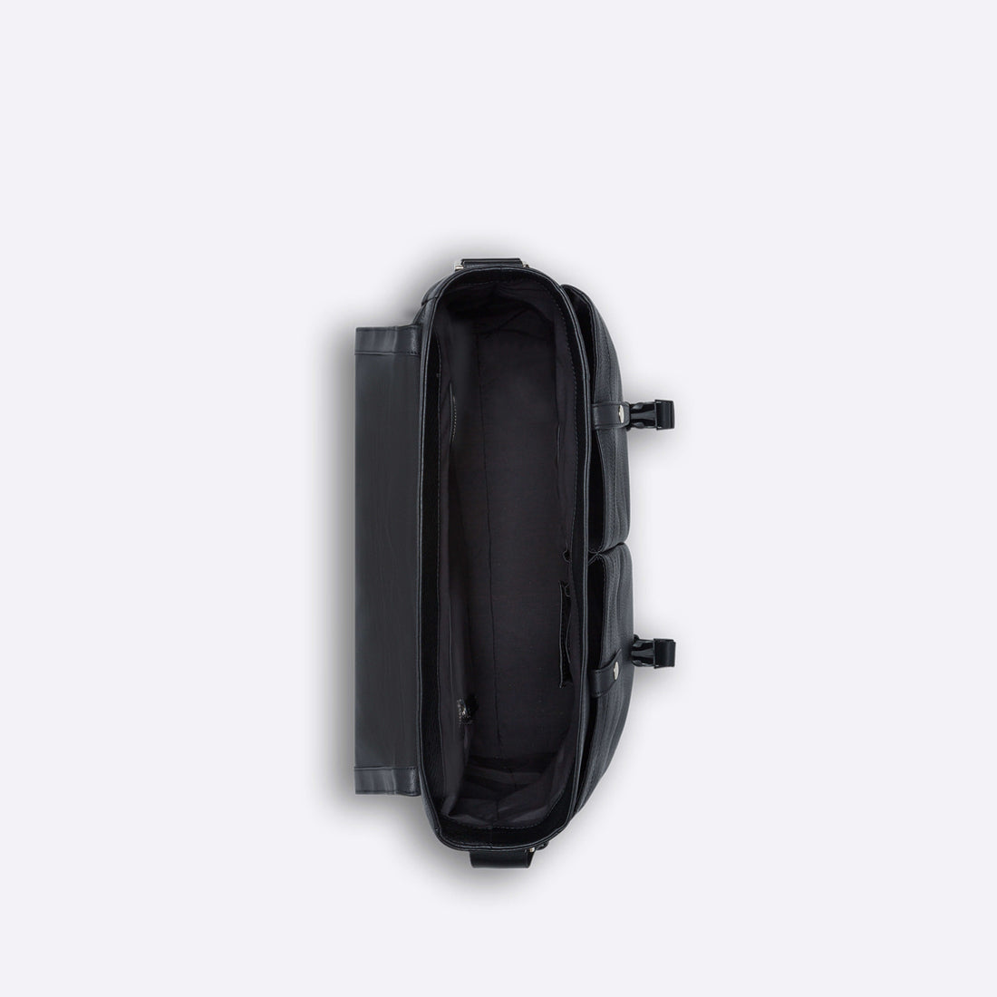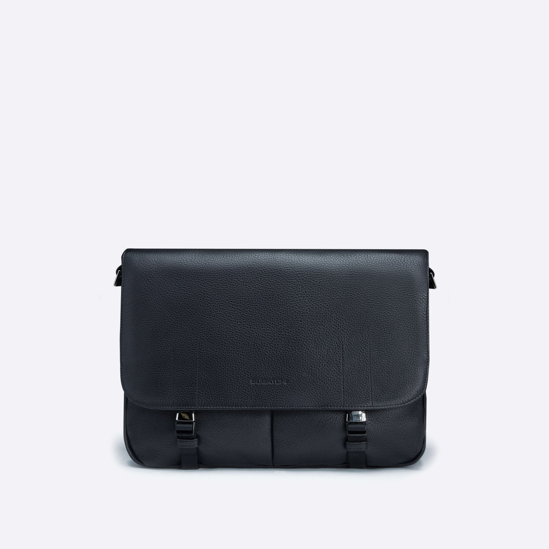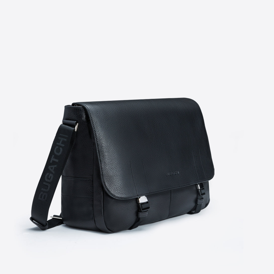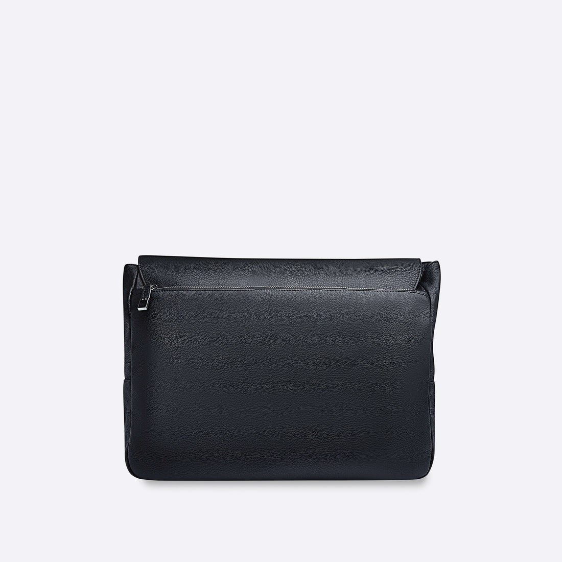Full grain Pebble leather messenger bag with adjustable flat logo shoulder strap snap compartments beneath flap one interior zipped pocket and multiple slip pockets. Stamped logo silver tone hardware black ottoman lining and tonal stitching.