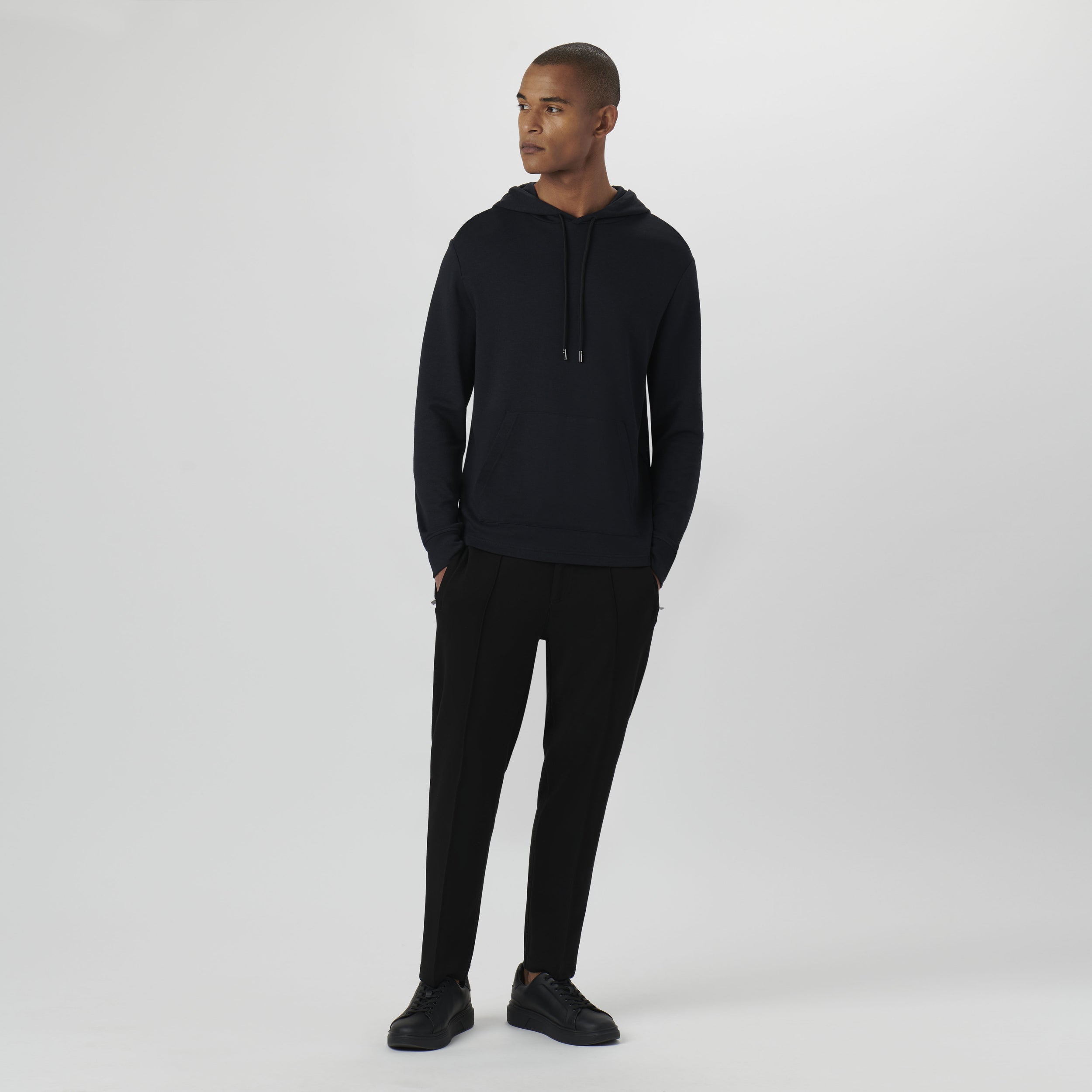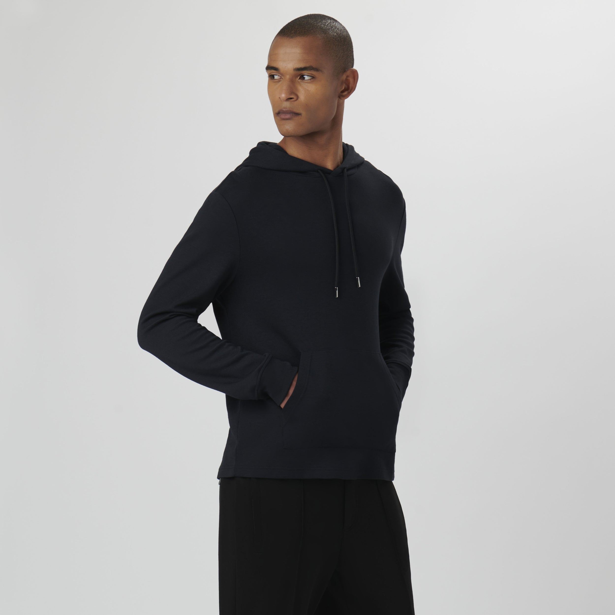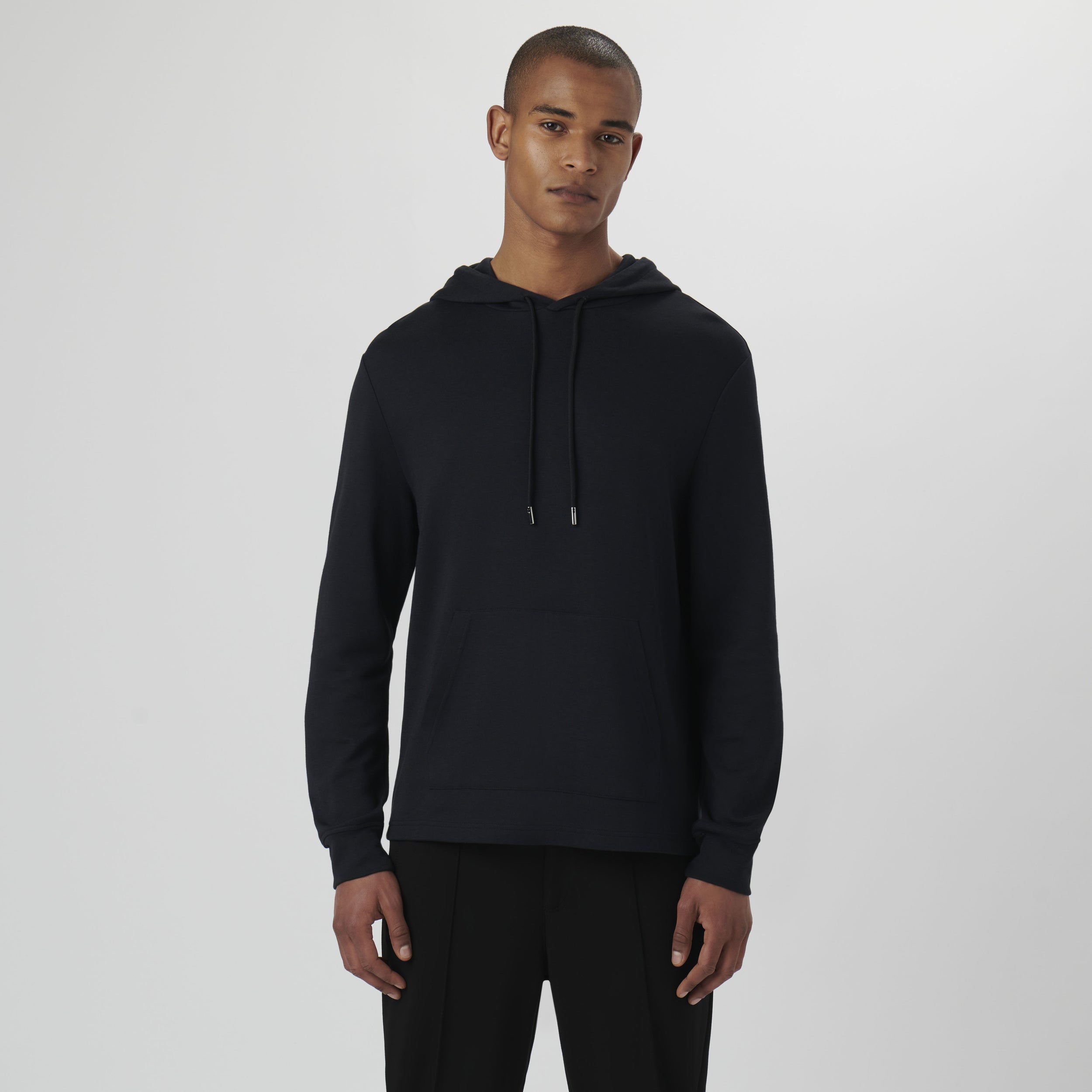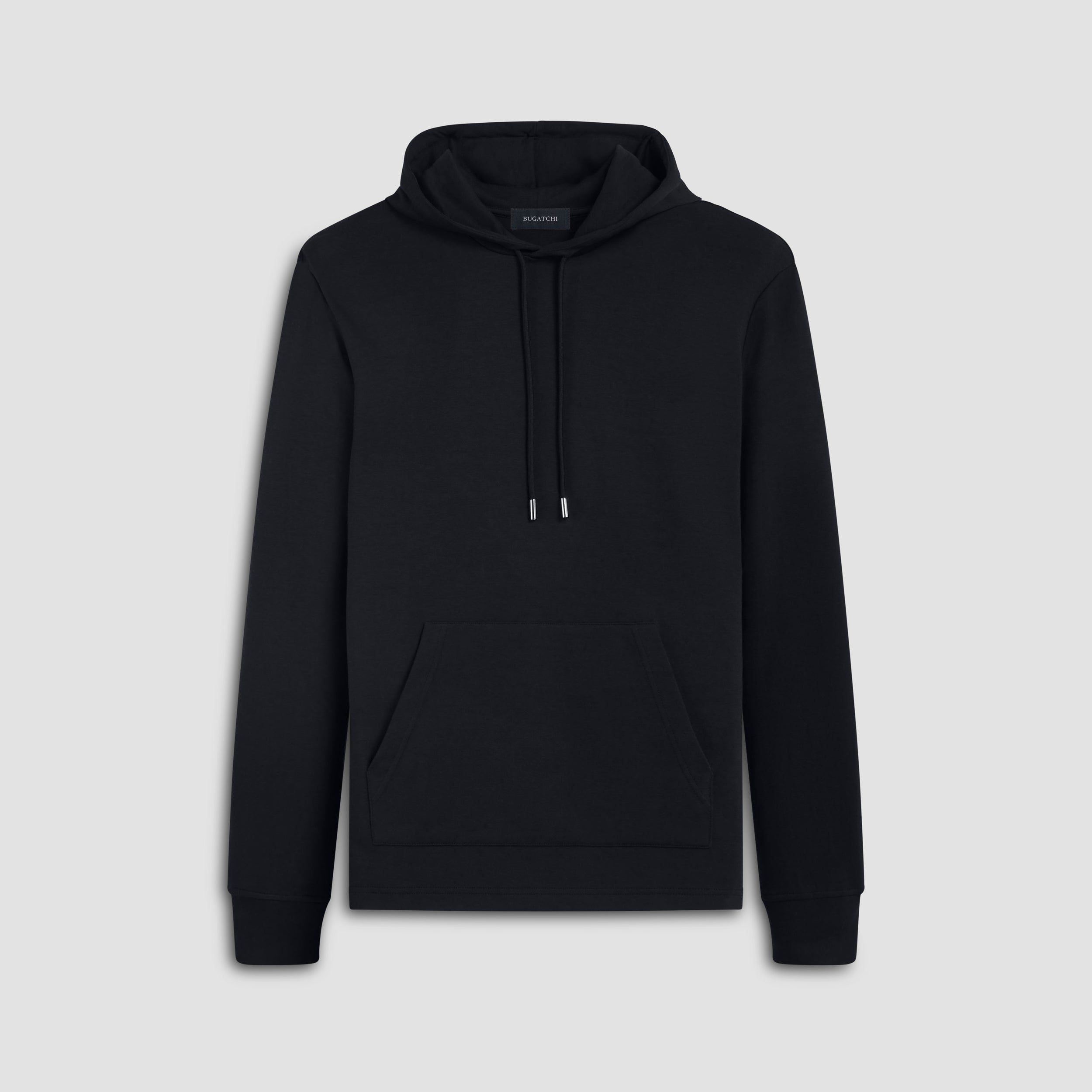 Long-sleeved pullover in soft touch cotton blend with adjustable drawstring hood and kangaroo pockets.
