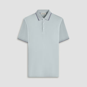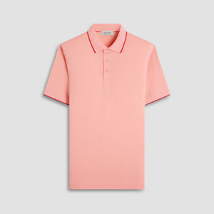 This short-sleeve polo combines luxury and performance with a blend of Tencel, polyester, cotton, and silk in a textured pique knit. The solid ribbed collar and armbands feature contrast tipping for a sleek look, while a subtle ribbon detail inside the placket adds a hidden touch of sophistication. Finished with mother of pearl buttons, this polo is perfect for both golf and casual wear, offering style and comfort for any occasion.