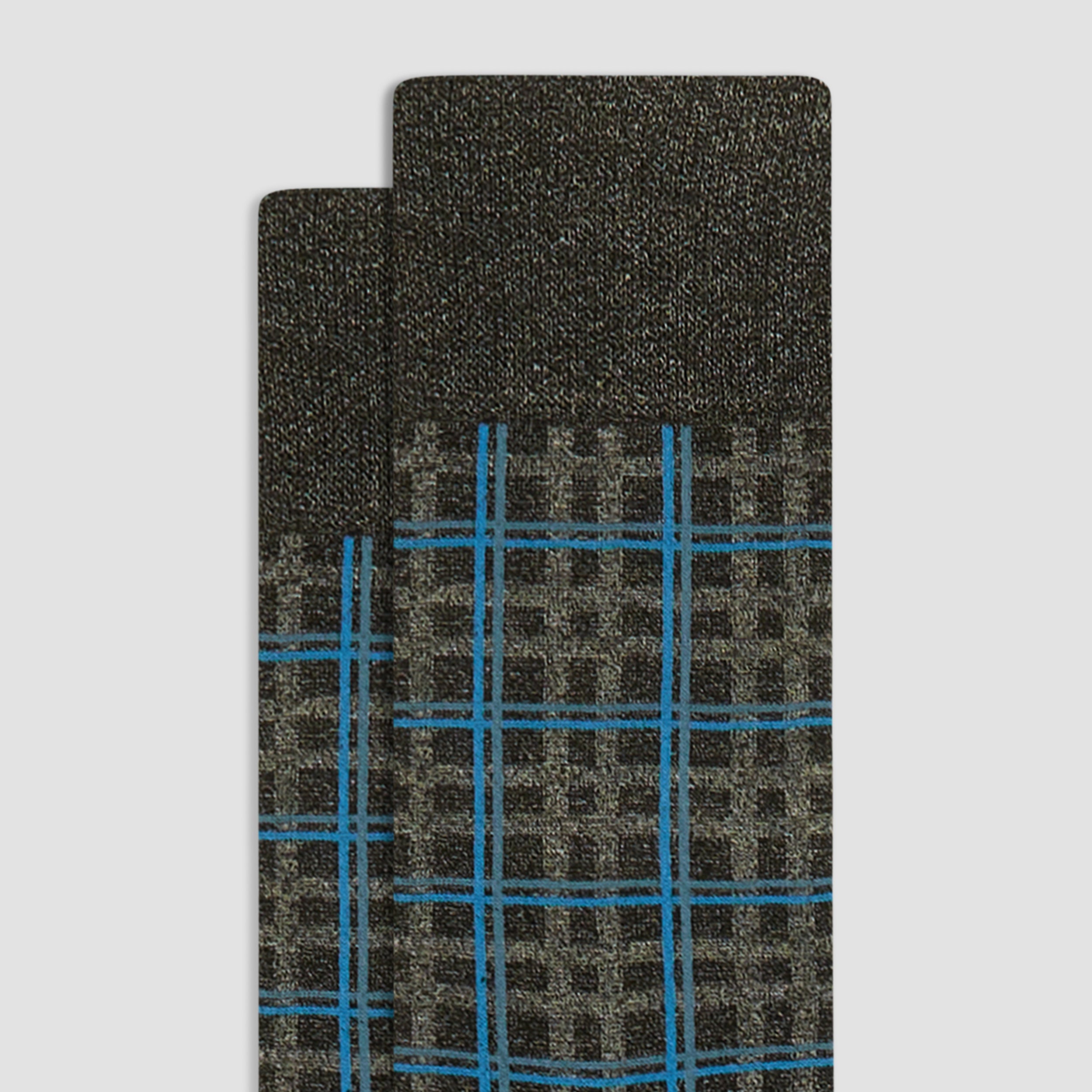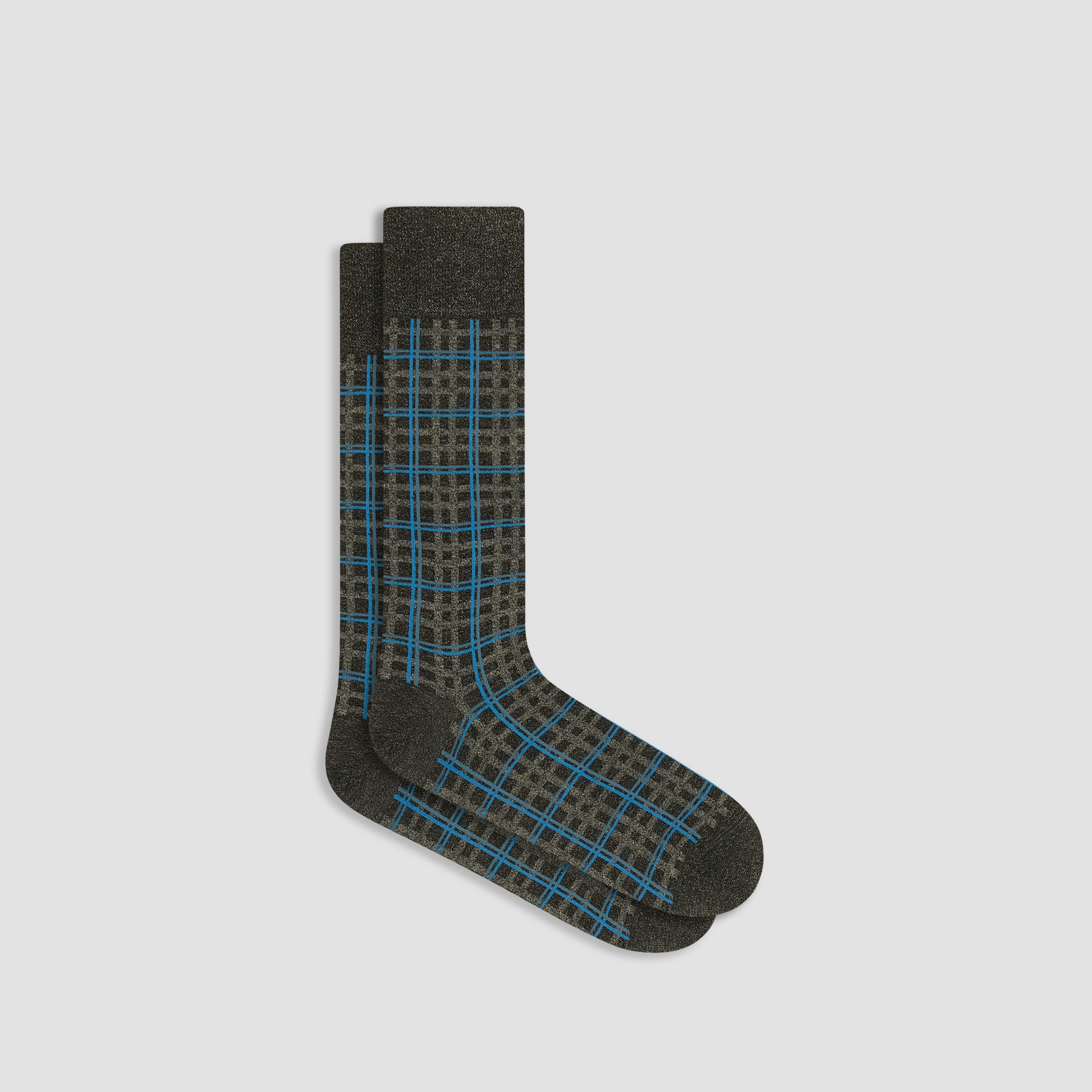Plaid check mid-calf socks in fine gauge mercerized cotton blend with rib knit cuff band, hand linked toe and reinforced heel seams. Made in Italy.