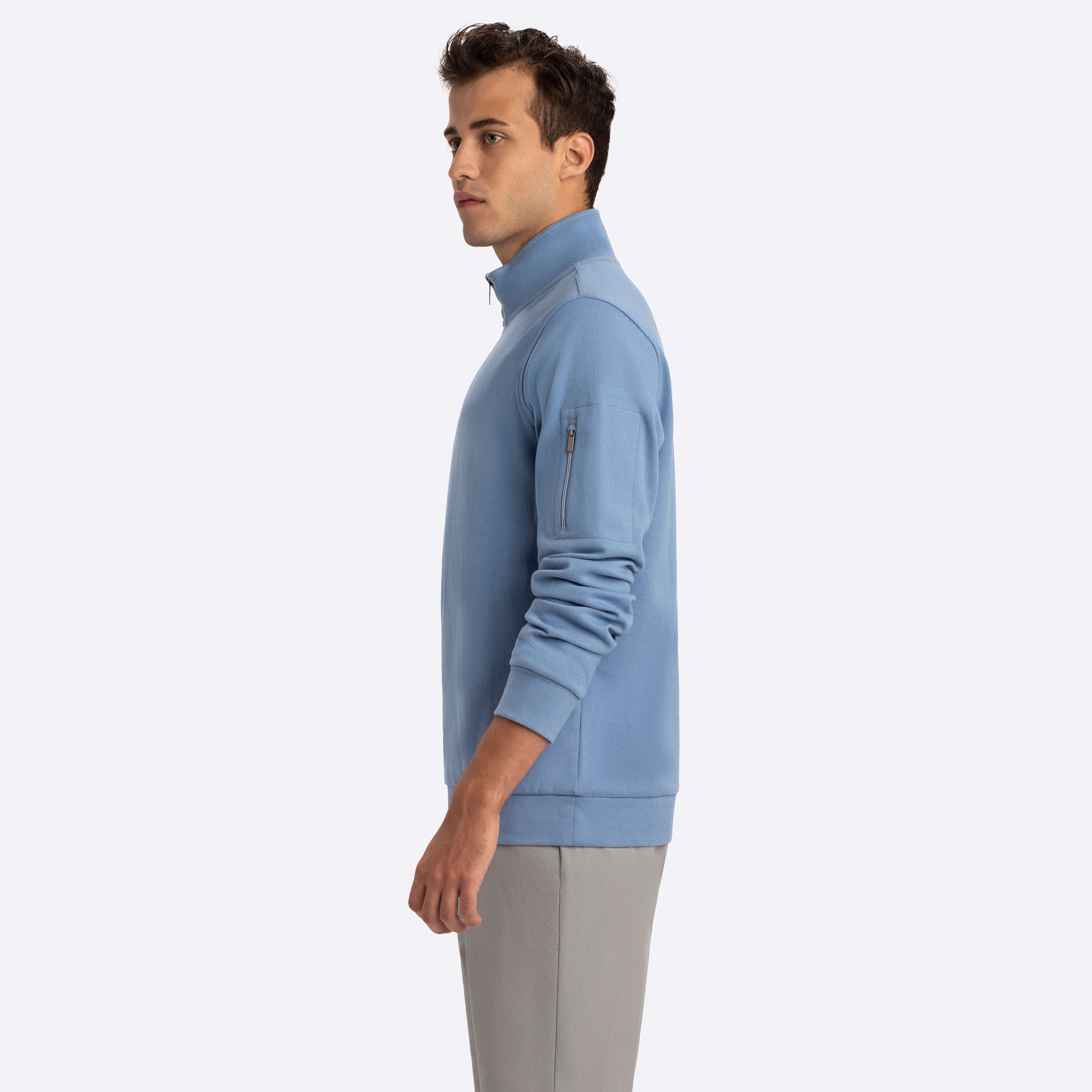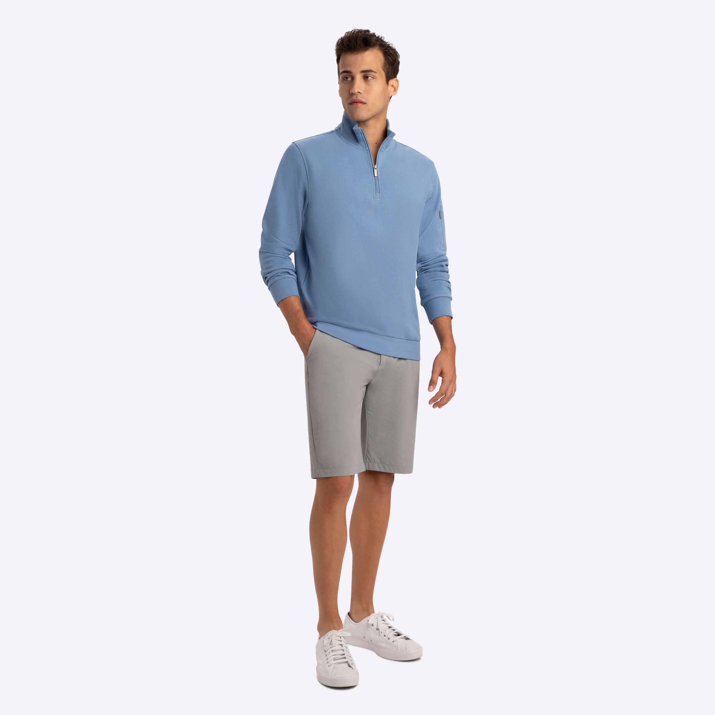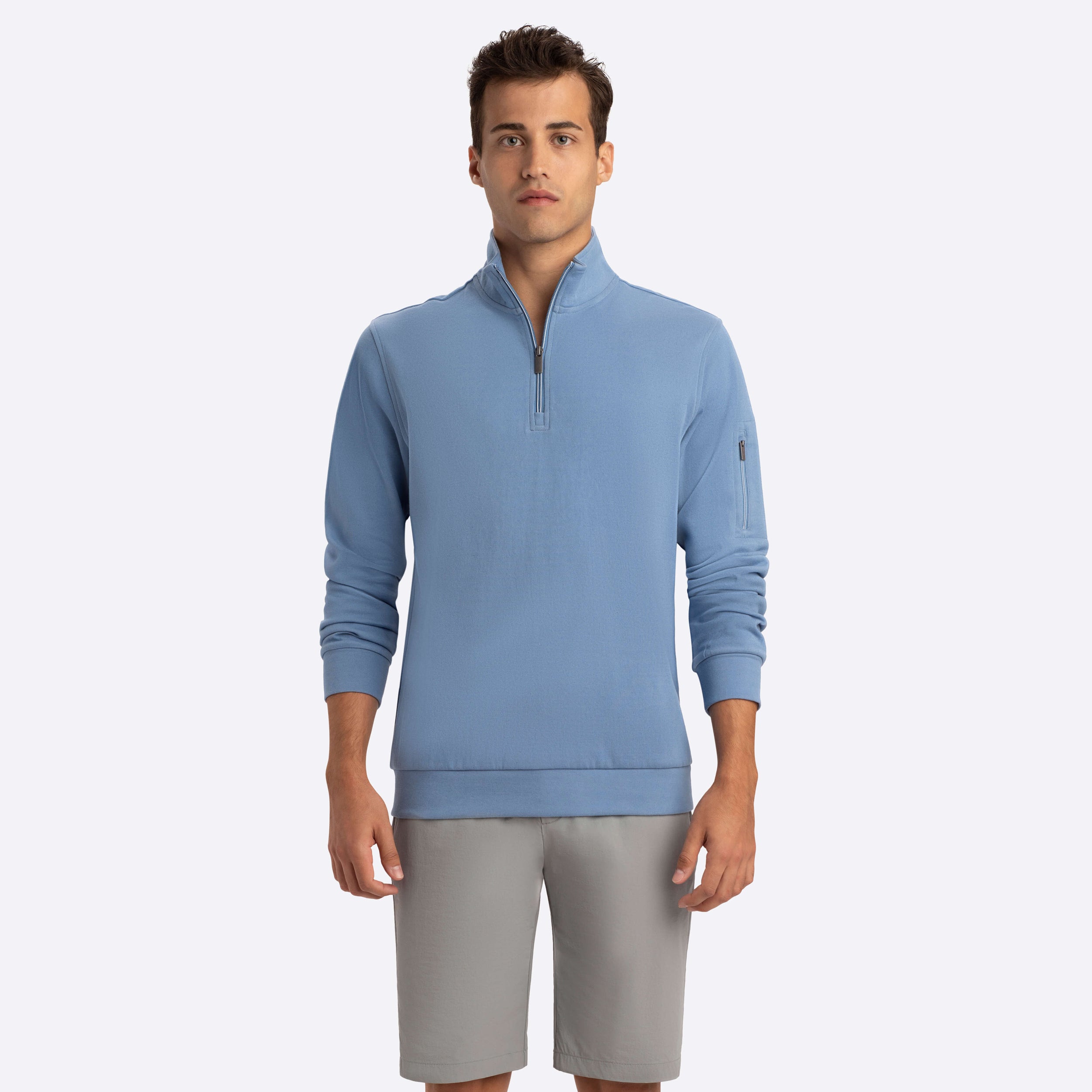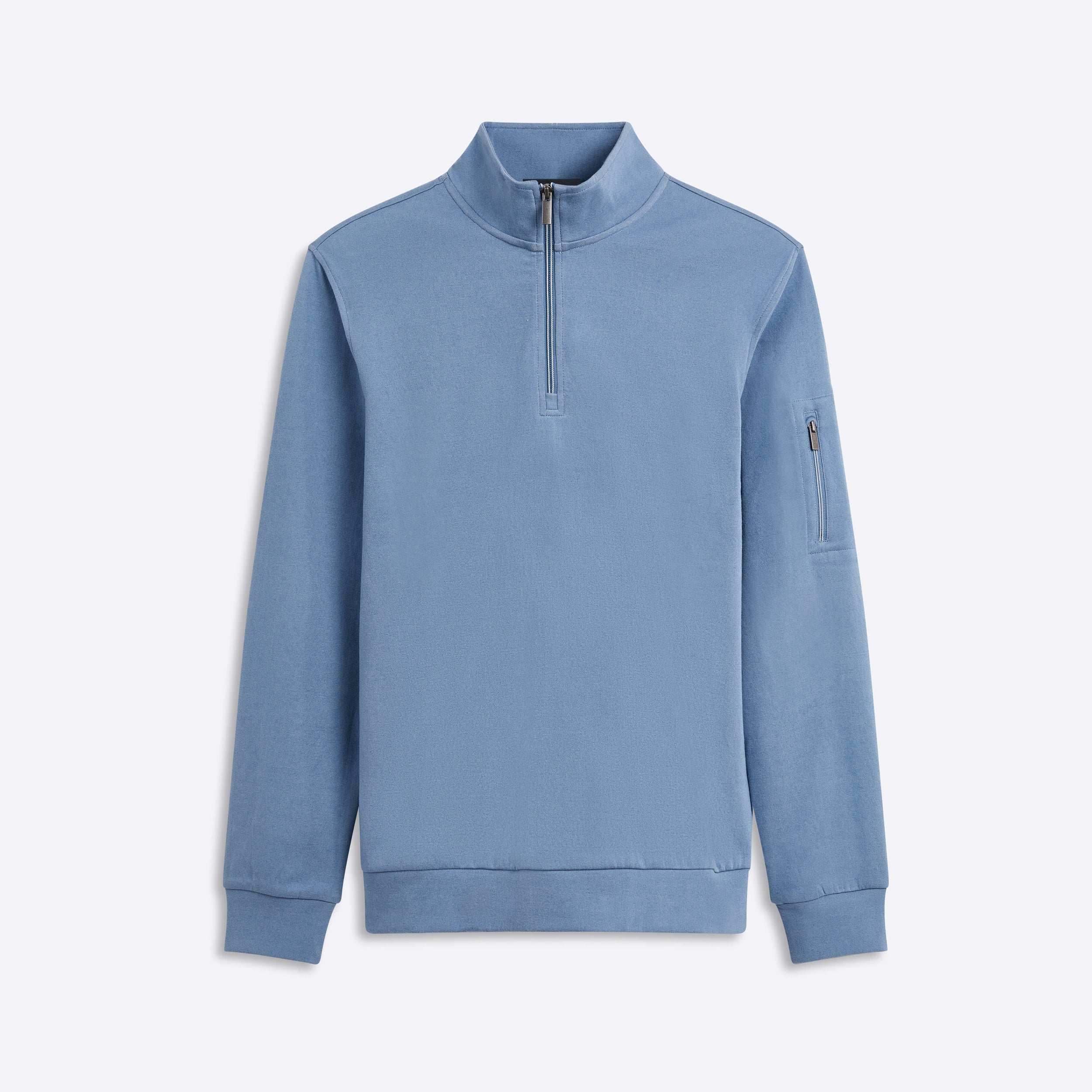 Long sleeve solid quarter zip mock neck in cotton blend features a zip sleeve pocket.