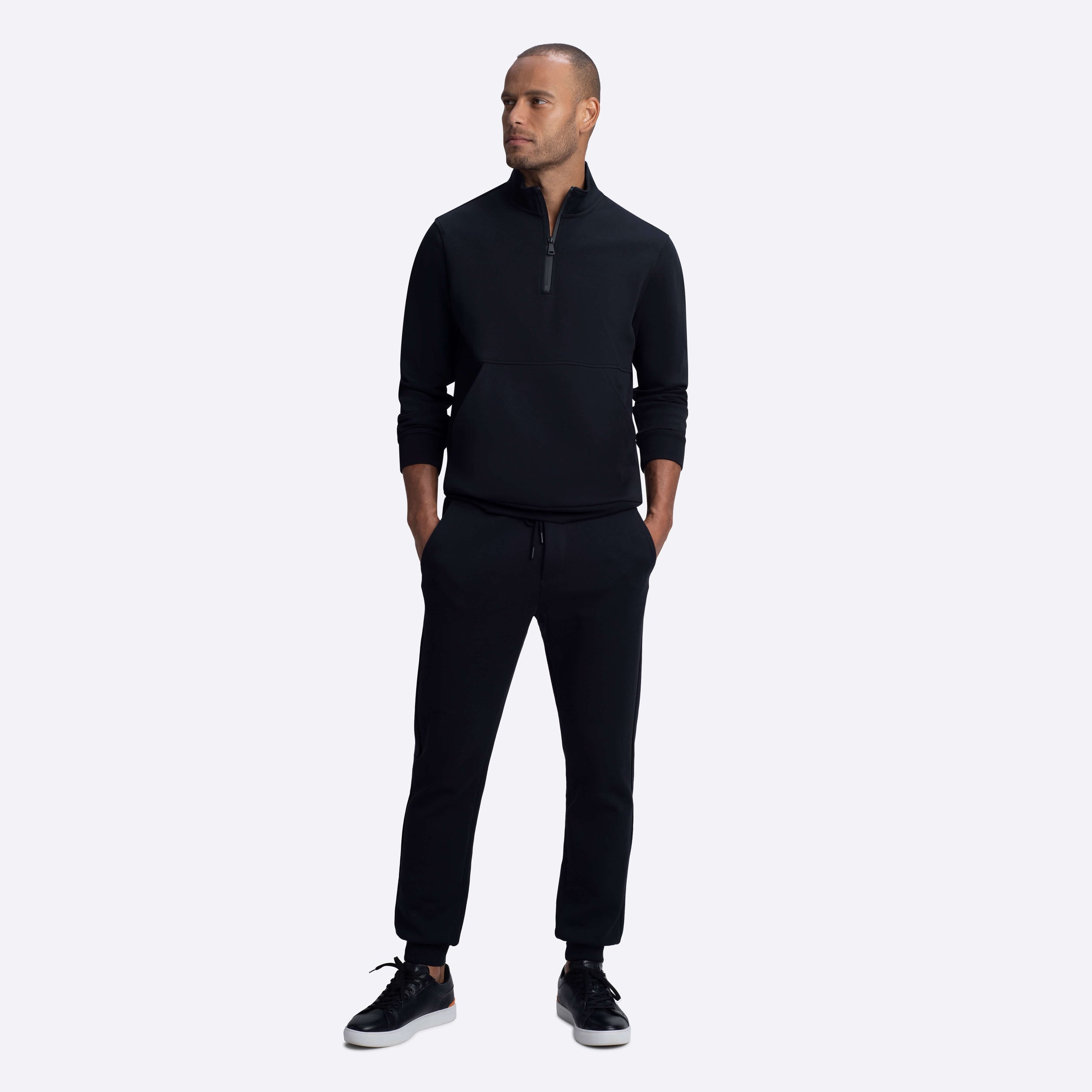 Long sleeve knit sweatshirt in COMFORT cotton blend features quarter zip closure, mock neck, zip pockets and closed cuffs and hem.