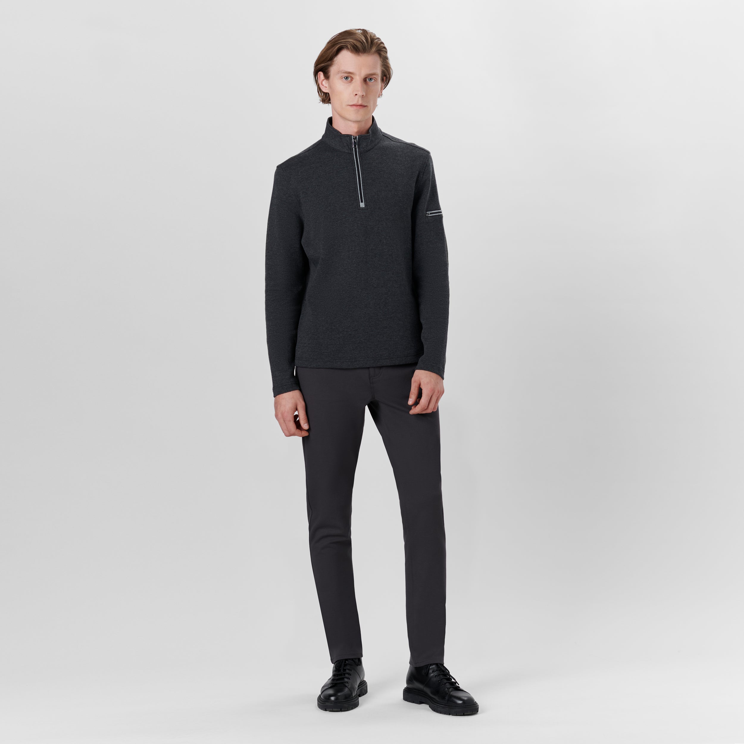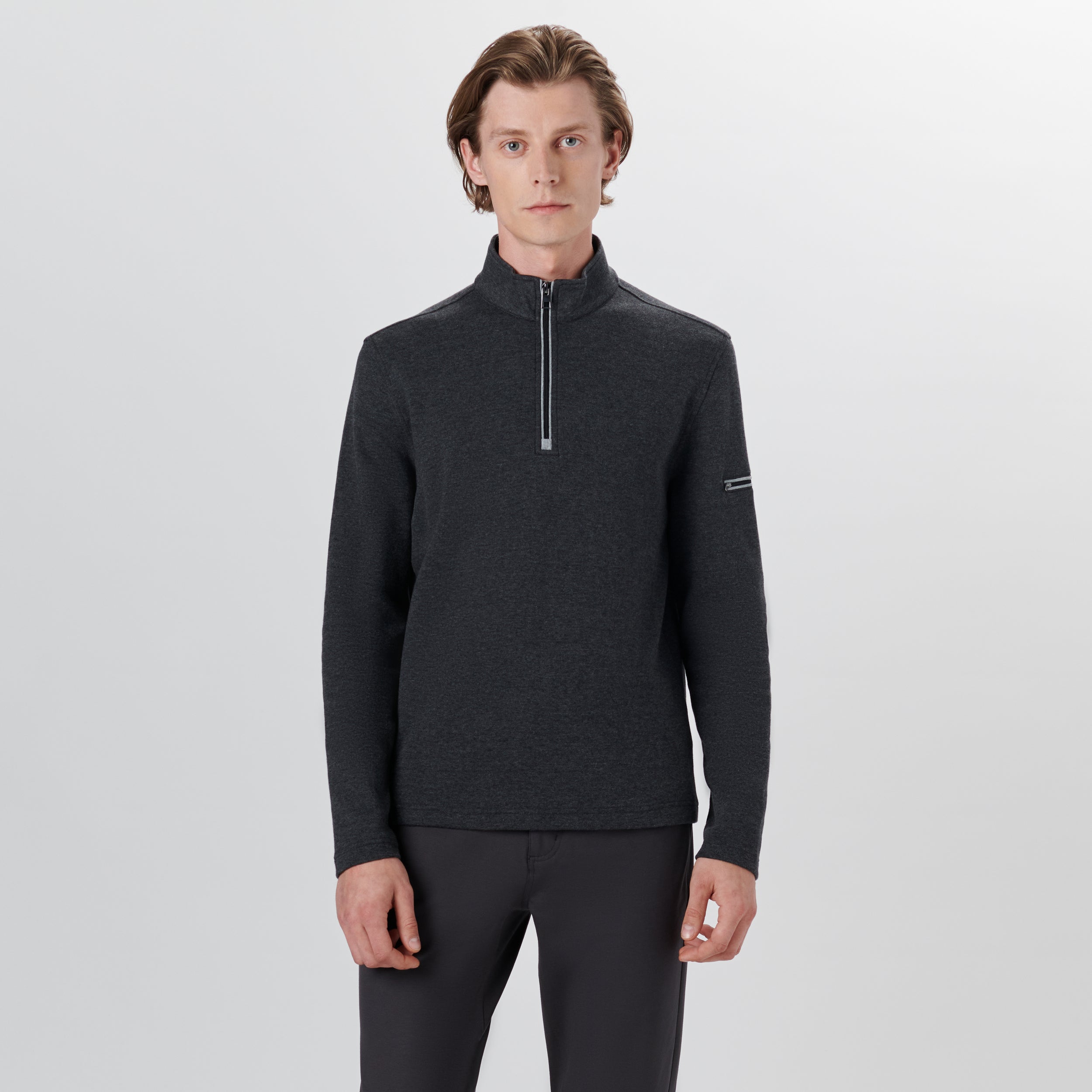 Long sleeve sweatshirt in heather cotton blend with quarter zip closure, sleeve pocket, and open cuff and hem.
