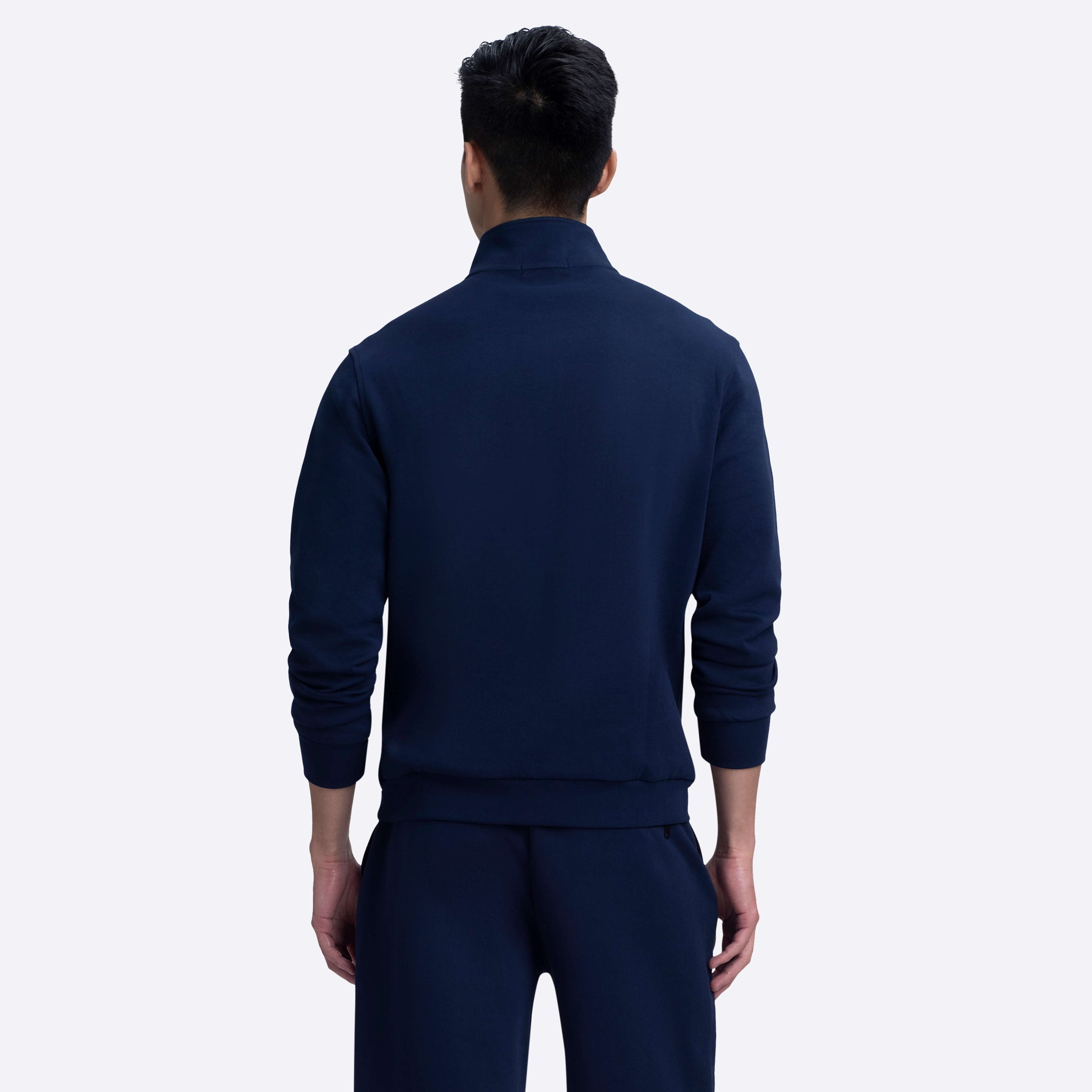 Long sleeve knit sweatshirt in COMFORT cotton blend features quarter zip closure, mock neck, zip pockets and closed cuffs and hem.