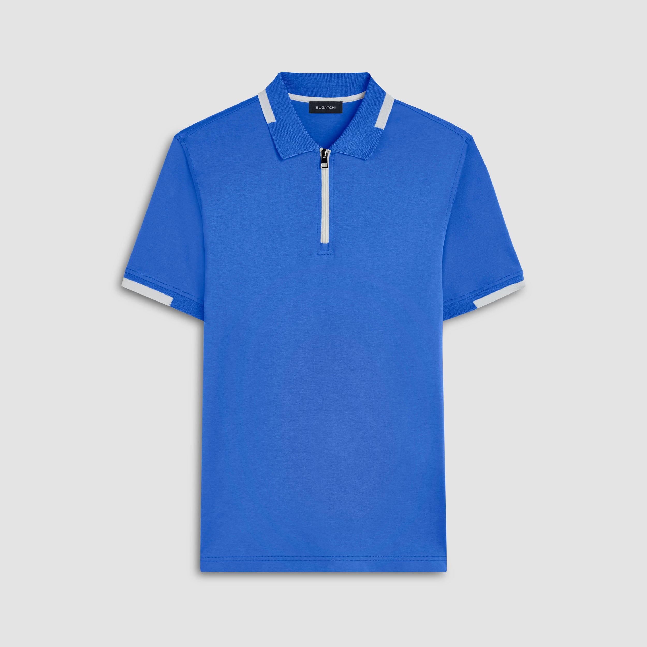 Solid short-sleeved polo shirt in 100% pima cotton with contrast quarter zip placket and rib knit collar and armbands with contrast detail.