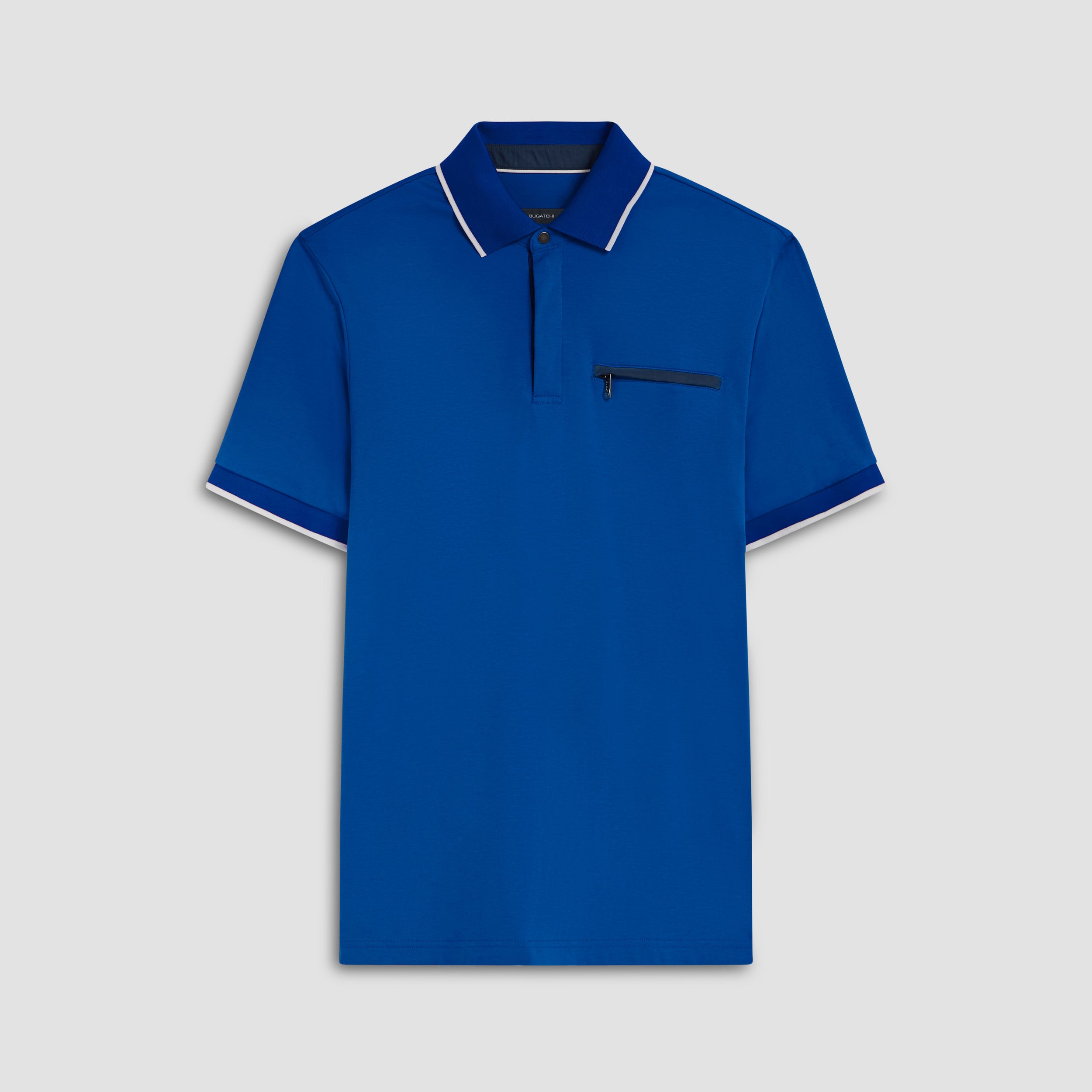 Solid short-sleeved polo shirt in 100% pima cotton with a quarter zip covered placket, zipper chest pocket, contrast stripe tipped rib knit collar and armbands and contrast nylon trim detail.