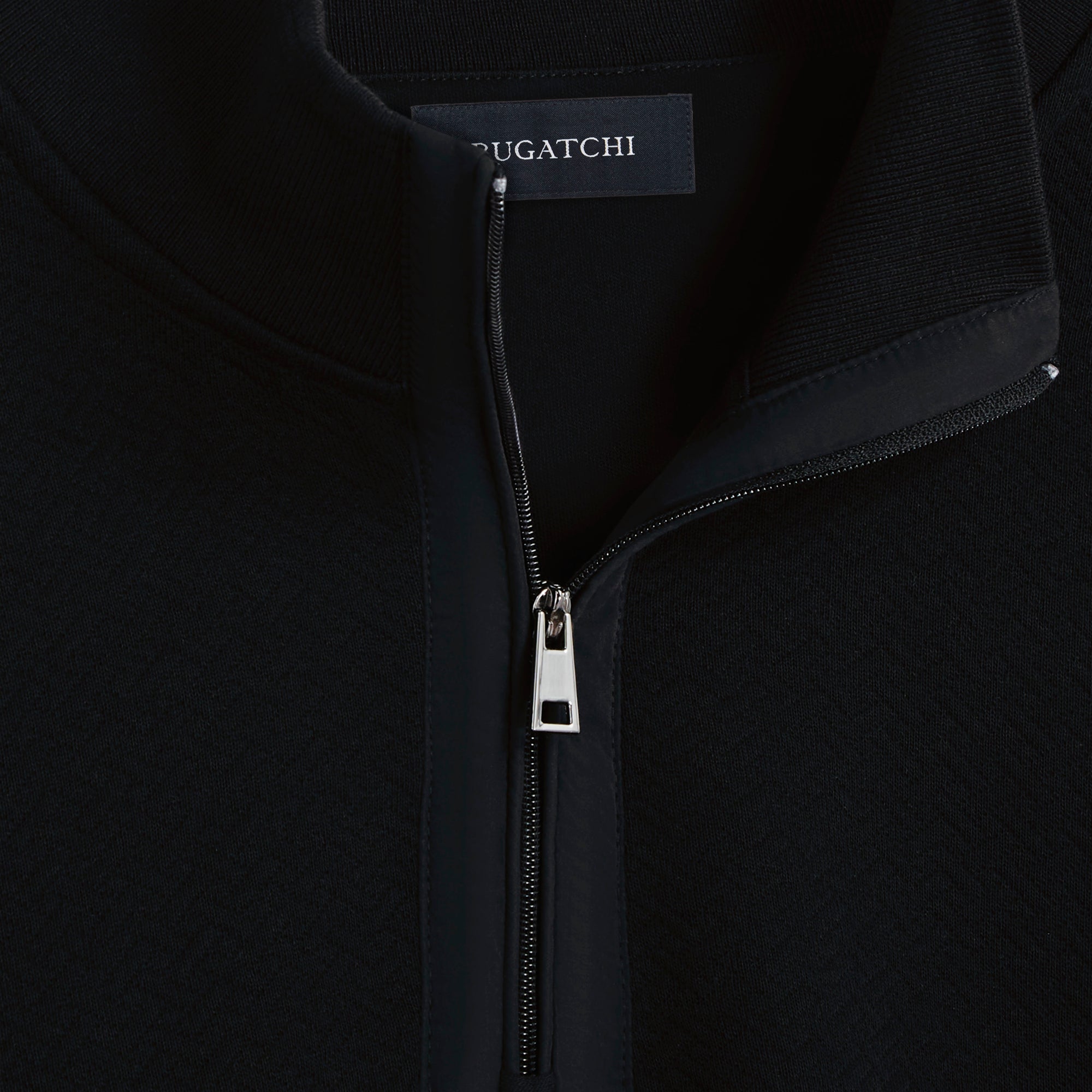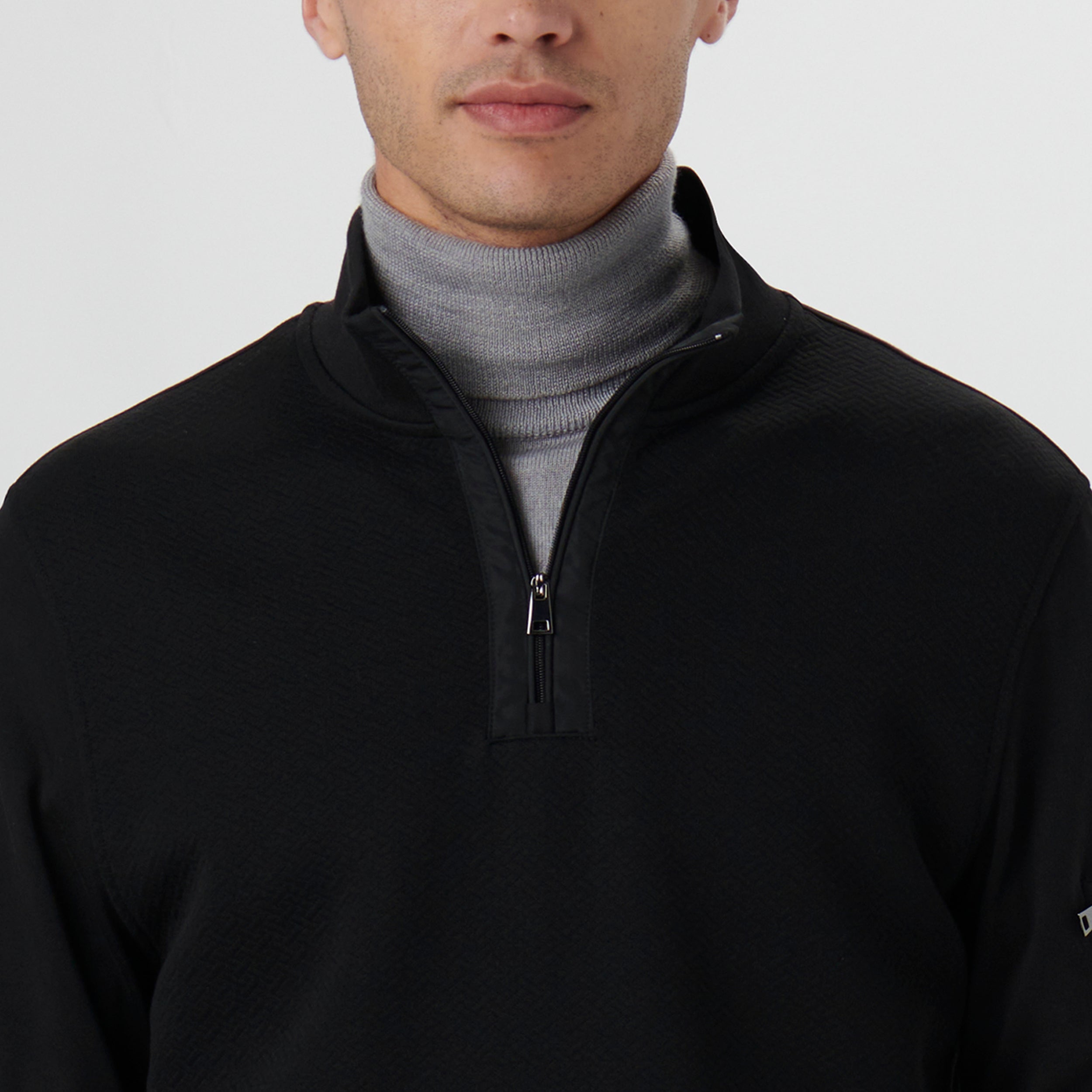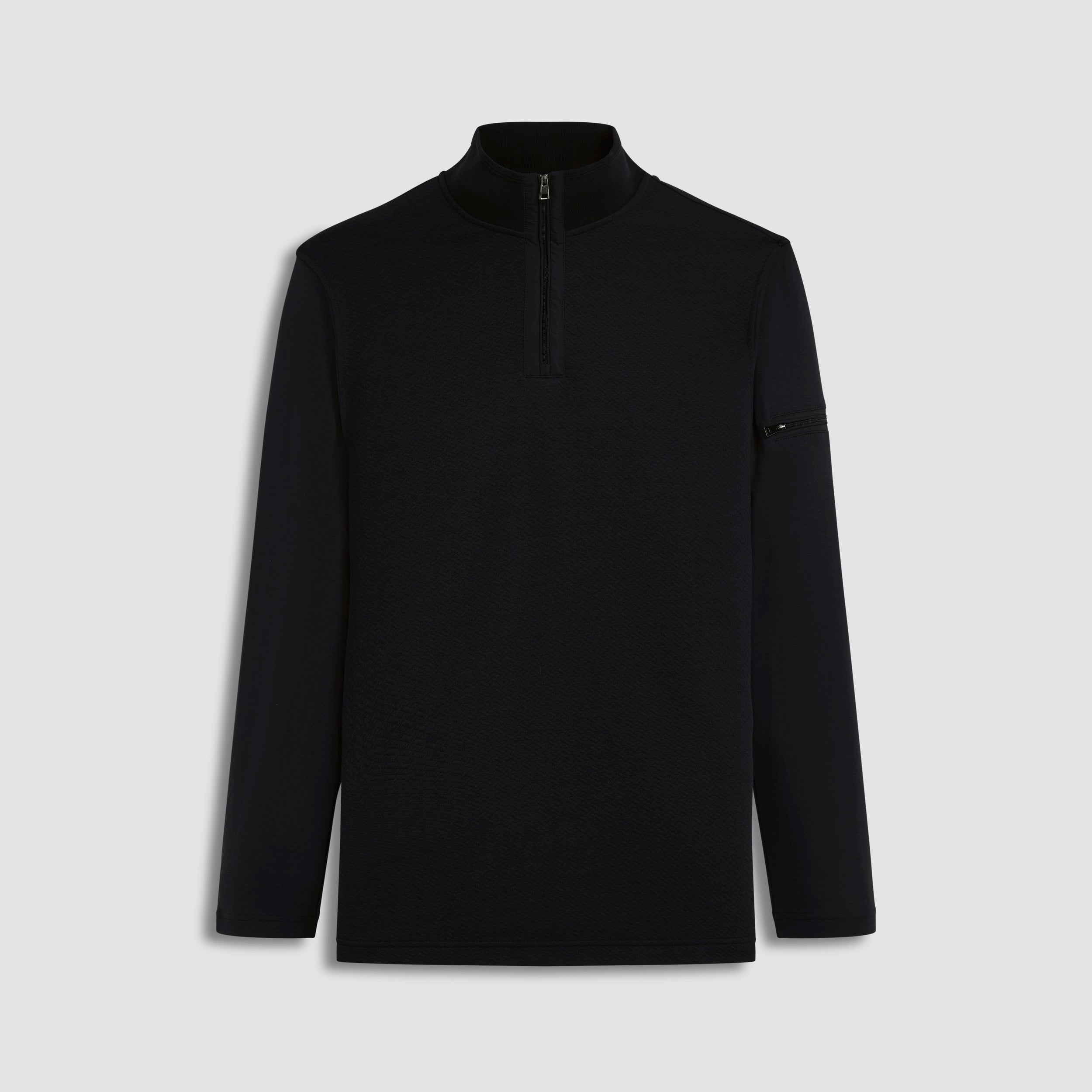 Solid long-sleeved pullover in cotton blend with jacquard front, mock neck, quarter zipper closure, nylon trim detail and zippered sleeve and back pockets.