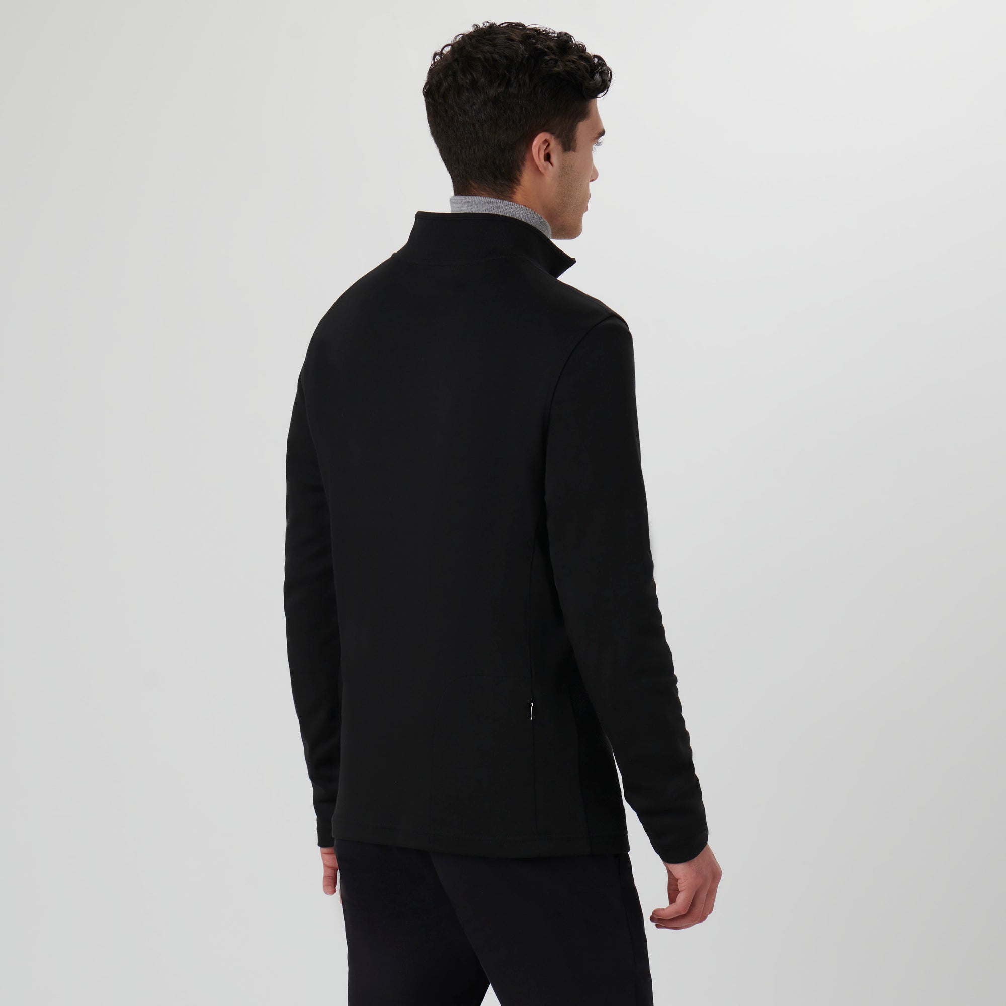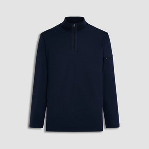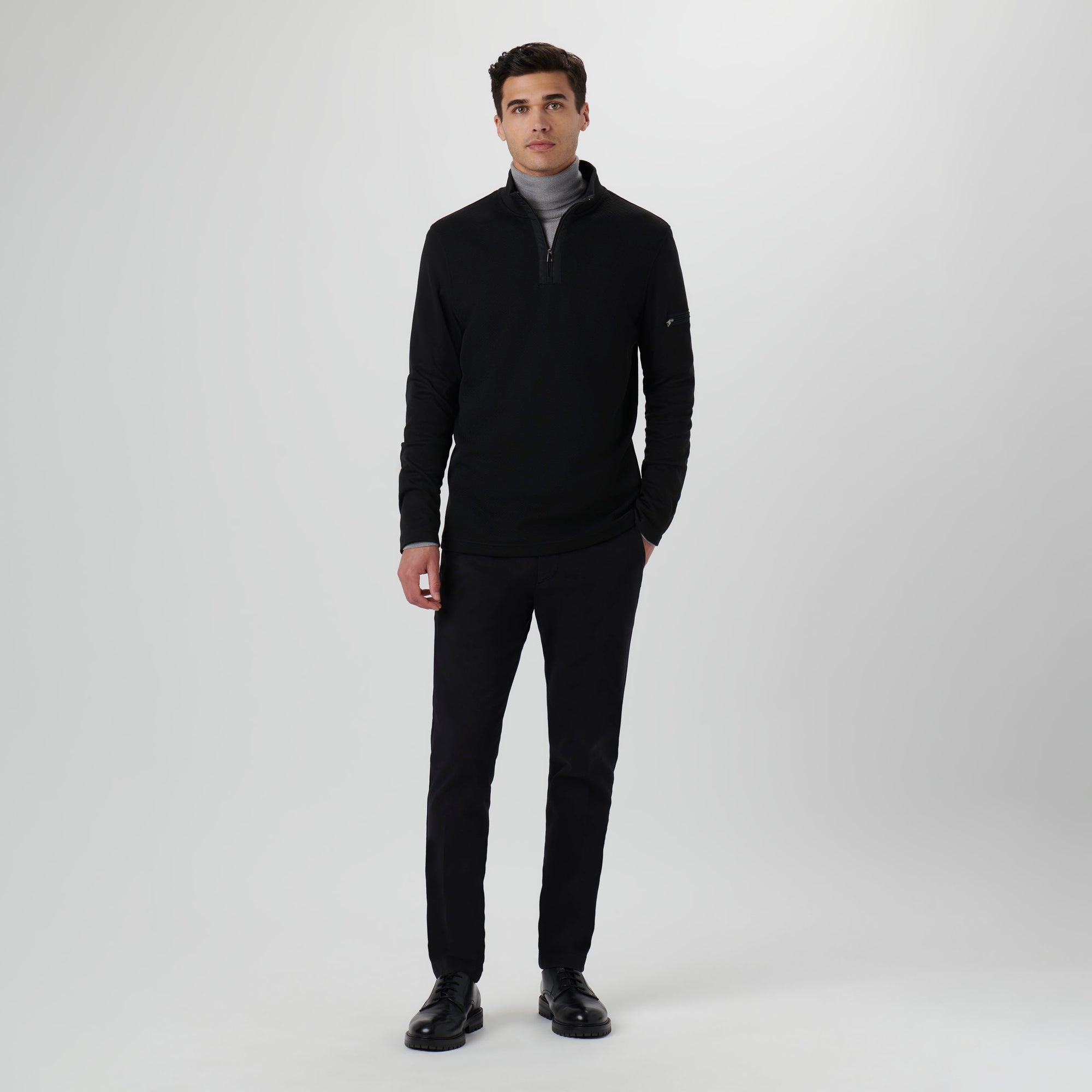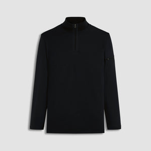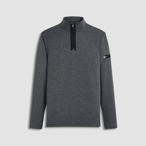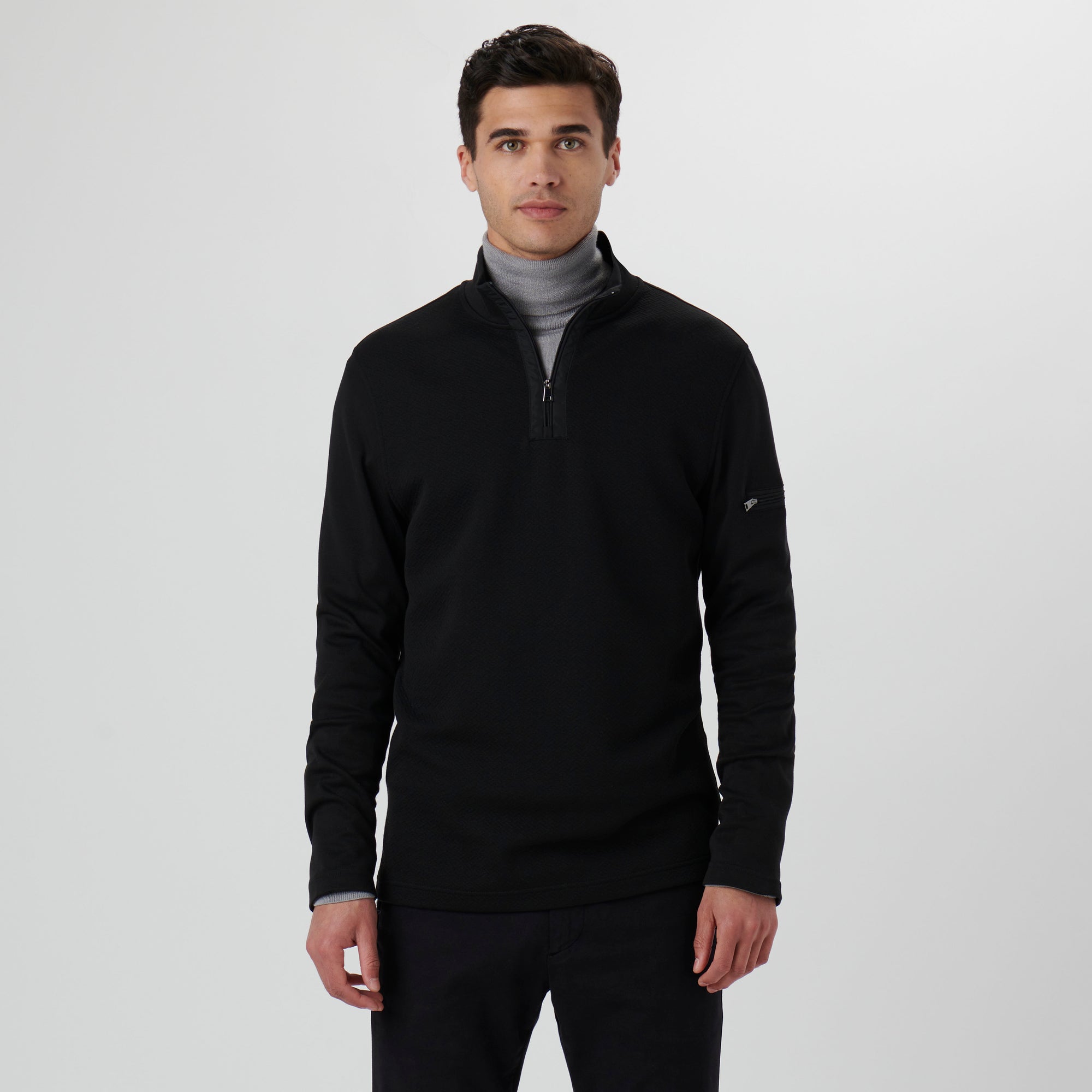 Solid long-sleeved pullover in cotton blend with jacquard front, mock neck, quarter zipper closure, nylon trim detail and zippered sleeve and back pockets.