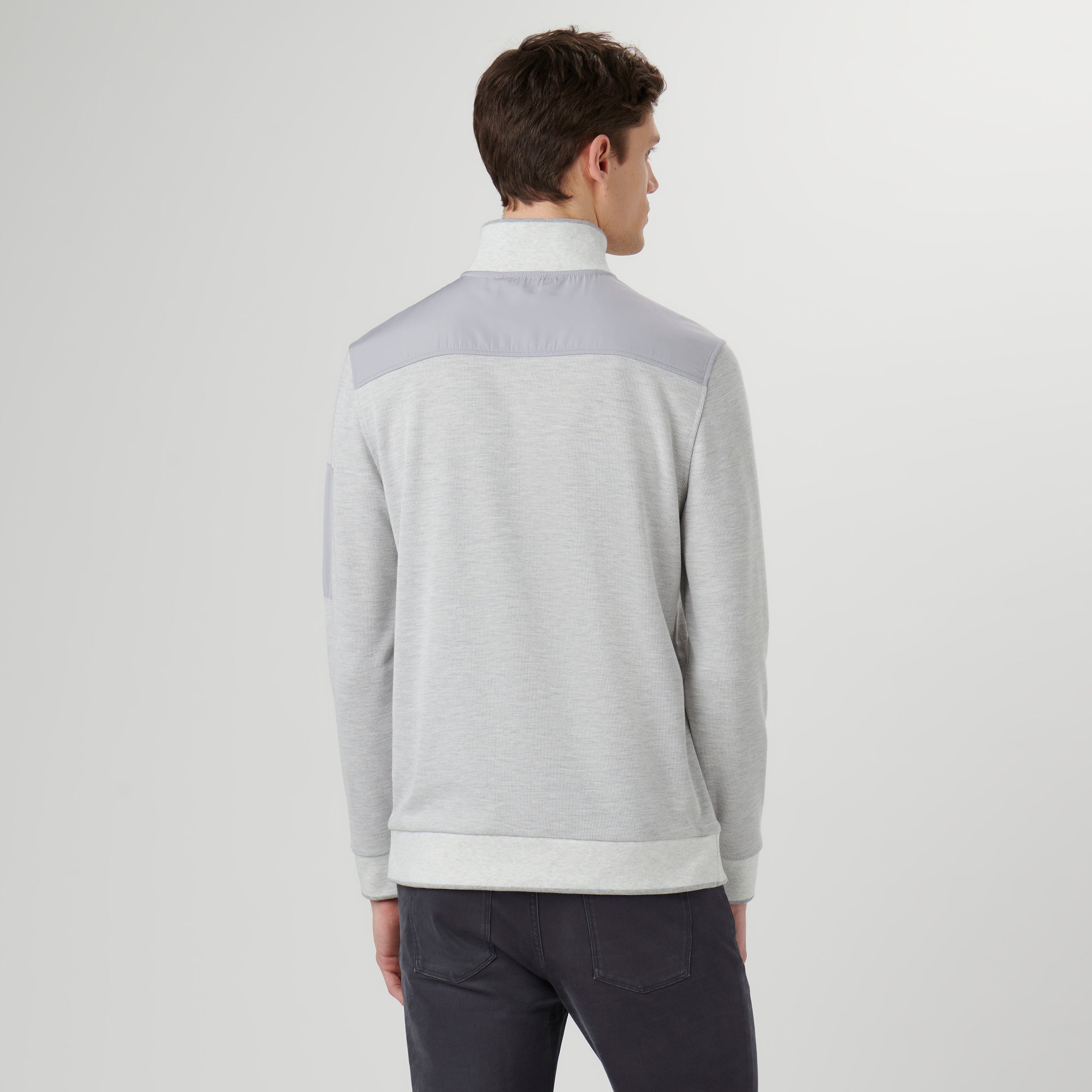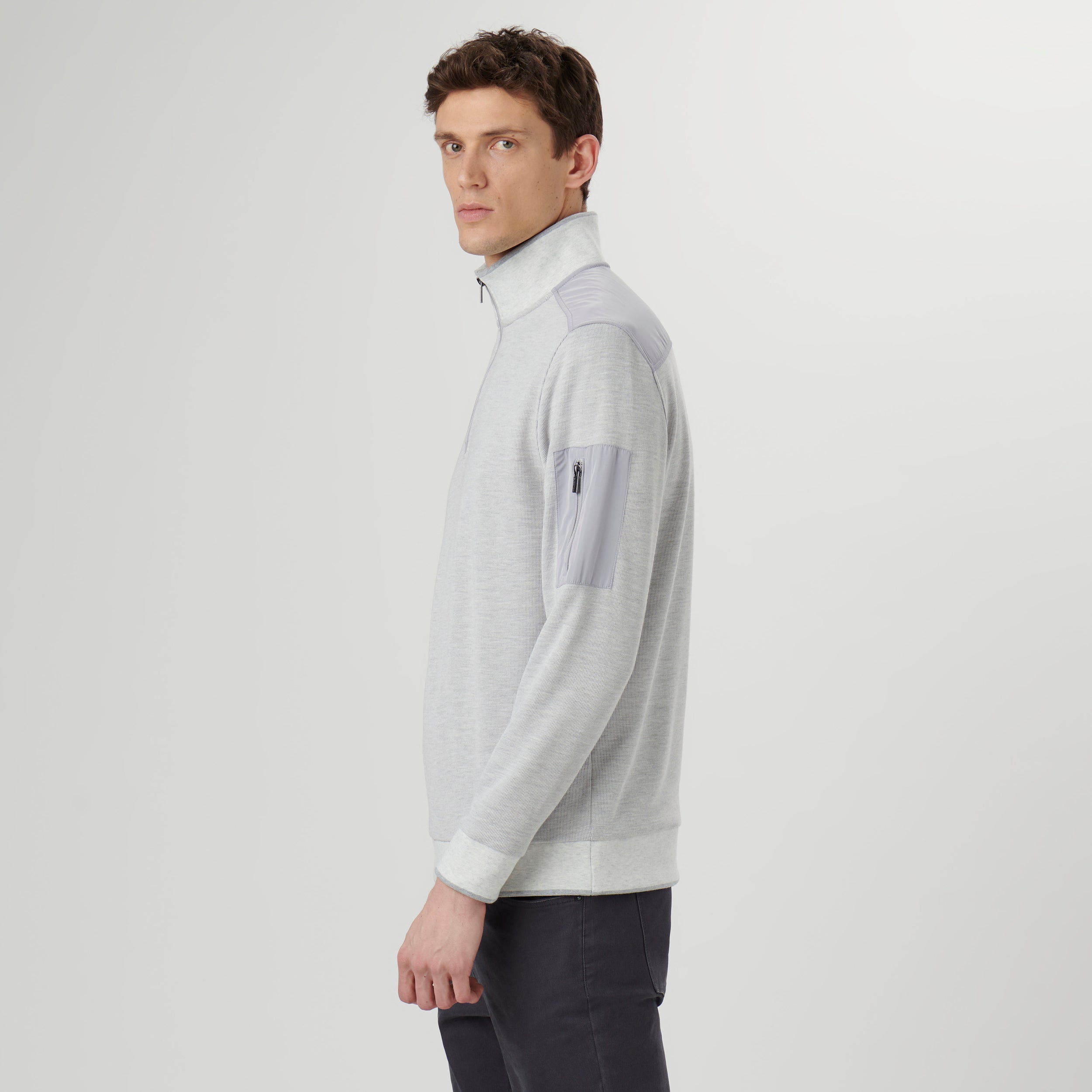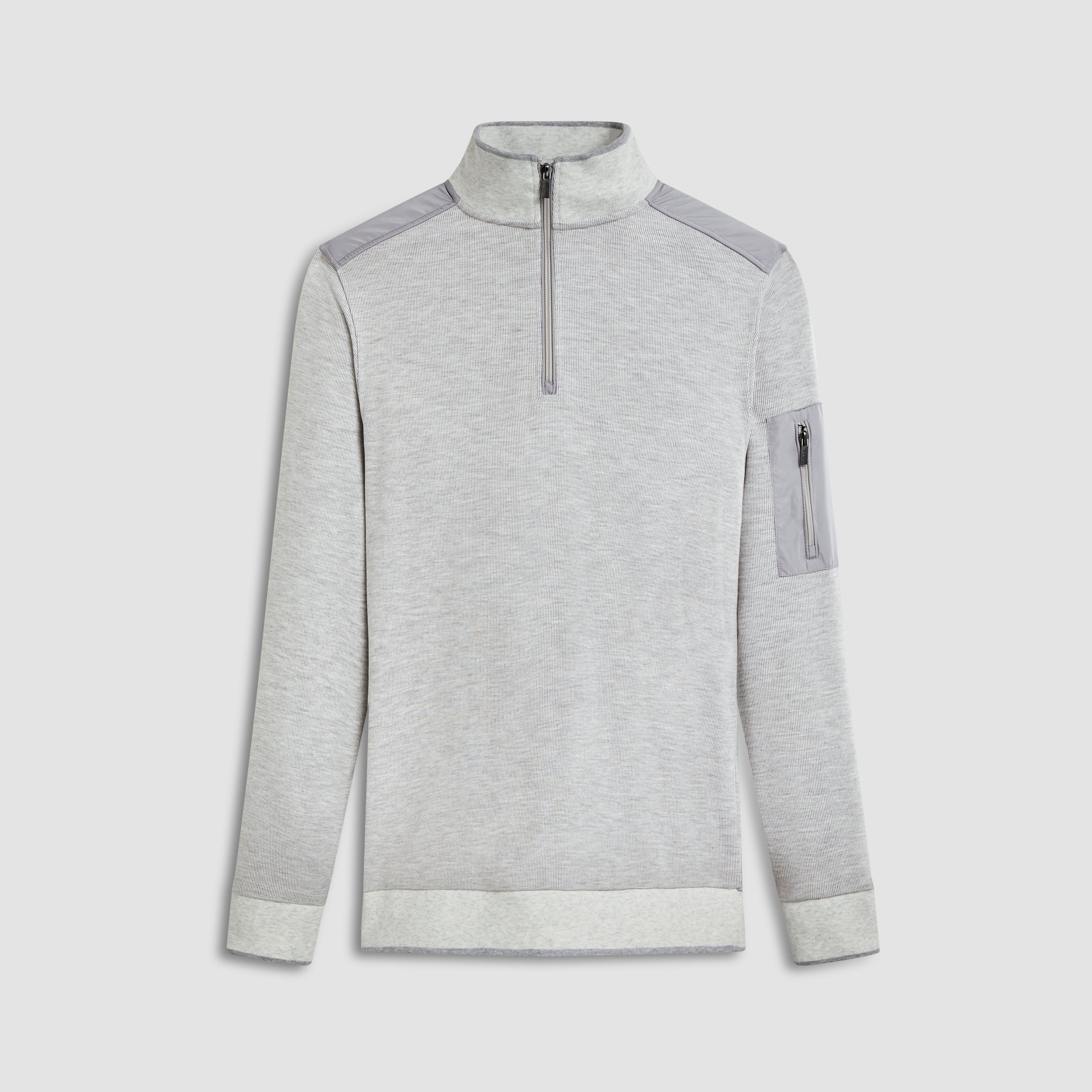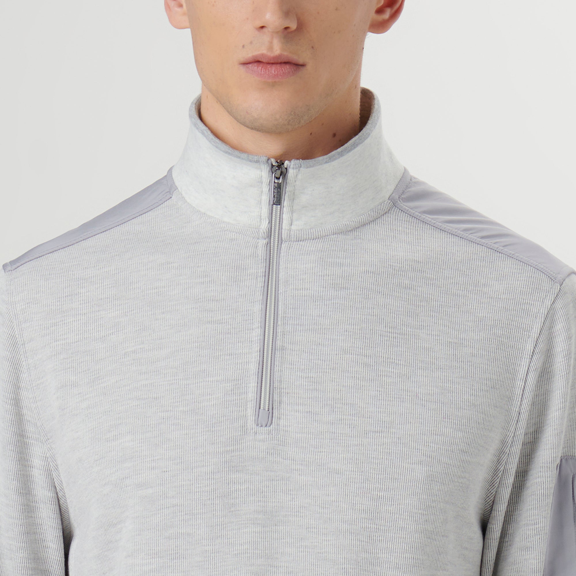 Solid long-sleeved pullover with mock neck, quarter zipper closure, nylon trim detail, zippered sleeve pocket and rib knit collar, cuffs and waistband.