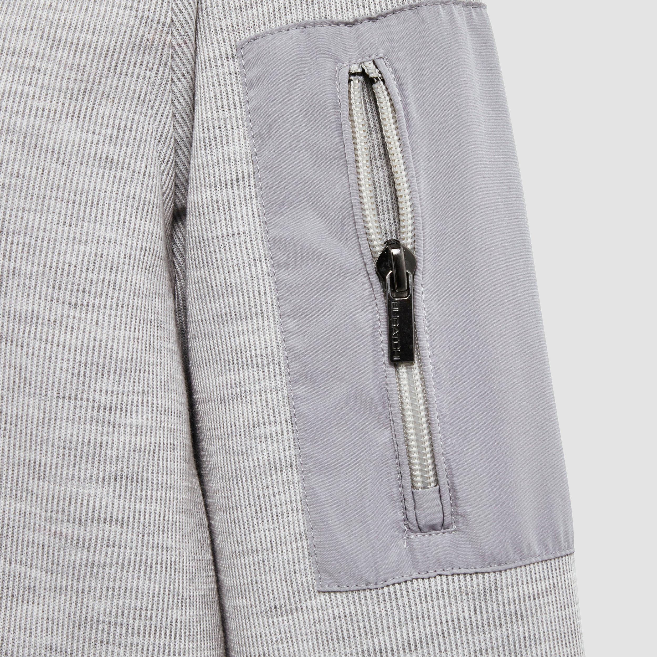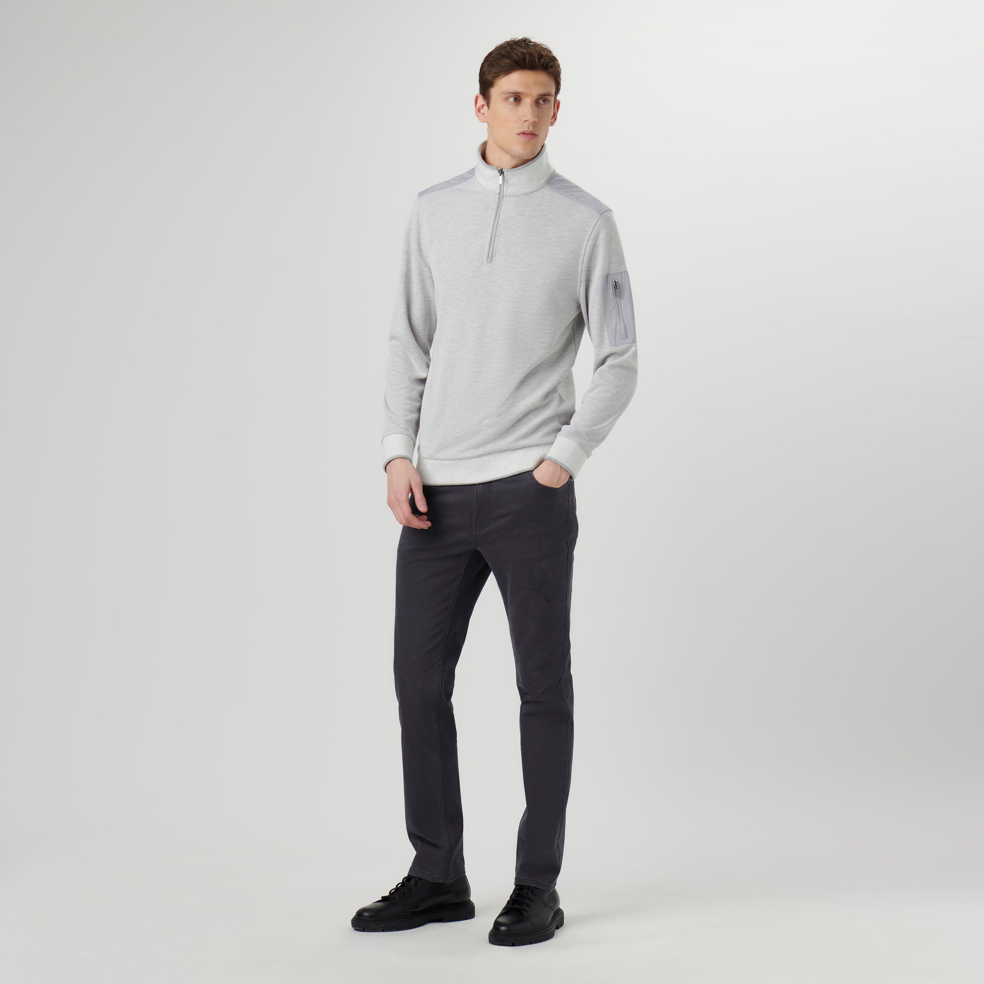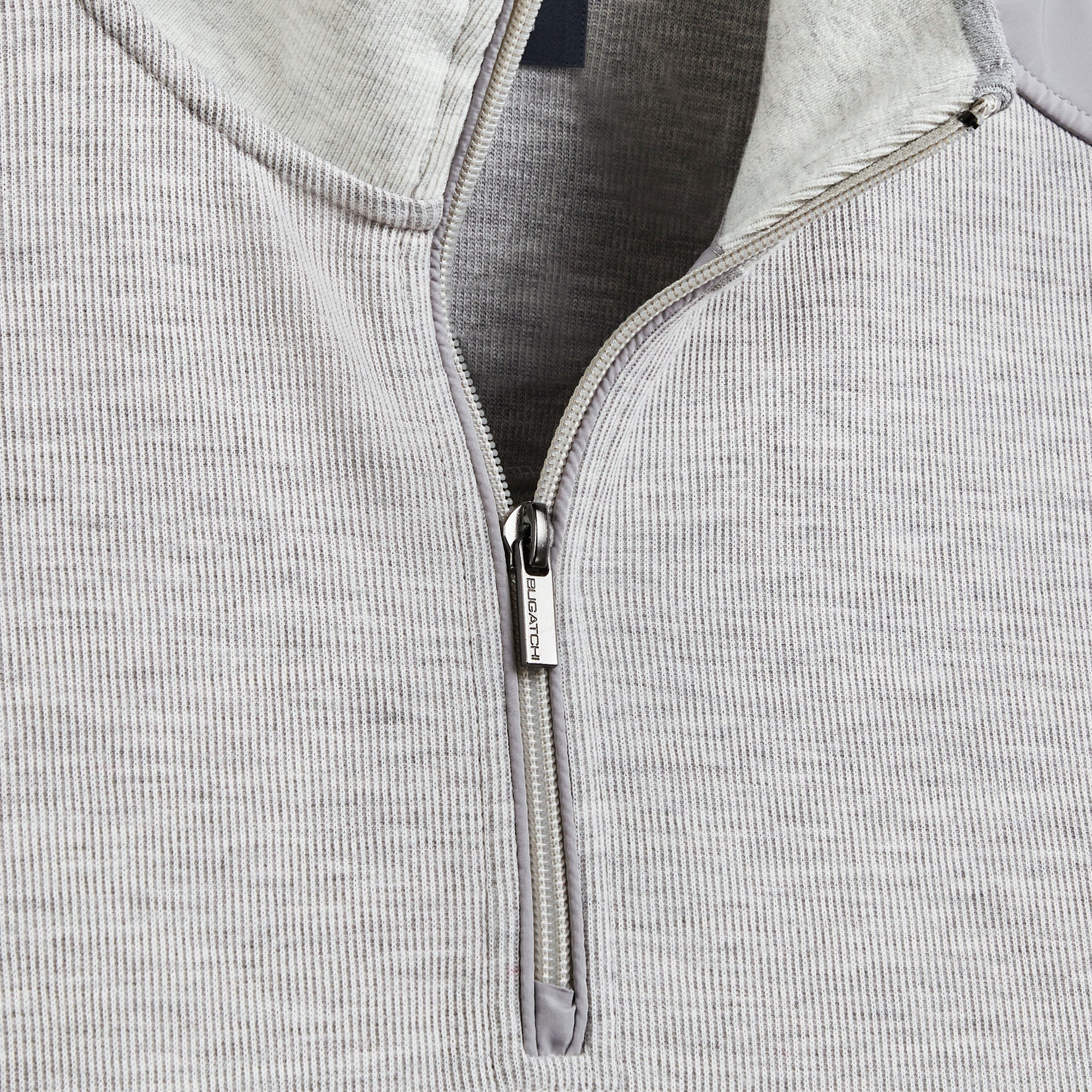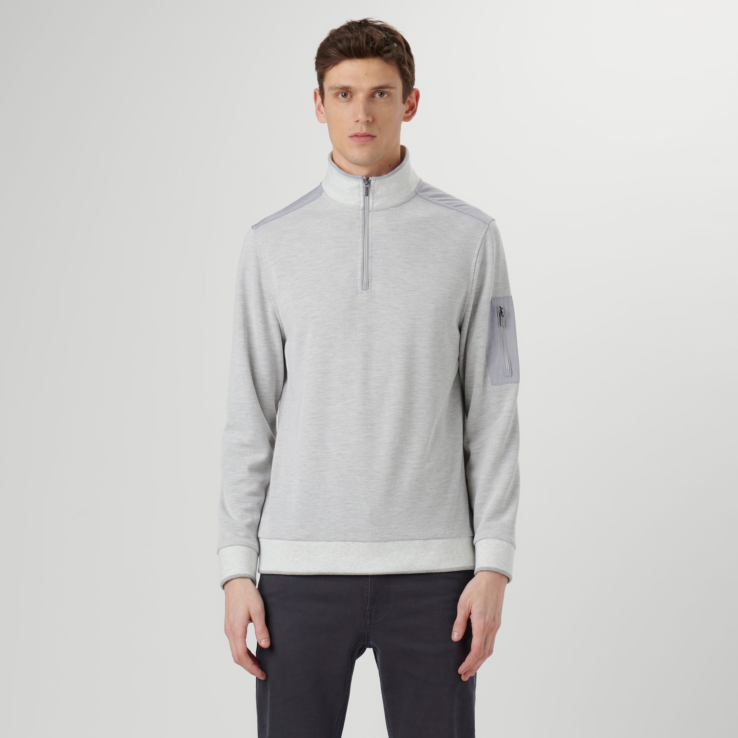 Solid long-sleeved pullover with mock neck, quarter zipper closure, nylon trim detail, zippered sleeve pocket and rib knit collar, cuffs and waistband.